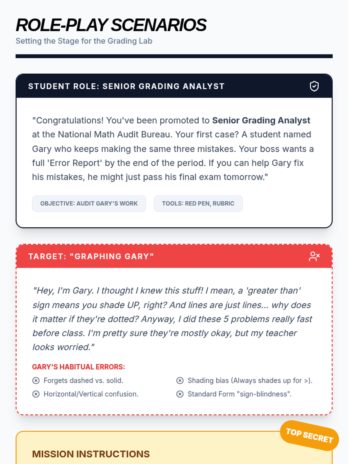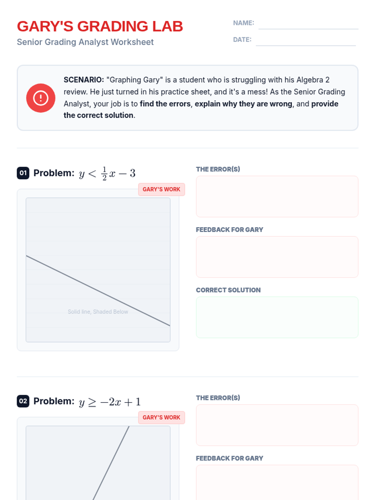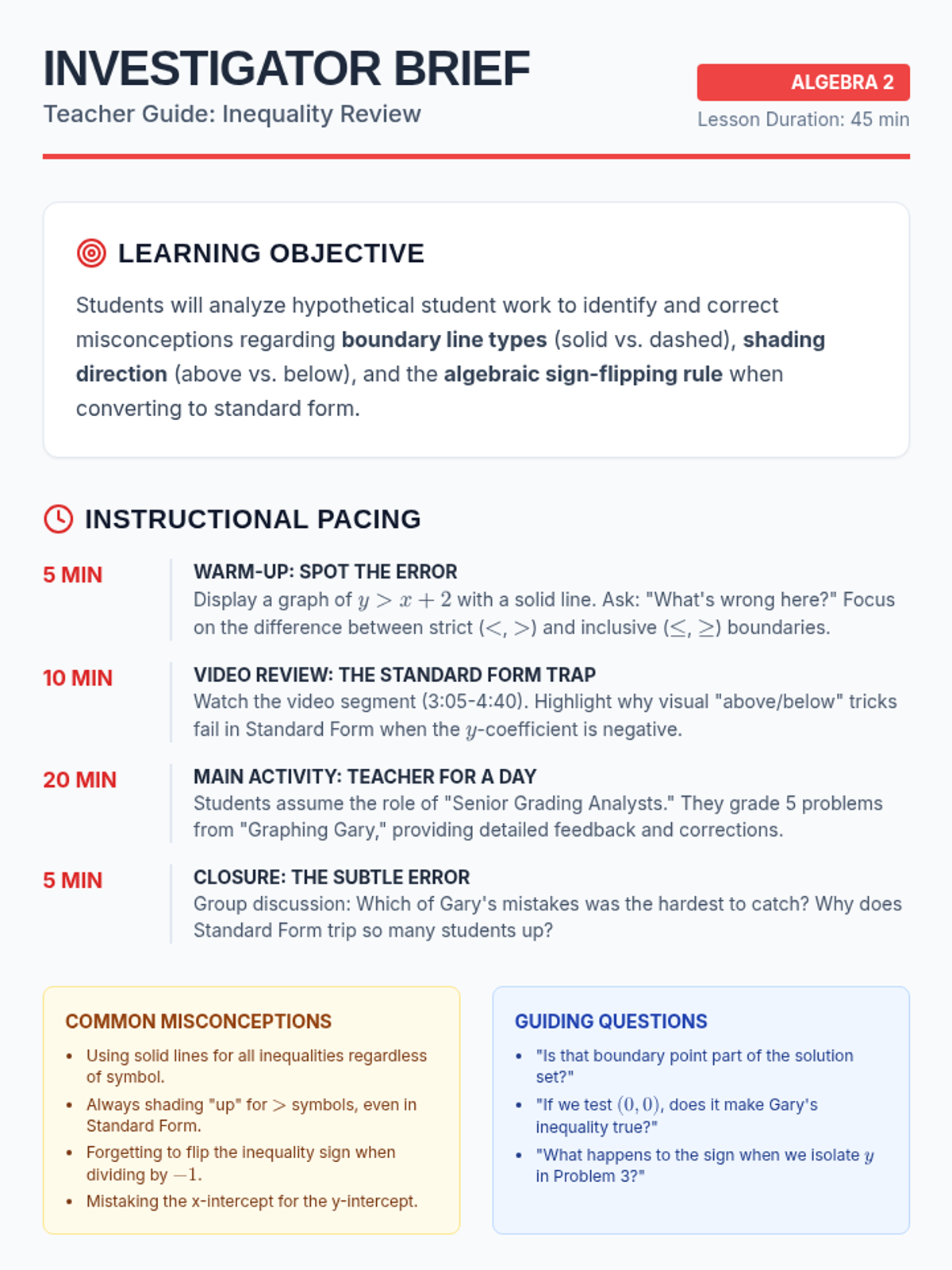 A 10th-grade Algebra 2 review lesson focused on identifying and correcting common errors in graphing linear inequalities, specifically targeting boundary lines, shading regions, and the standard form sign-flip rule.