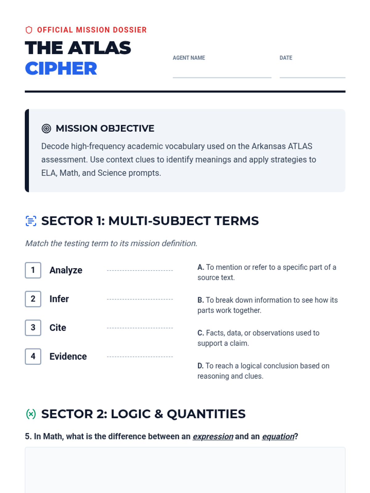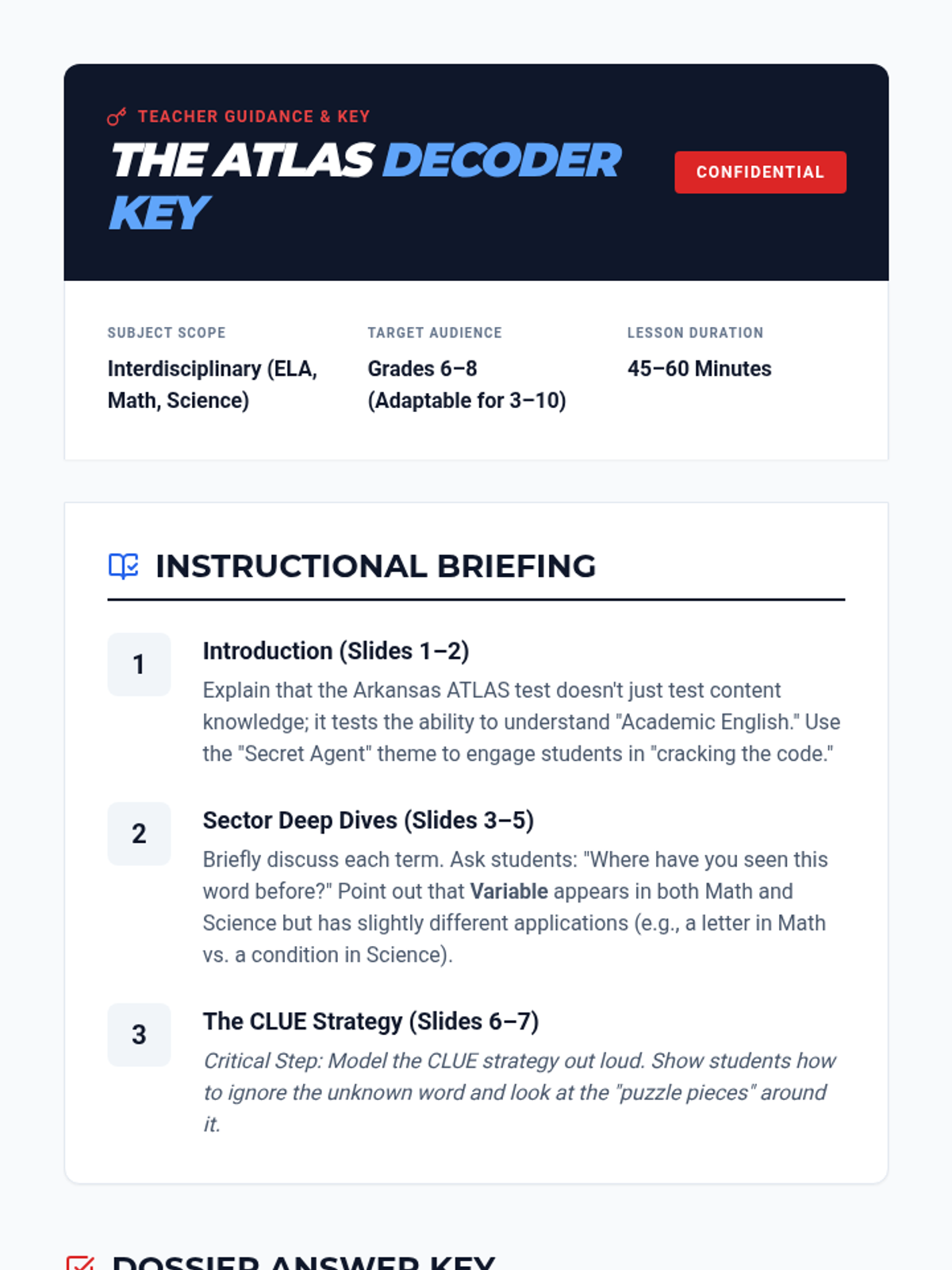 A comprehensive lesson focused on high-frequency academic vocabulary for the Arkansas ATLAS assessment, covering ELA, Math, and Science terms with context clue strategies.