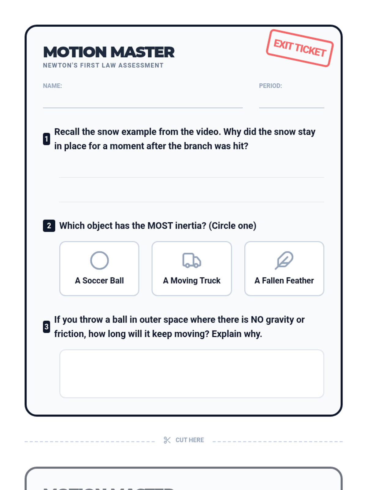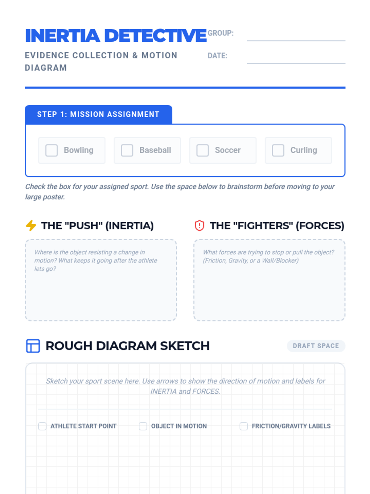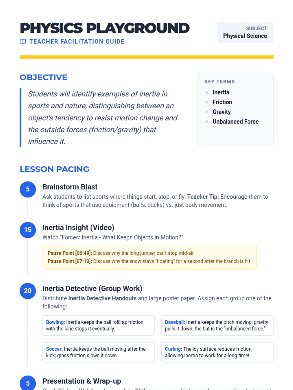 An interactive exploration of Newton's First Law through sports and nature. Students analyze how inertia keeps objects moving and how outside forces change that motion.