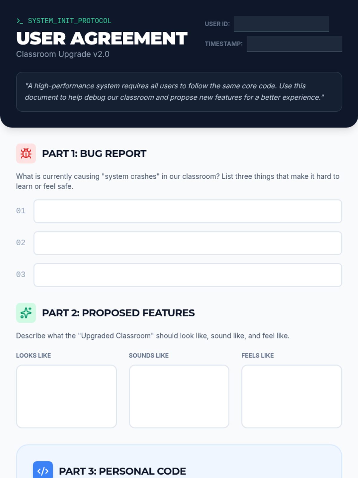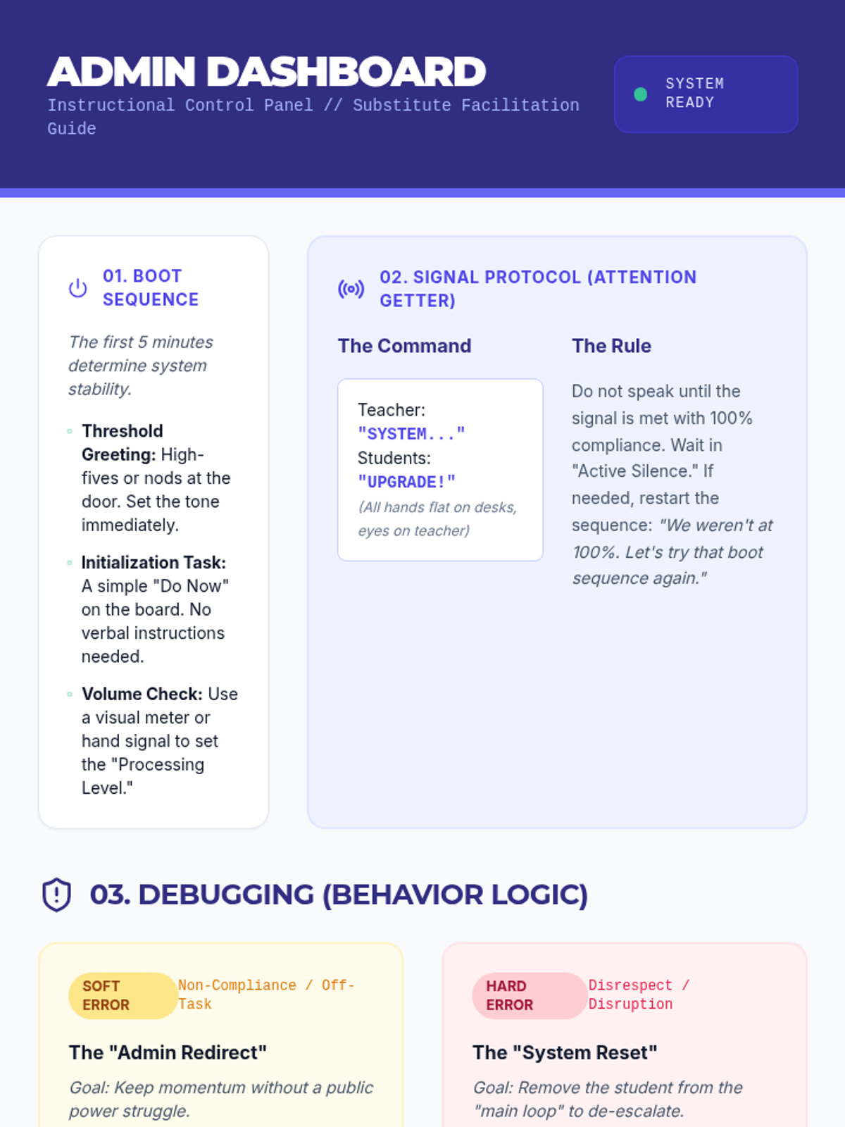 A comprehensive 'classroom reset' lesson designed to help a substitute and their students build a positive culture through the metaphor of a system upgrade. Students collaborate to define norms and understand their role in the classroom community.