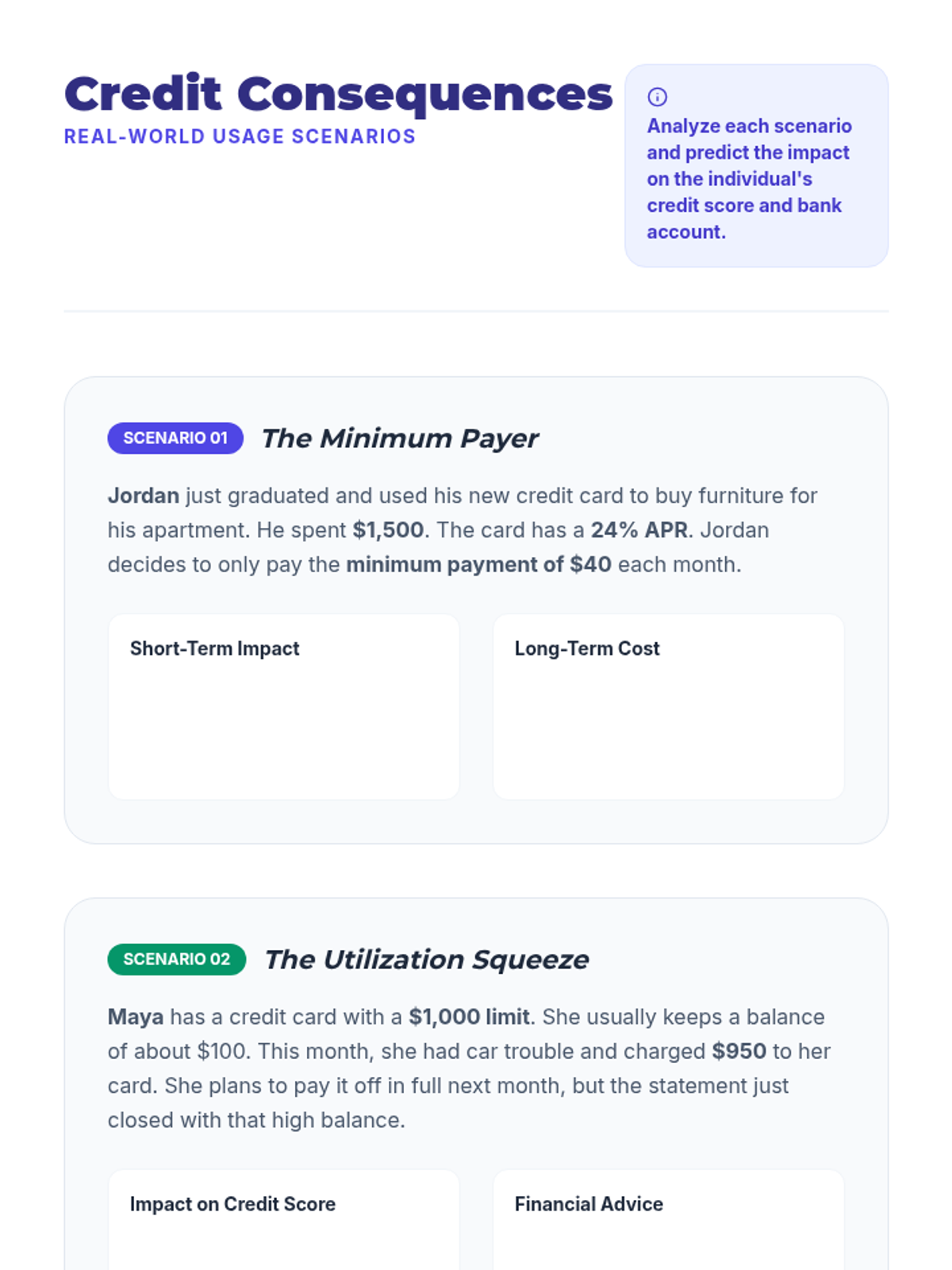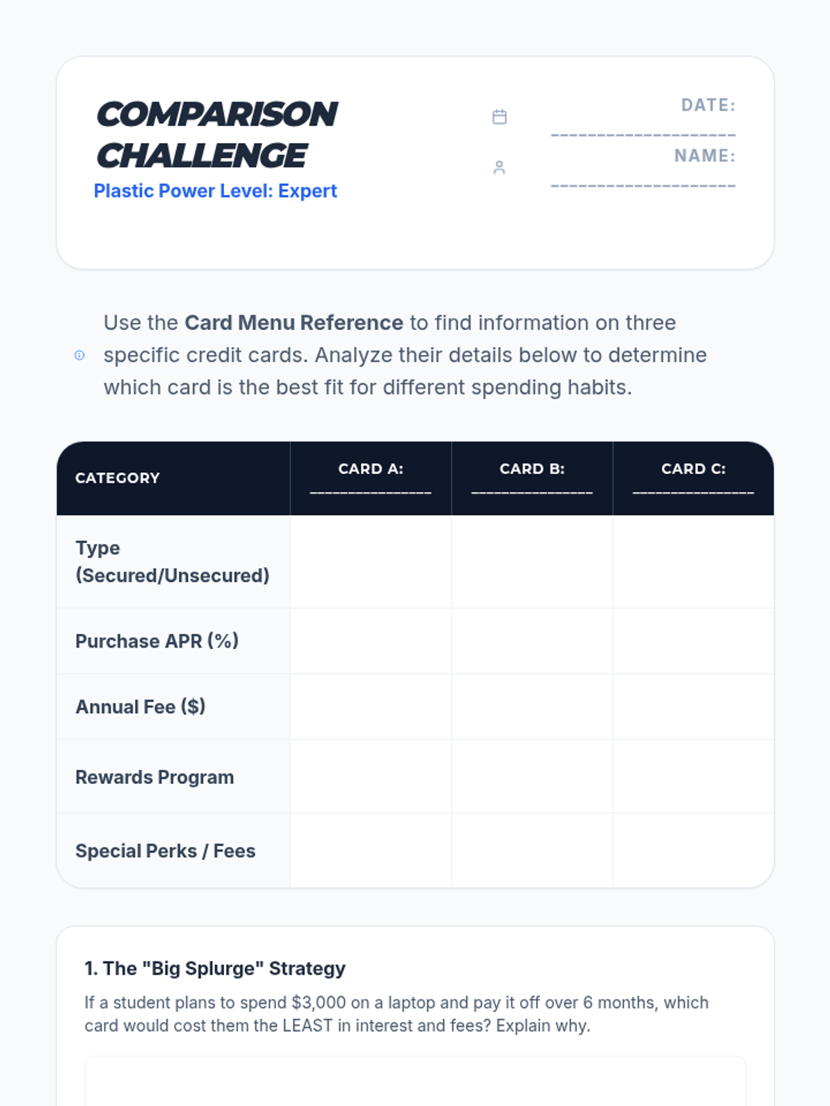Students will learn to evaluate and compare different credit card options, understand the implications of card terms, and practice responsible credit management through scenarios and research.