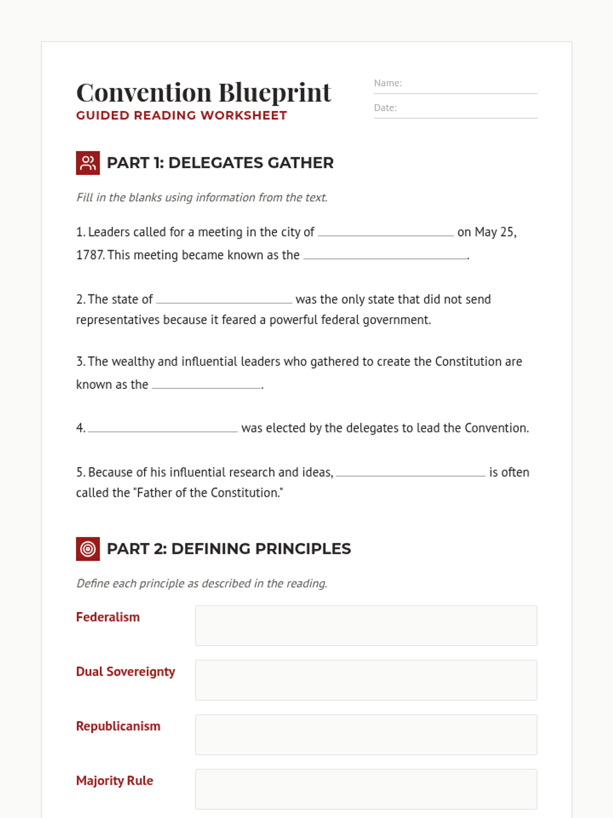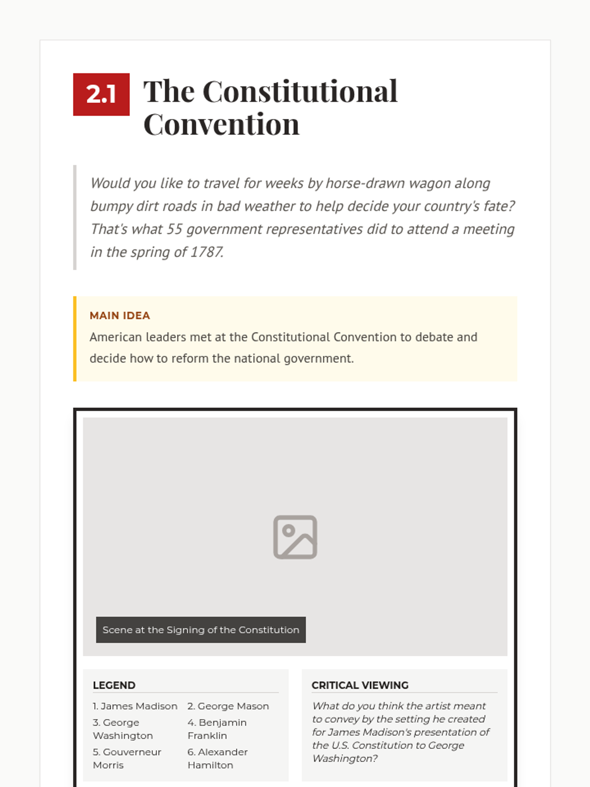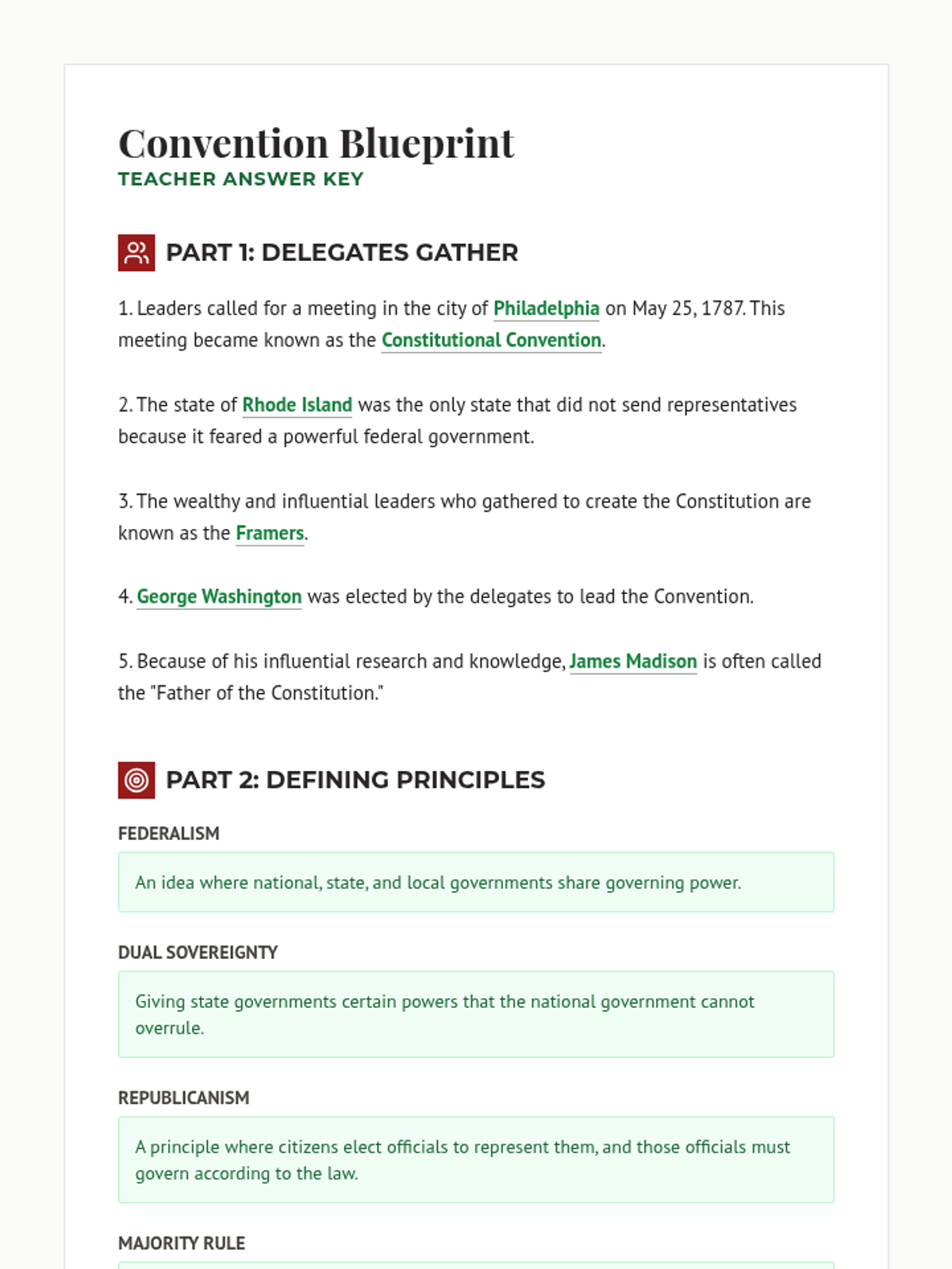 A lesson exploring the 1787 Constitutional Convention, the roles of key Framers like James Madison, and the fundamental principles of American government including federalism, republicanism, and separation of powers.
