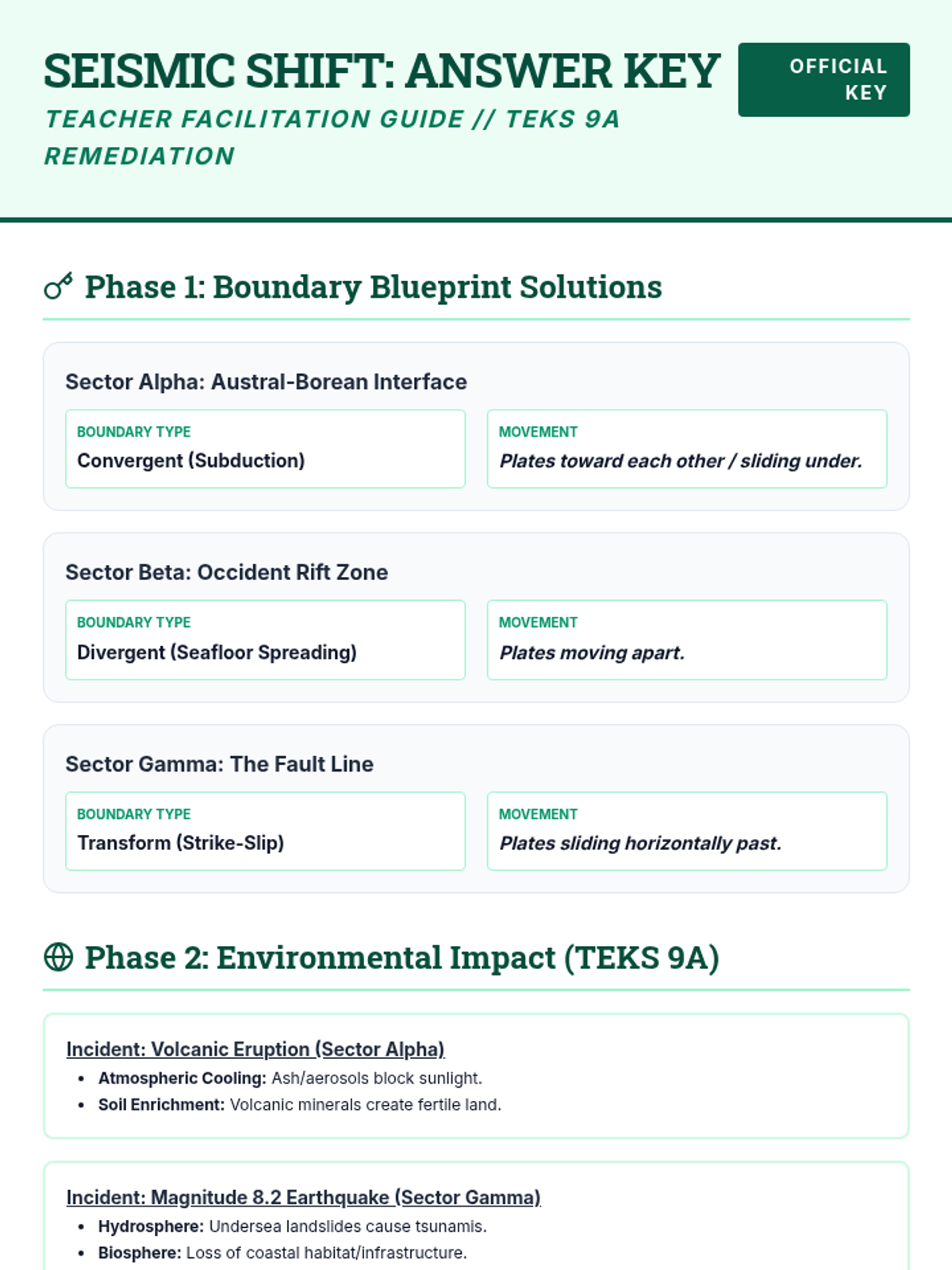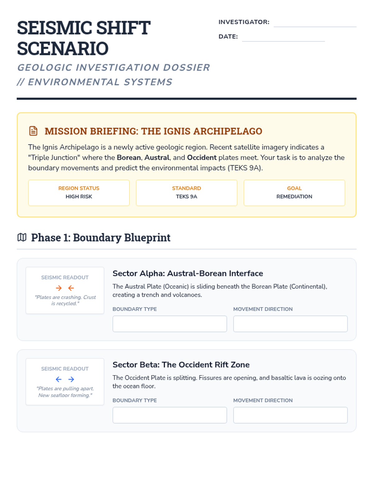 A remediation-focused lesson designed for 11th and 12th-grade Environmental Science students to master plate tectonics and their environmental impacts (TEKS 9A). Students analyze a complex geologic scenario, identify plate boundaries, and evaluate the resulting environmental consequences of earthquakes and volcanic eruptions.