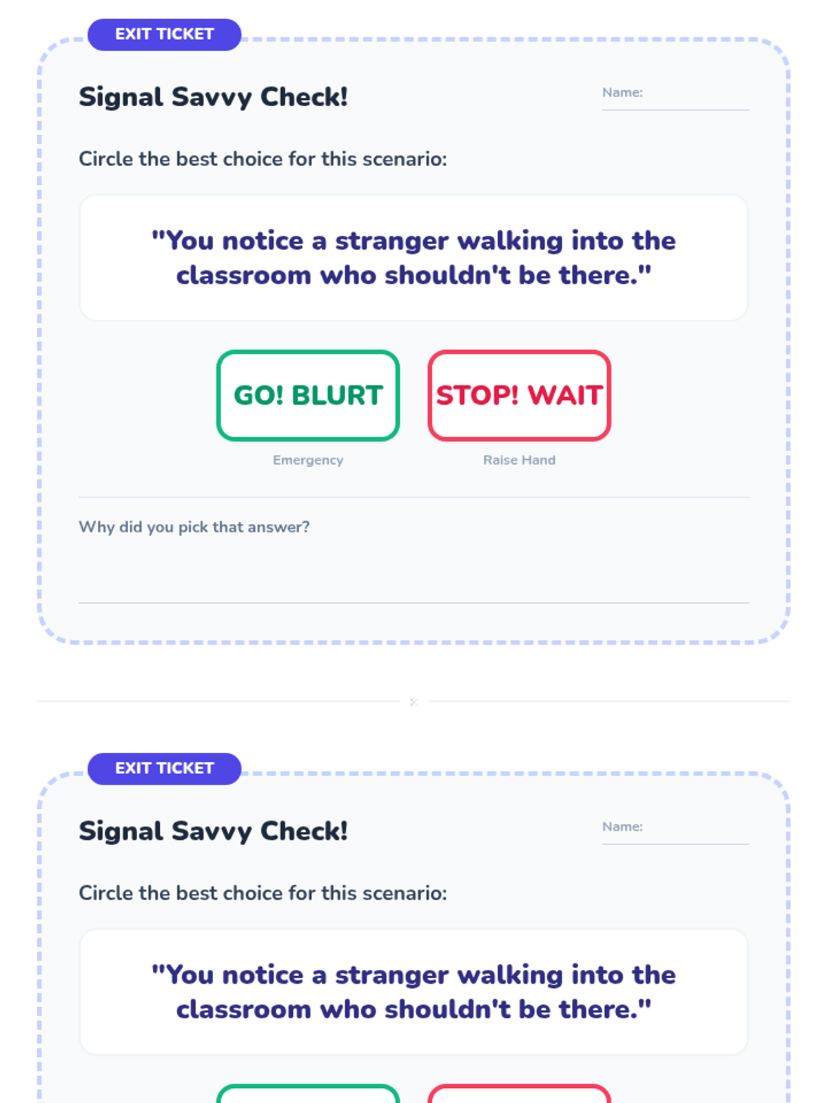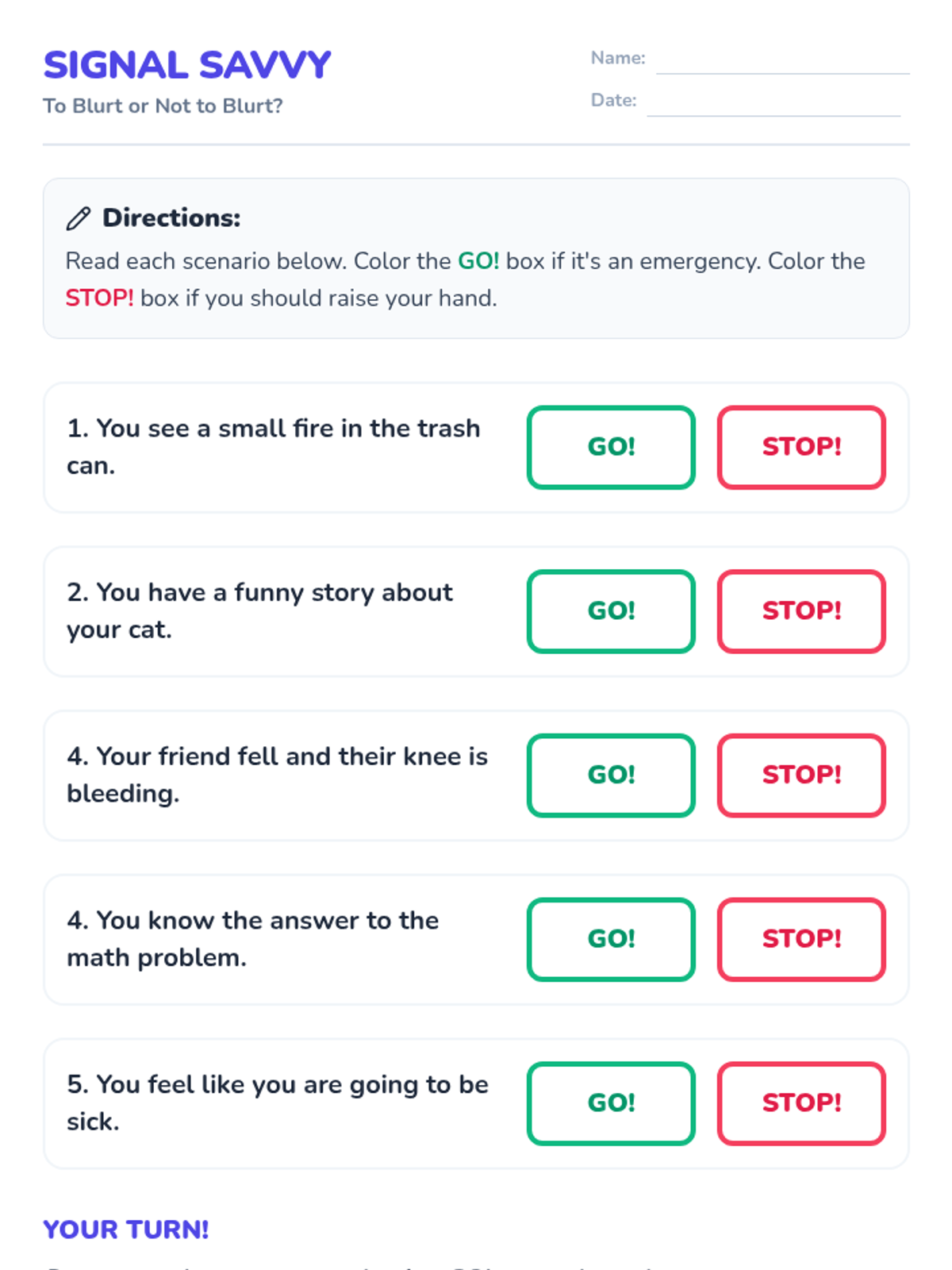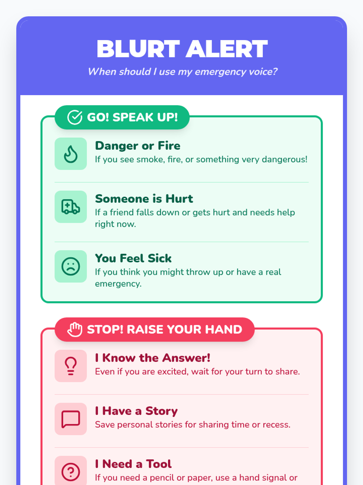 A lesson designed to help 2nd-grade students understand the difference between emergencies that require immediate speaking and classroom moments that require raising a hand.