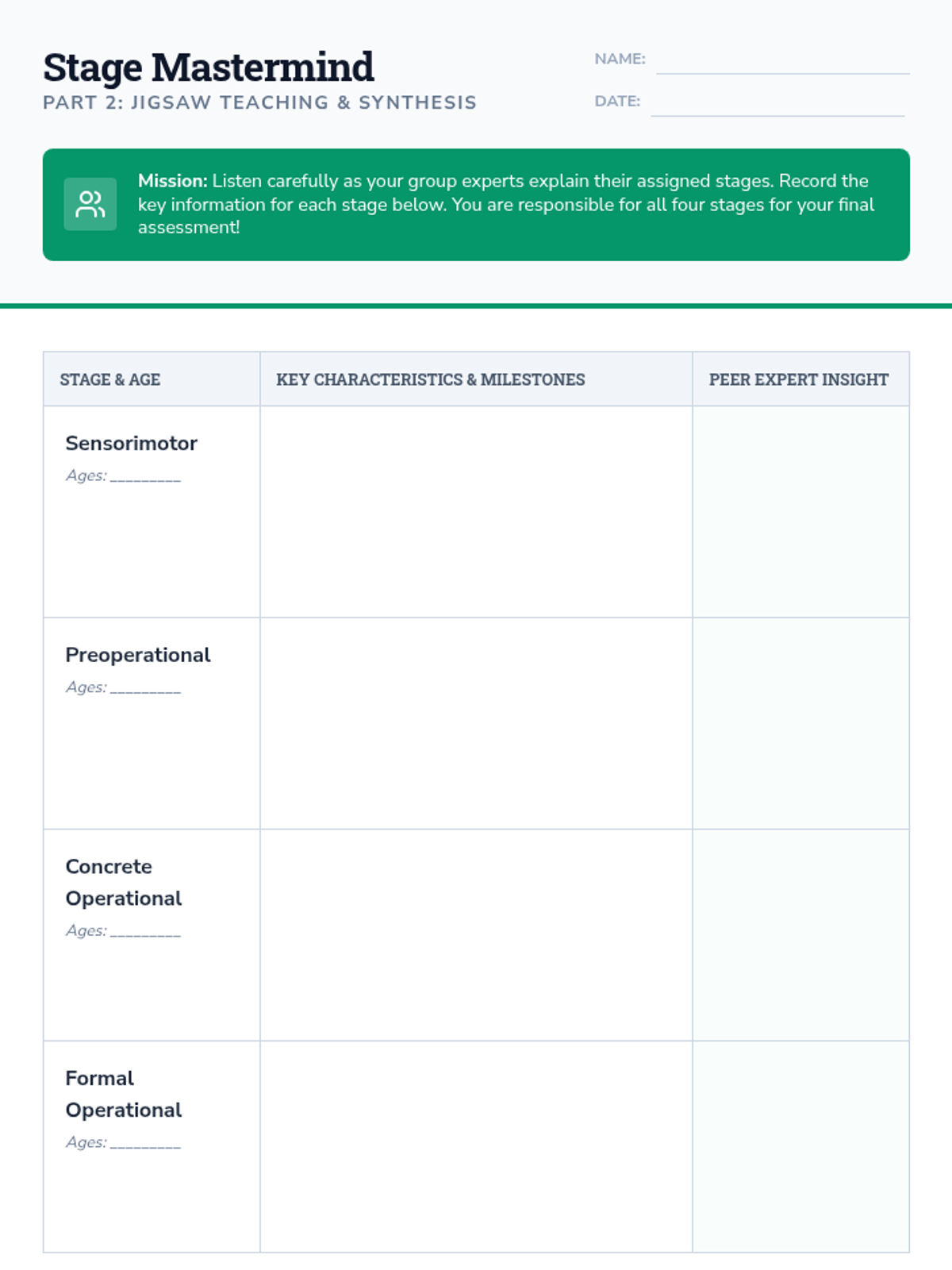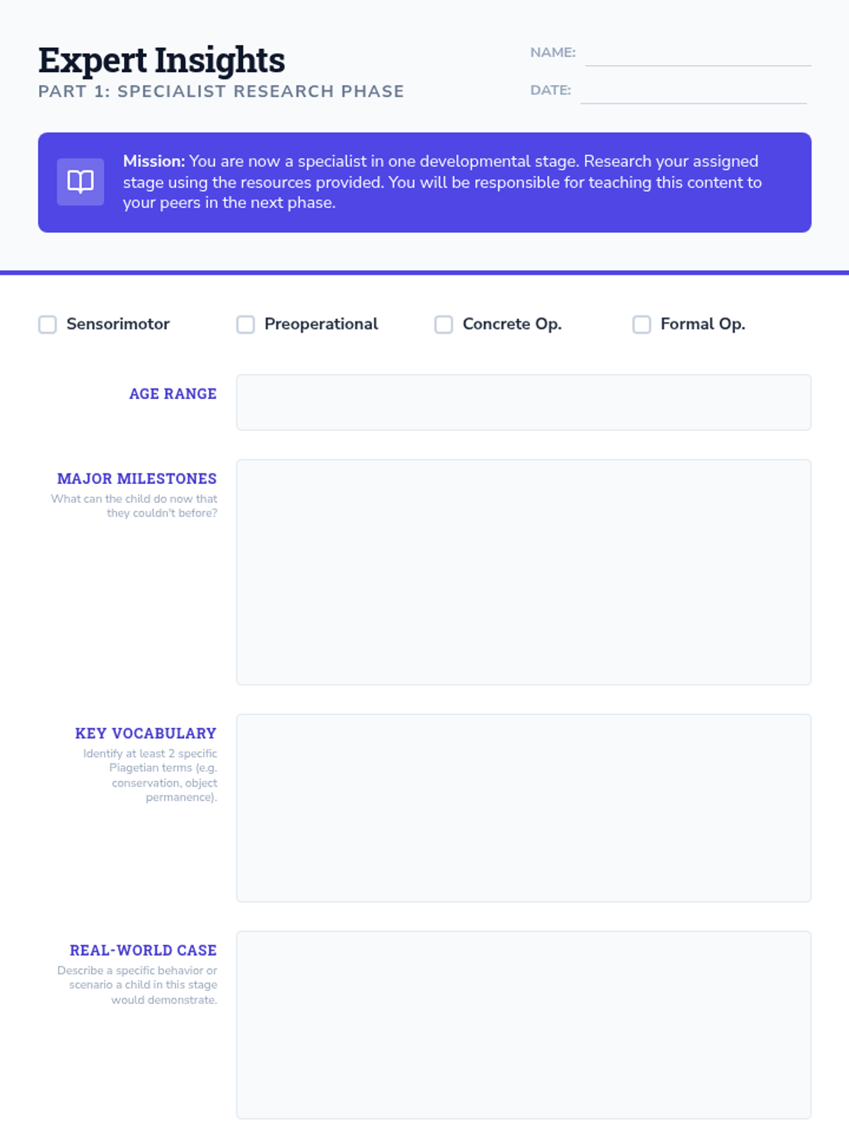 A high school child development lesson using a jigsaw strategy to explore Piaget's four stages of cognitive development, featuring expert research and peer-to-peer teaching.