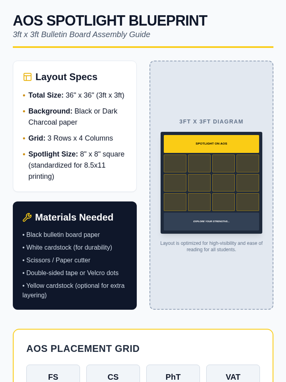 A comprehensive set of visual materials to create a high-contrast, student-friendly bulletin board showcasing twelve Areas of Study (AOS). Includes a layout blueprint, printable spotlight squares, and header/footer banners designed for maximum readability.