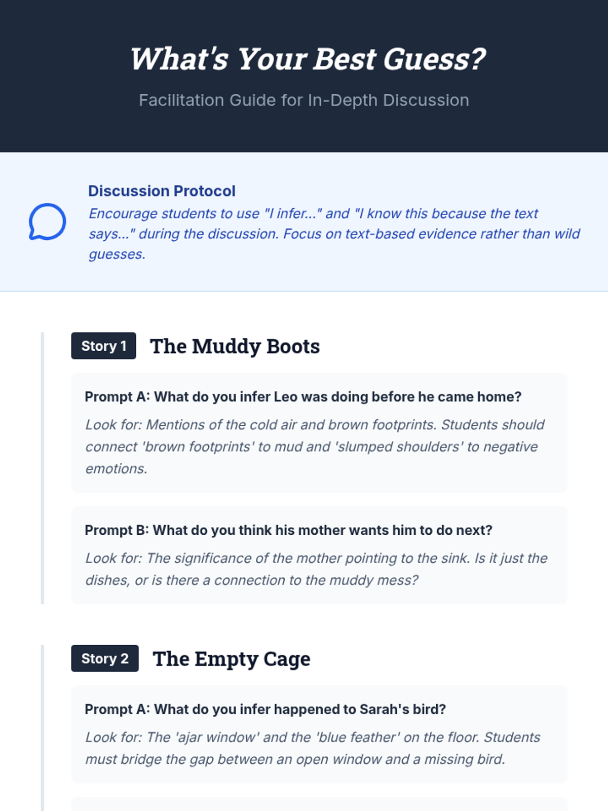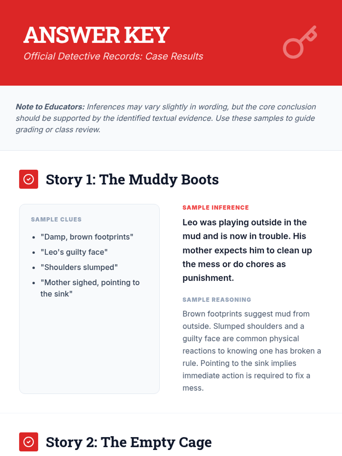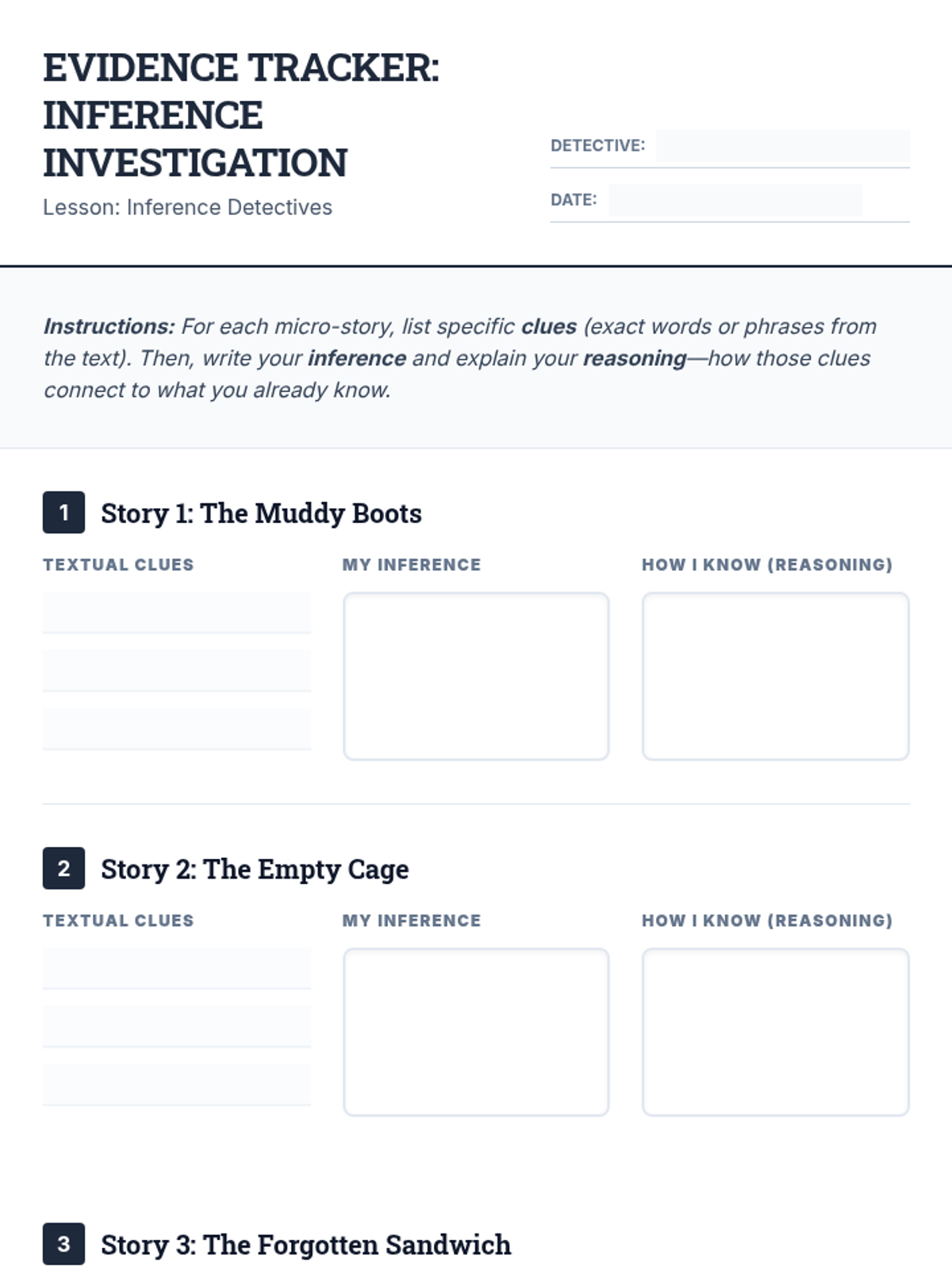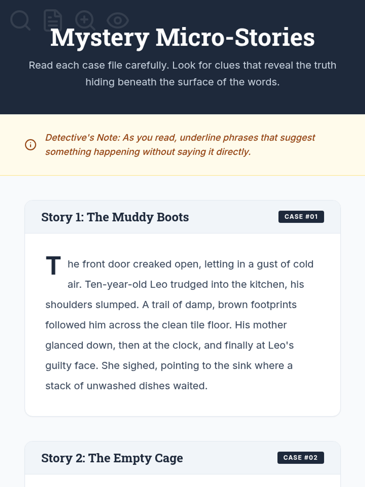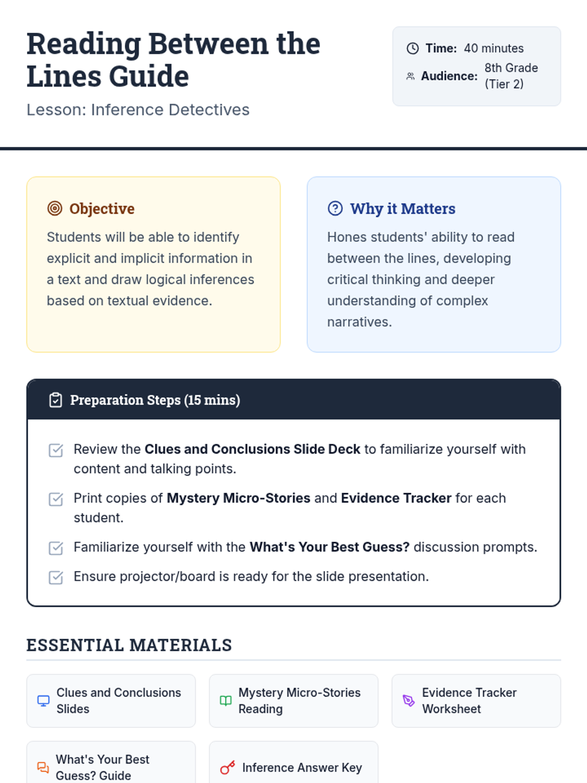 This lesson hones 8th-grade students' ability to read between the lines and draw logical conclusions from textual evidence using a 'detective' theme. Students will differentiate between explicit and implicit information while analyzing three mystery micro-stories.