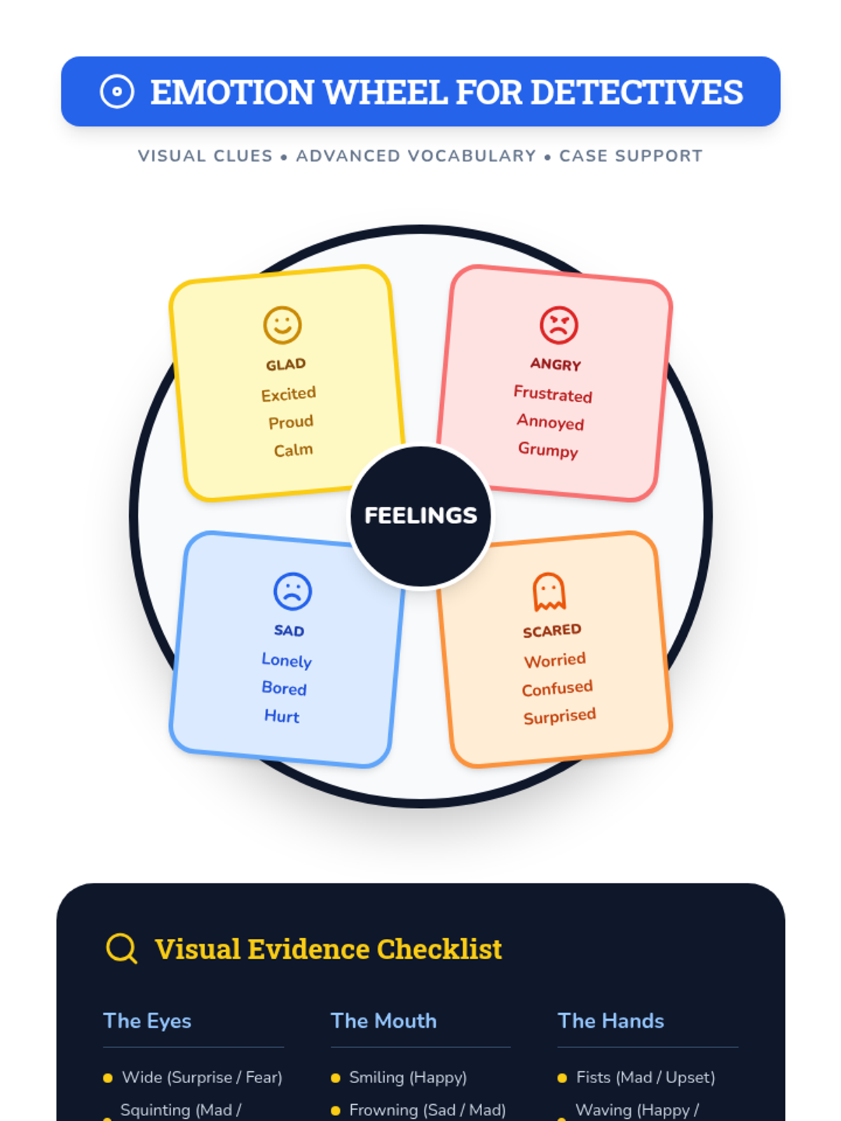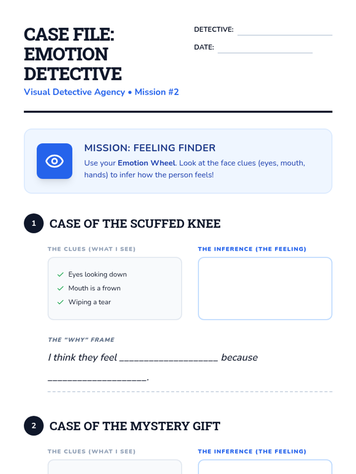 Focusing on social-emotional clues, students analyze images of faces to infer feelings and potential causes for those emotions using an Emotion Wheel scaffold.