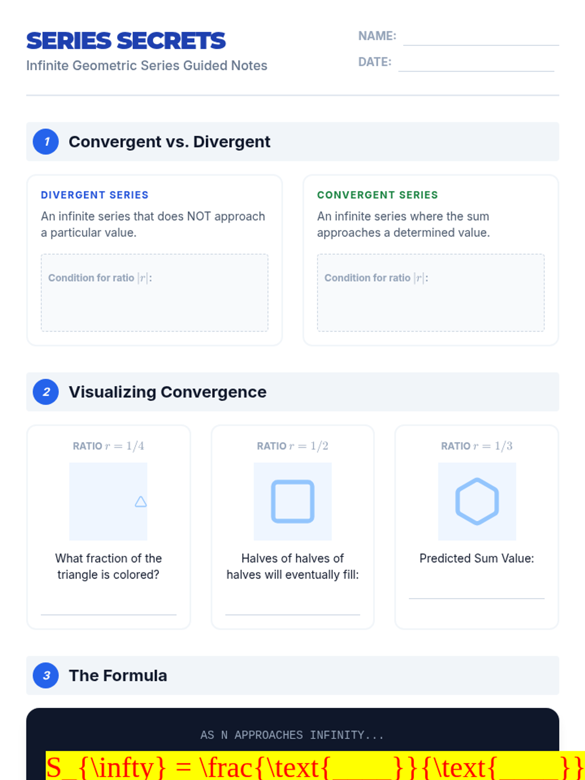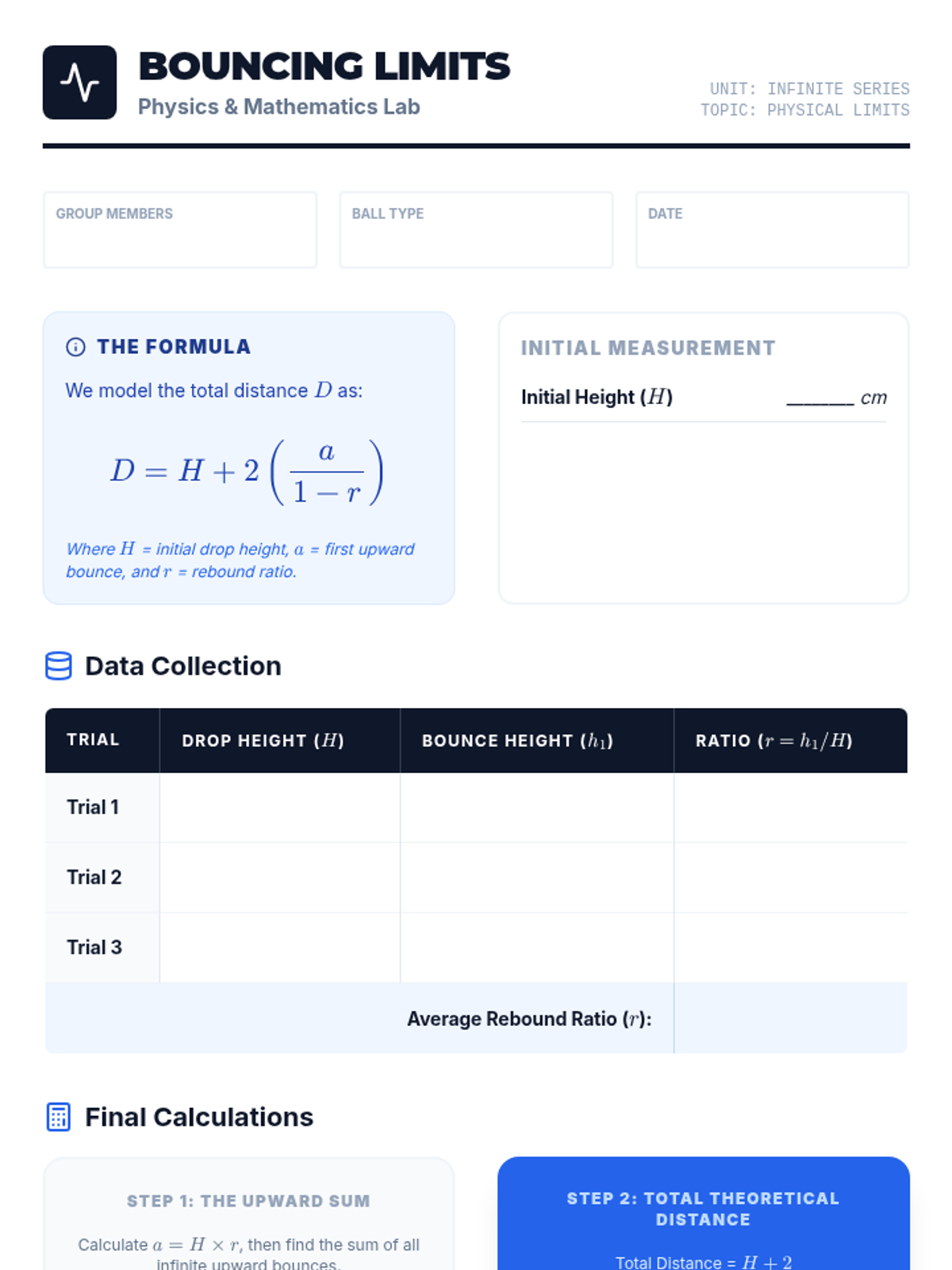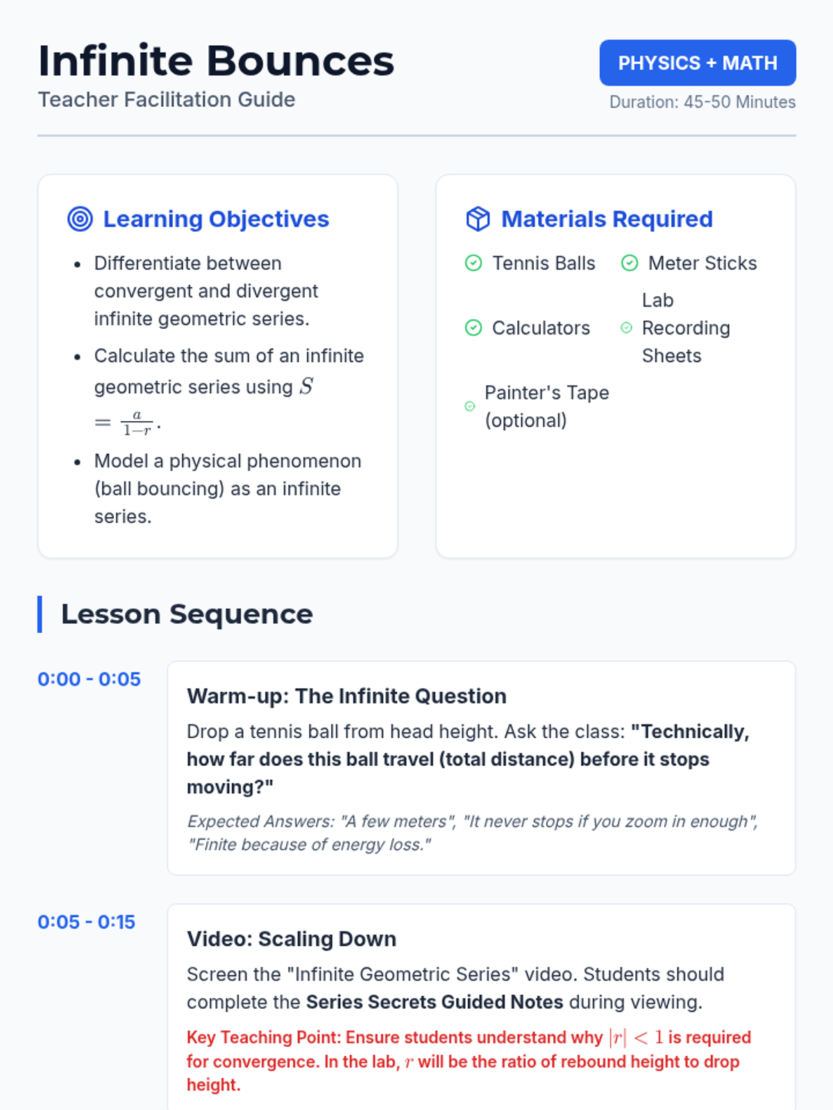 A high school physics and math lesson exploring infinite geometric series through the physical behavior of a bouncing ball, connecting mathematical limits to real-world energy loss.