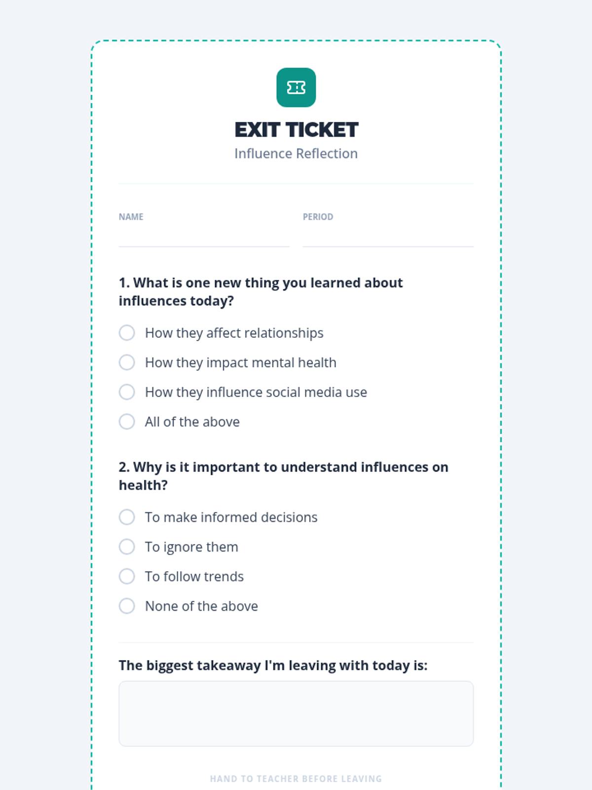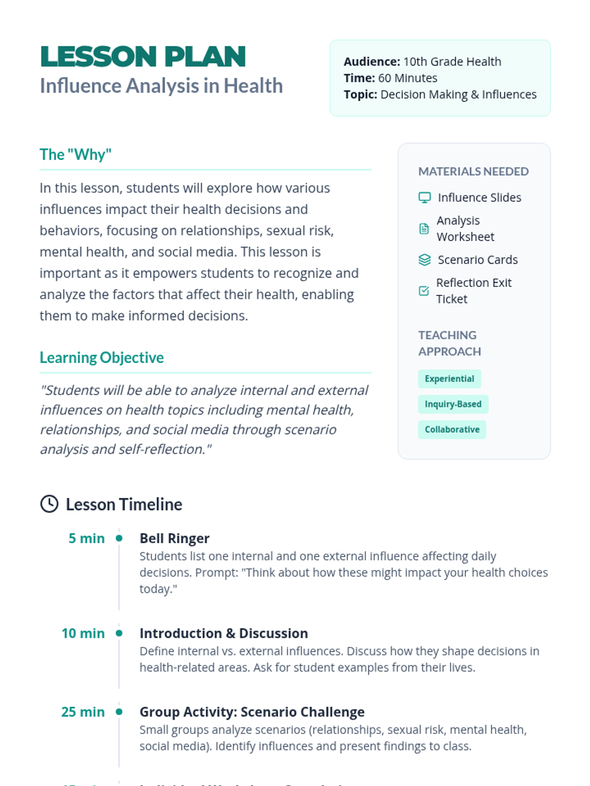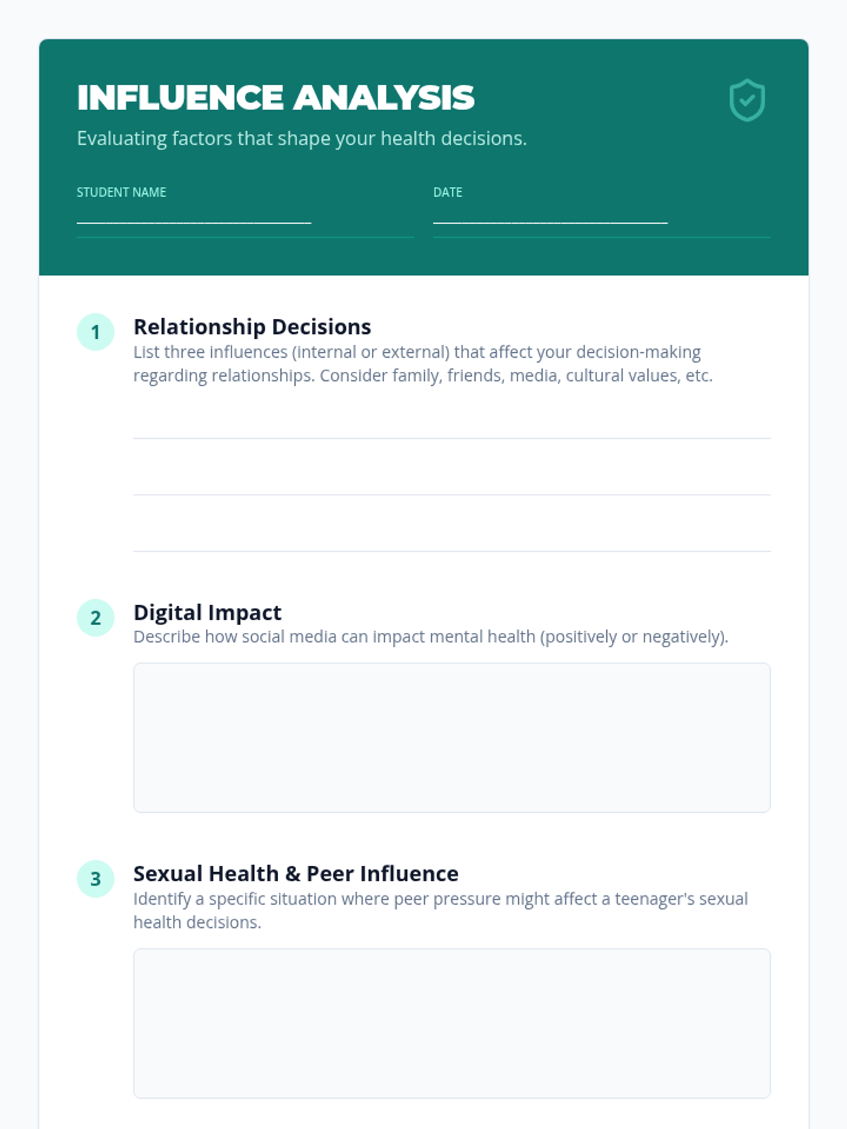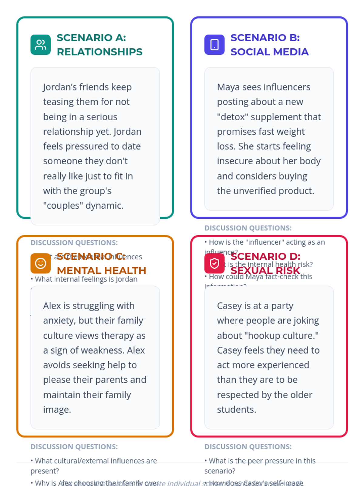 Students analyze internal and external influences on health decisions across topics like social media, relationships, and mental health through inquiry-based scenarios.