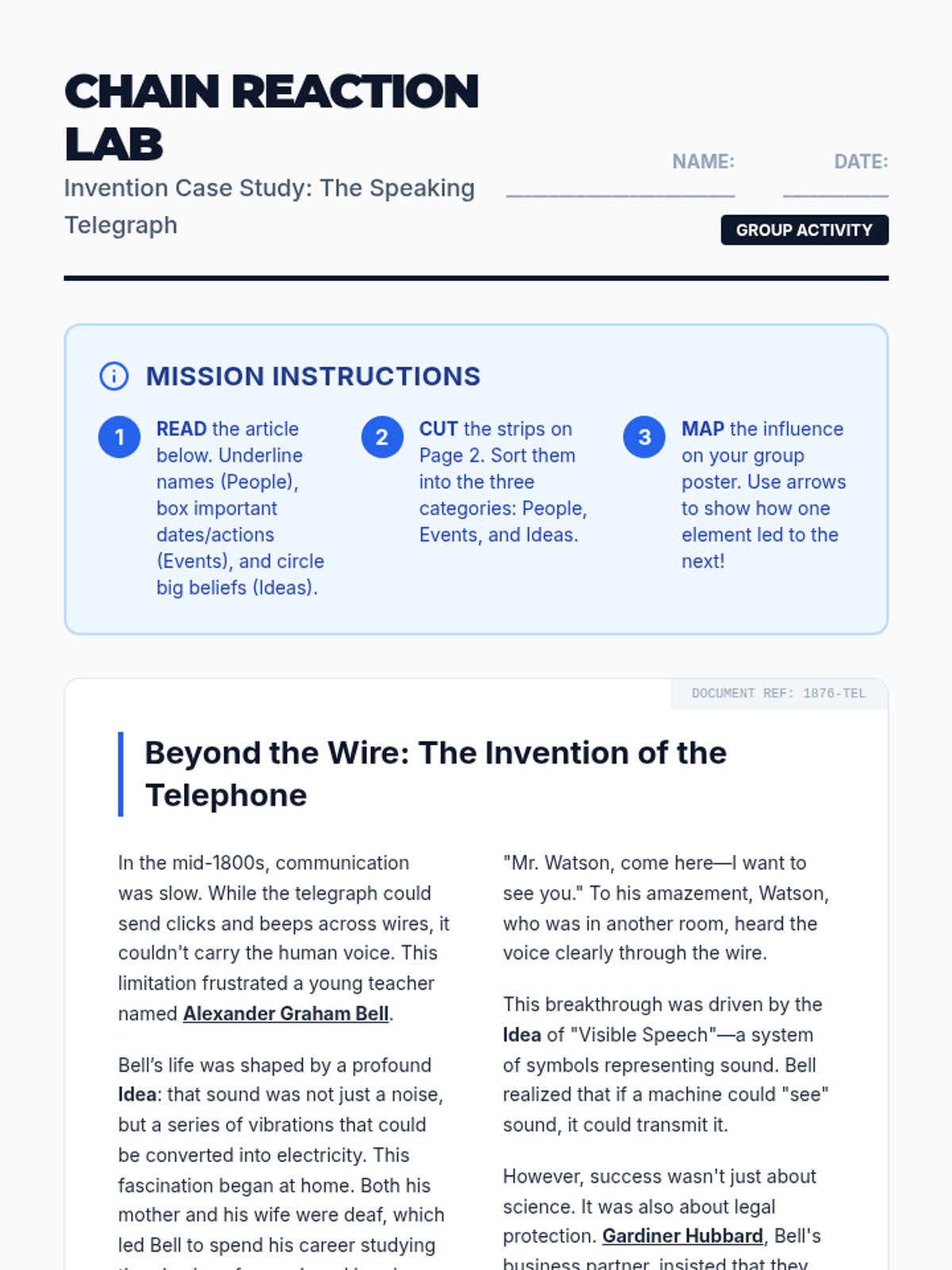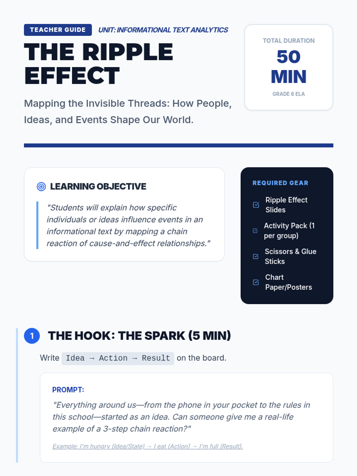 A 6th-grade ELA lesson focused on analyzing interactions in informational texts. Students learn to identify people, events, and ideas and map the 'chain reaction' of how they influence one another.