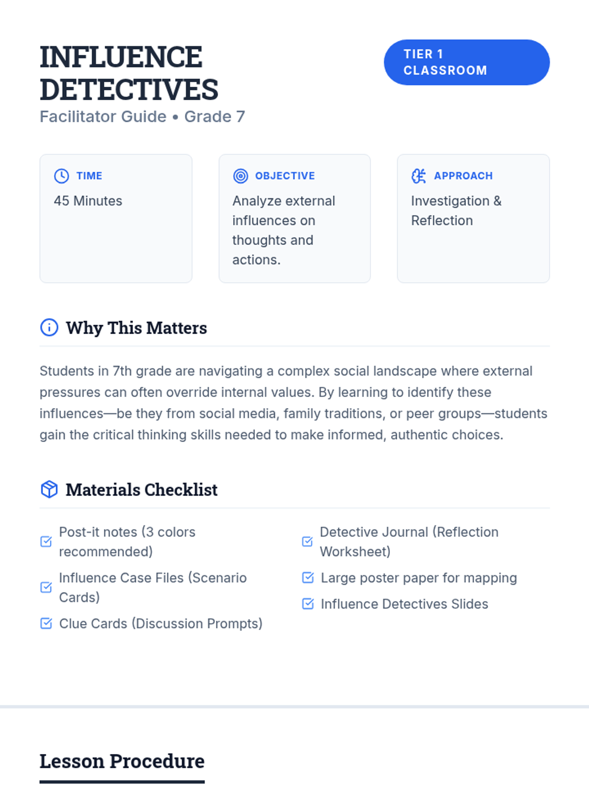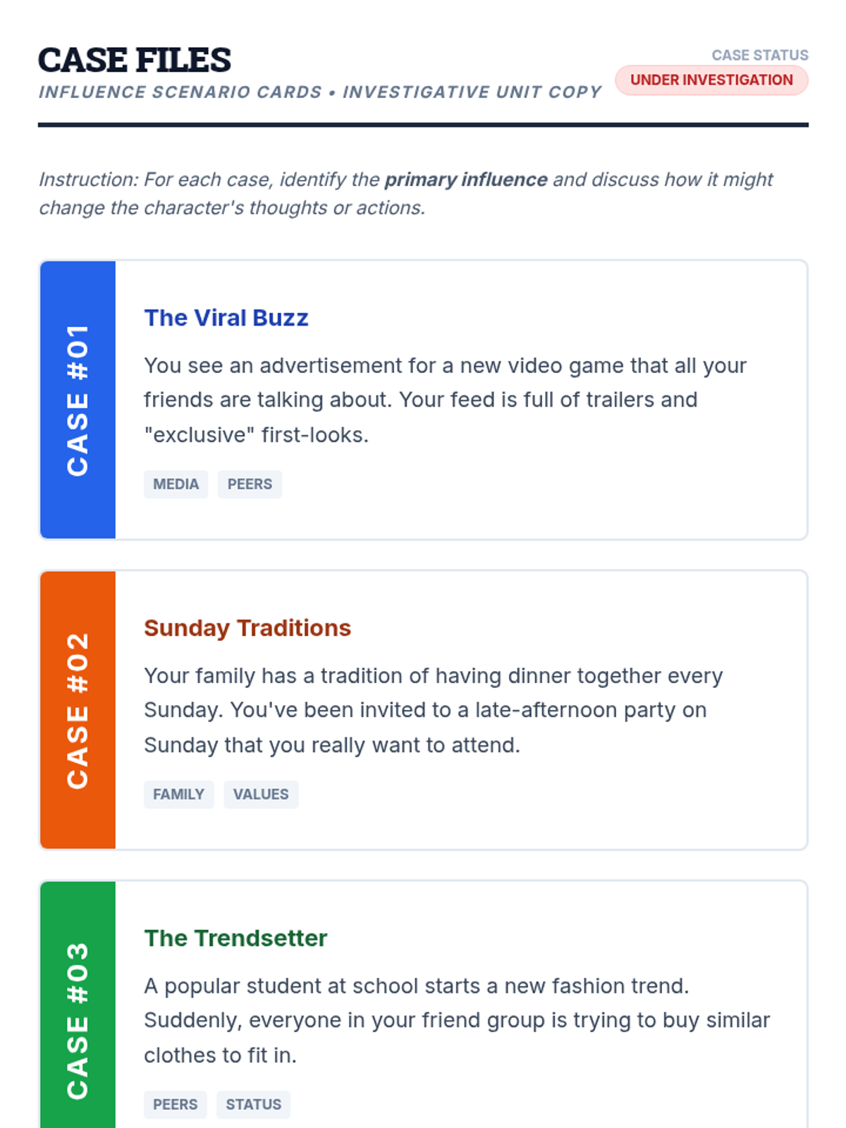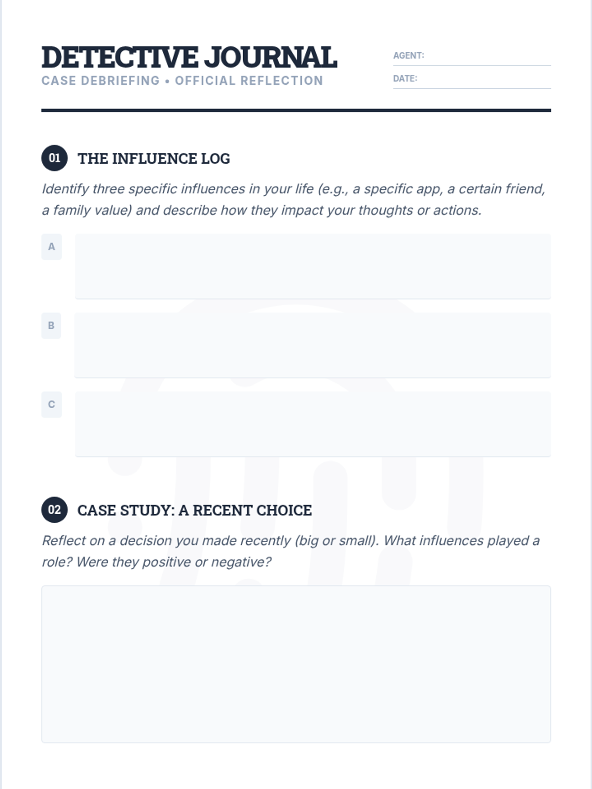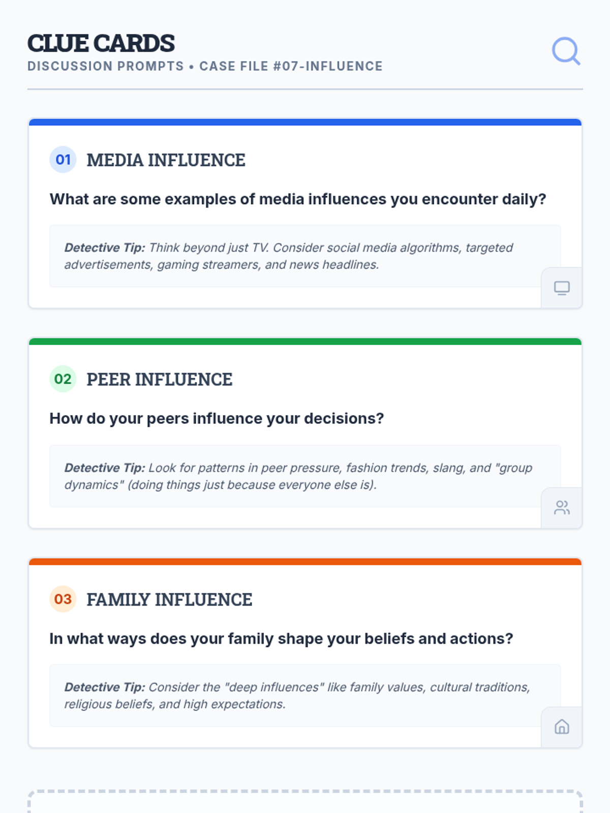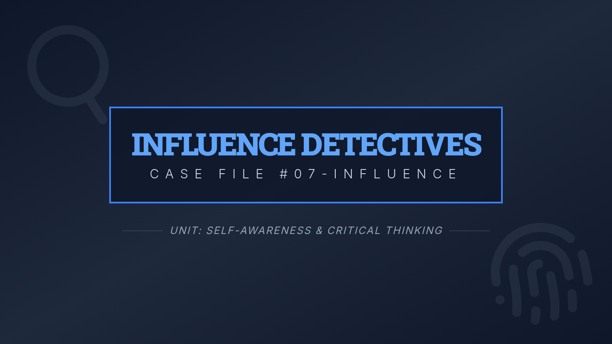 Students will investigate the various external forces—media, peers, and family—that shape their daily decisions and beliefs. This lesson uses a detective-themed approach to foster critical thinking and self-awareness.