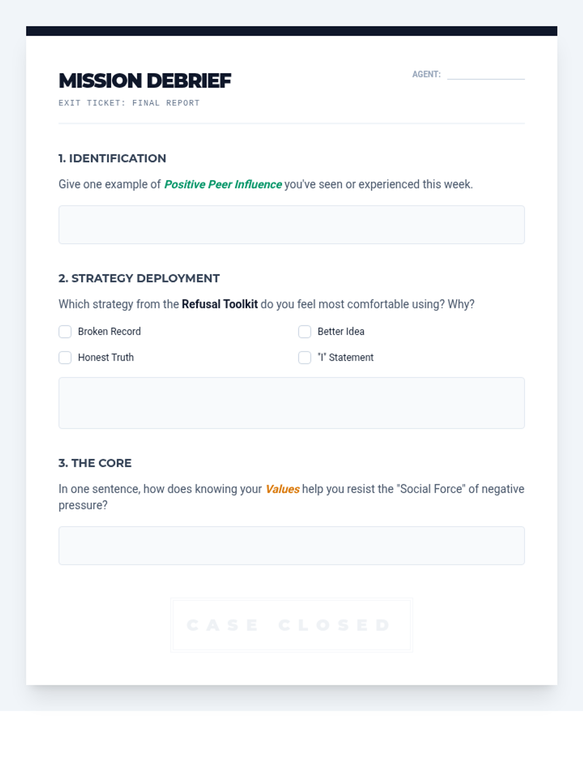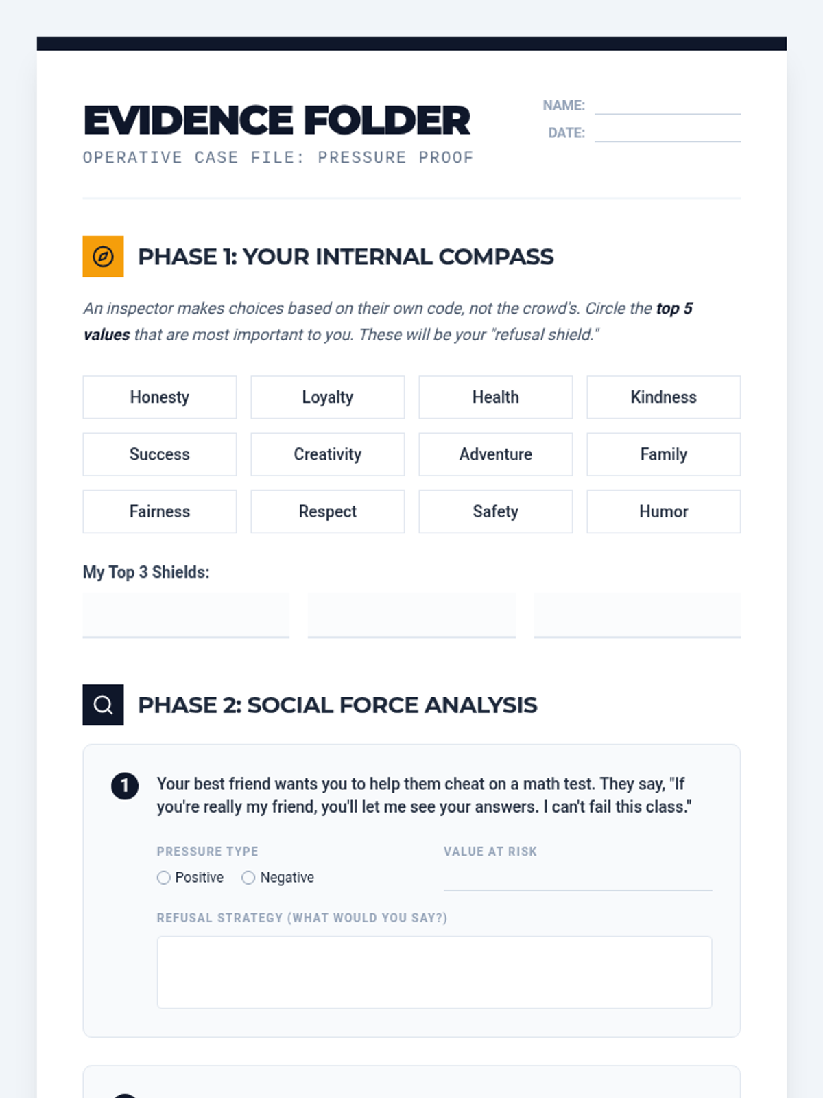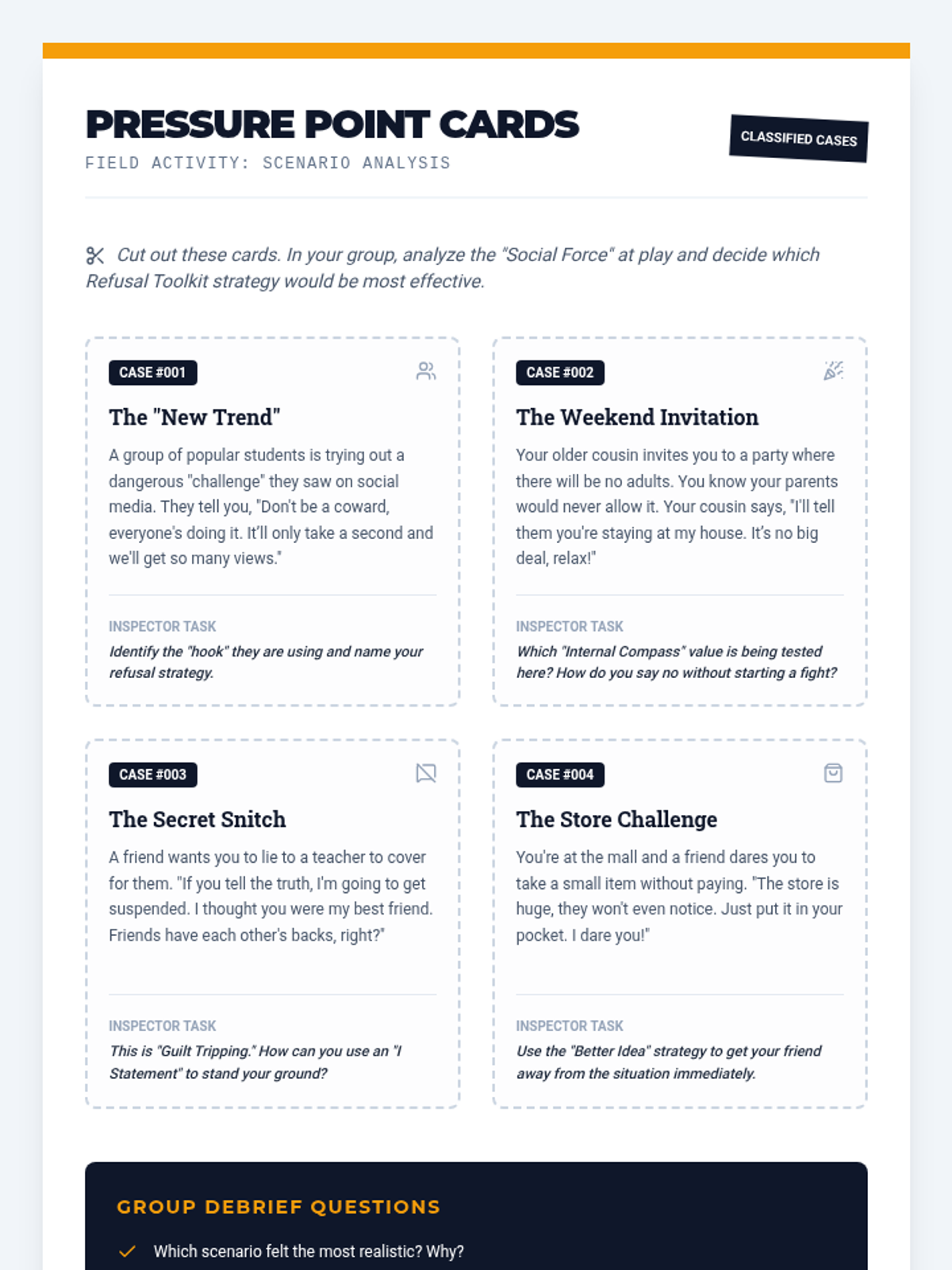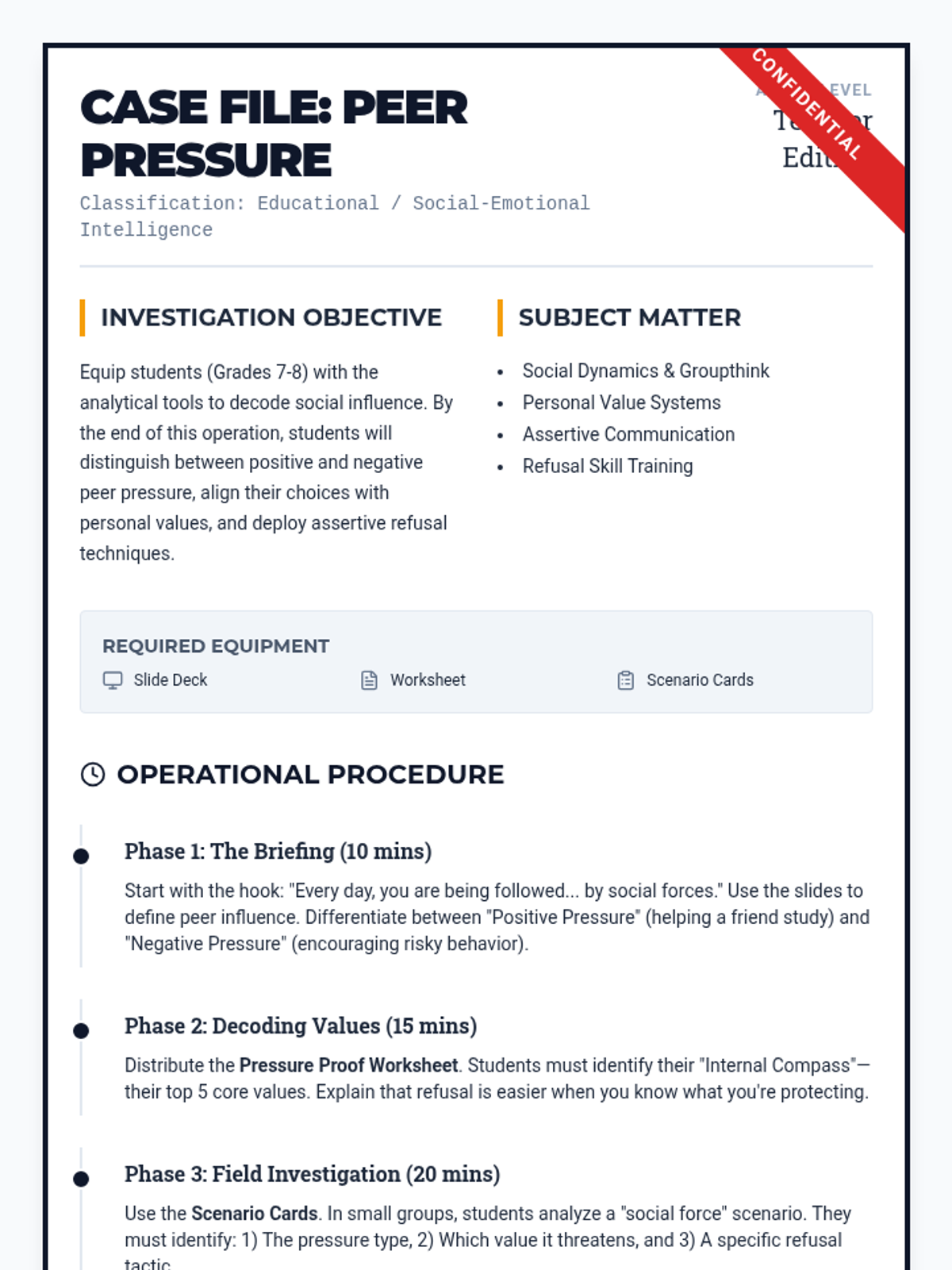 An investigative look at peer influence, helping 8th graders decode social forces, align with personal values, and master assertive refusal skills.