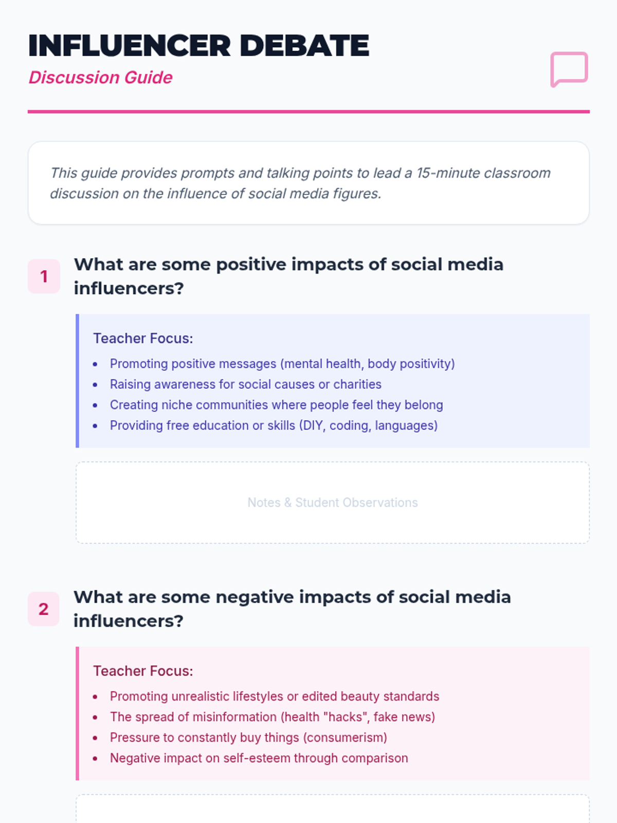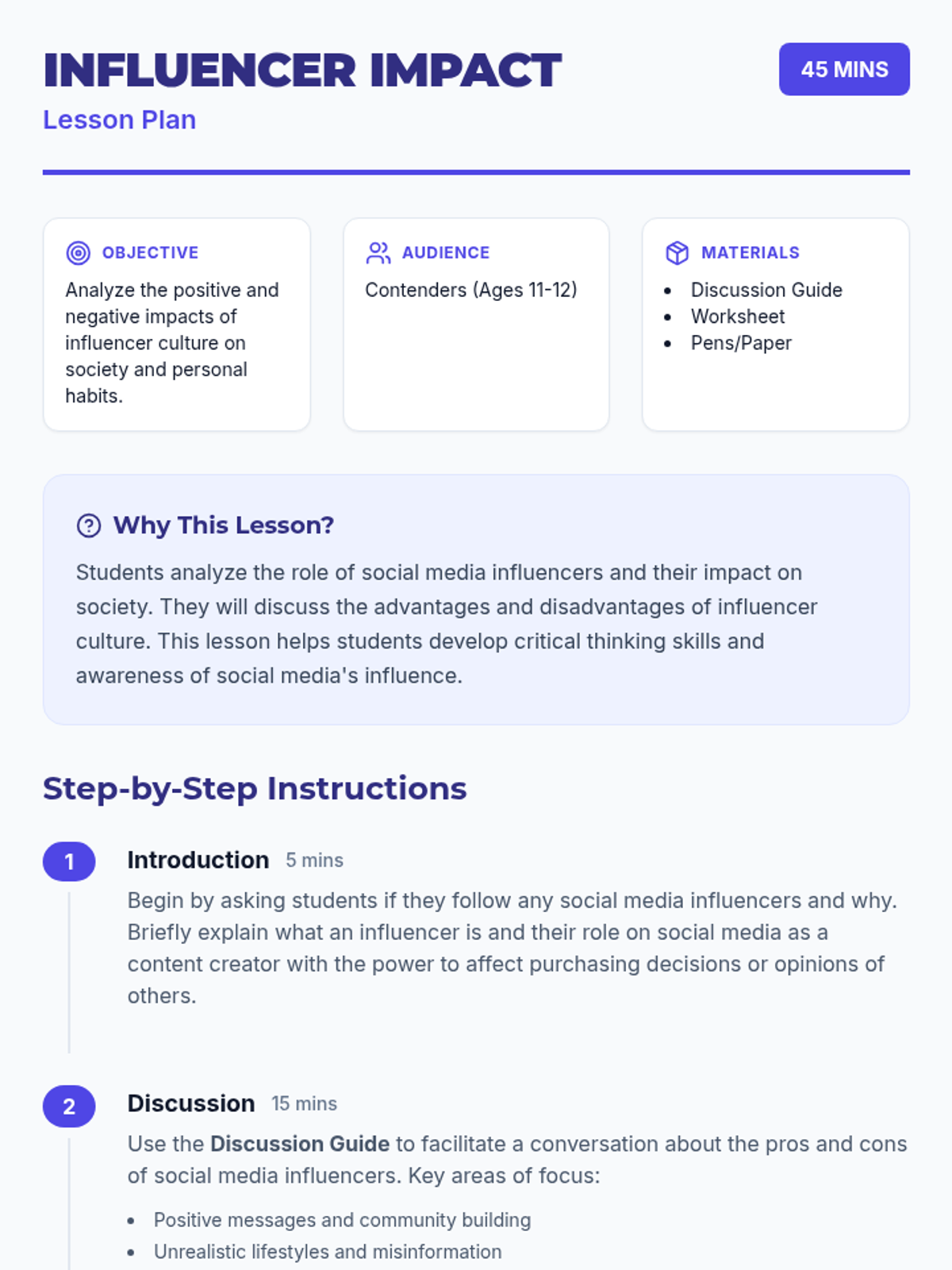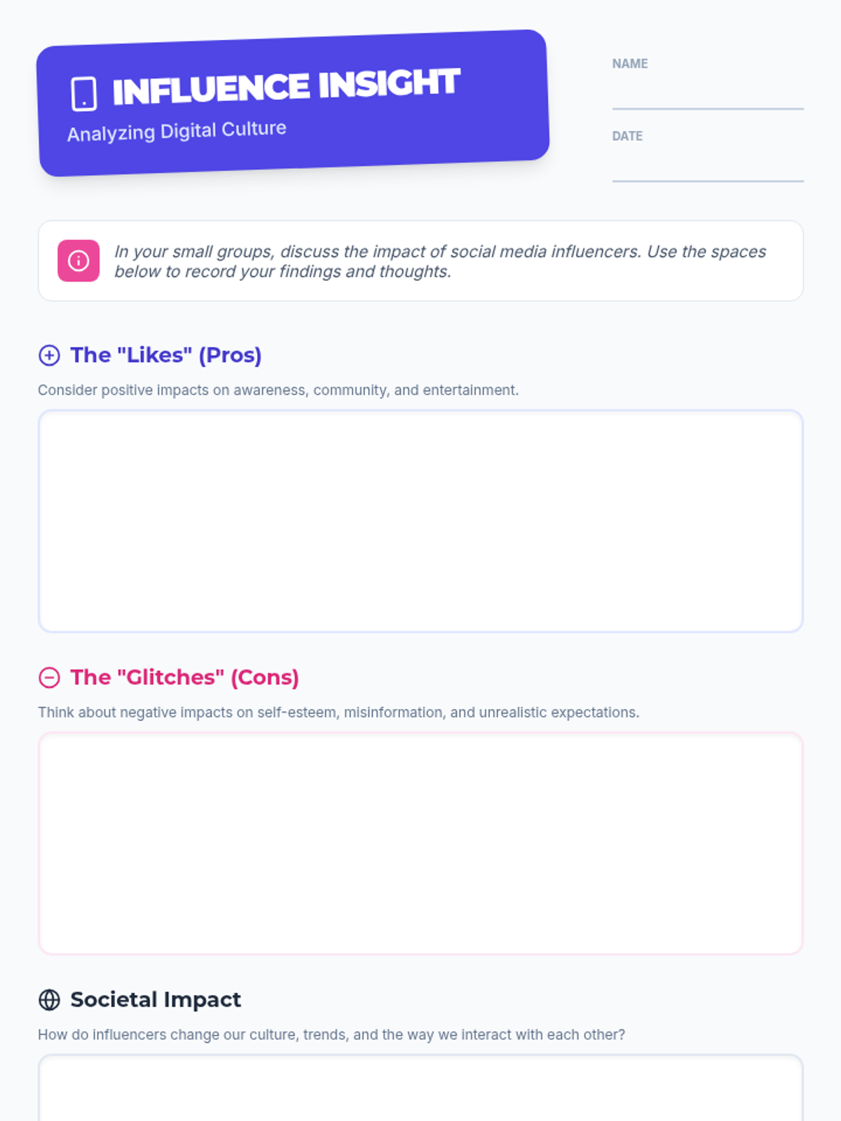 Students analyze the role of social media influencers and their impact on society. They will discuss the advantages and disadvantages of influencer culture, helping them develop critical thinking skills and awareness of social media's influence.