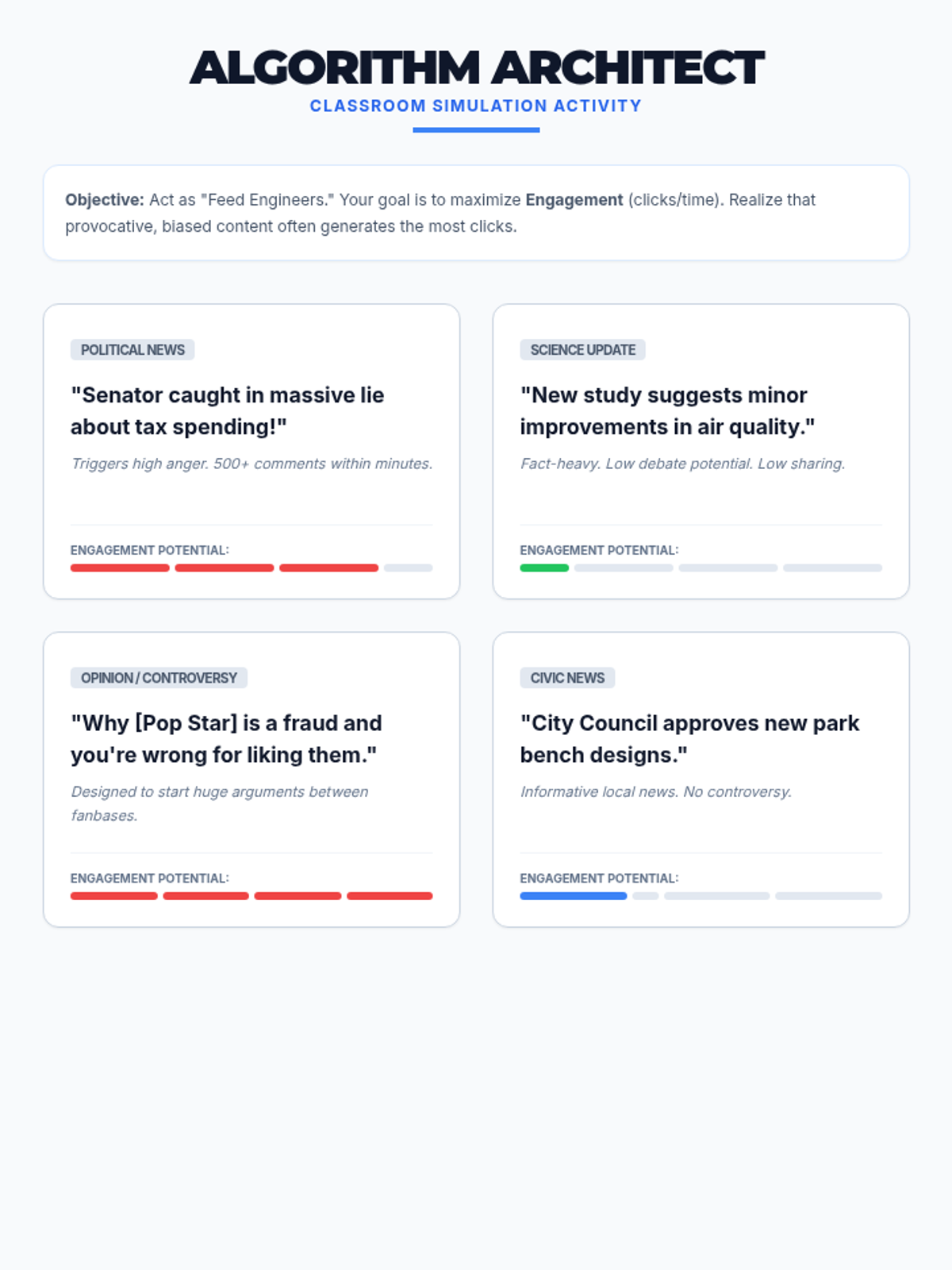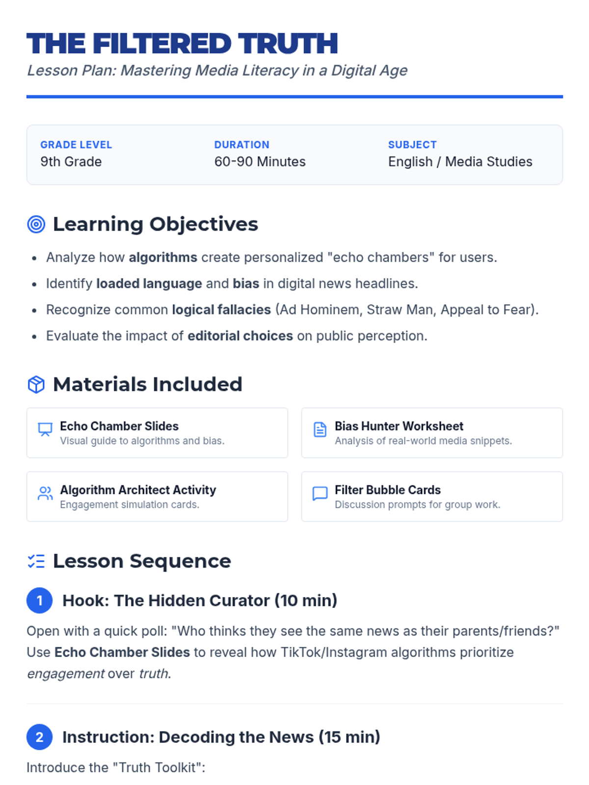 Students will investigate how social media algorithms and editorial bias shape their understanding of reality. Through headline analysis and a simulation activity, 9th graders will develop the critical thinking skills needed to navigate a digital information landscape.