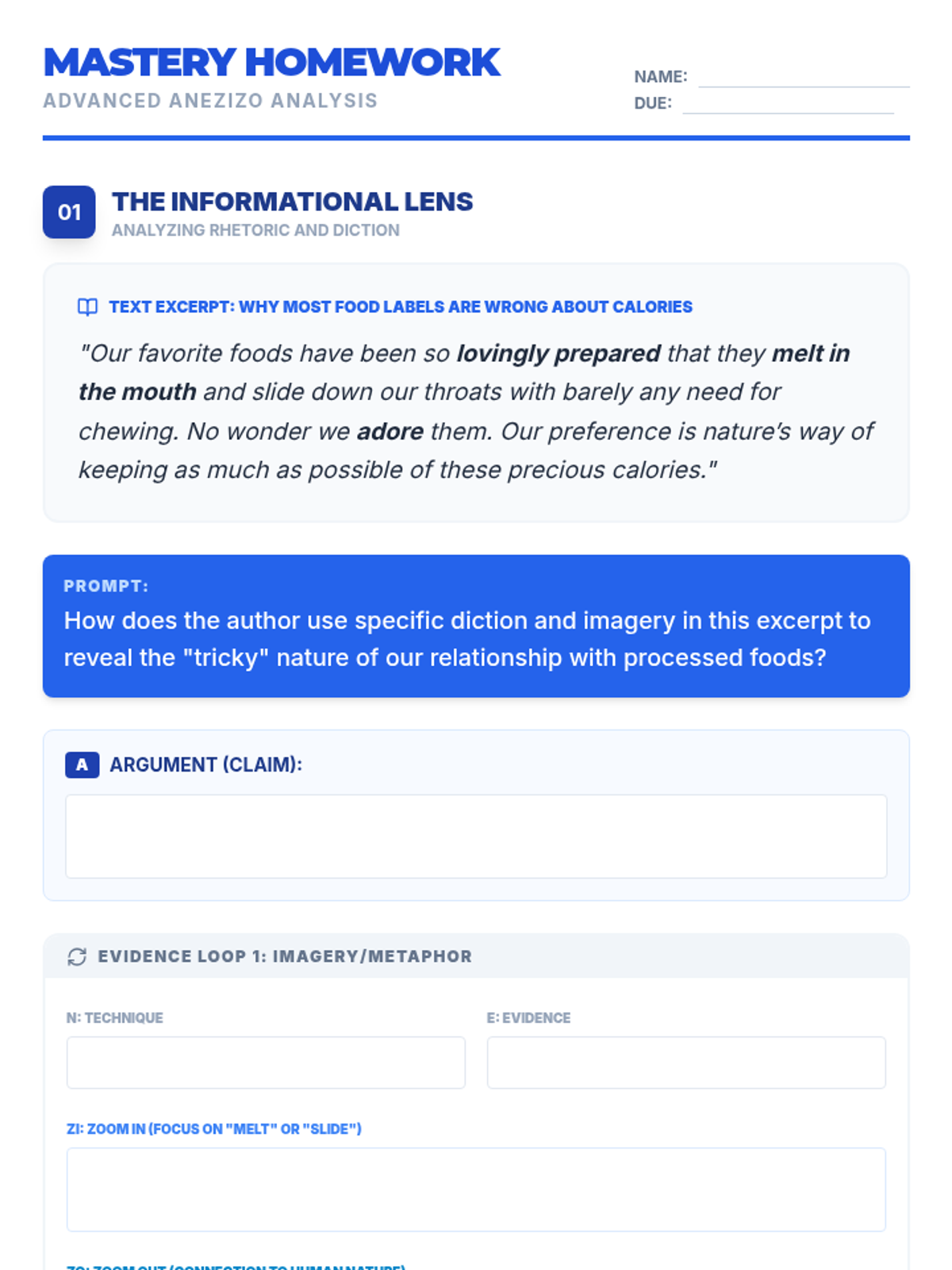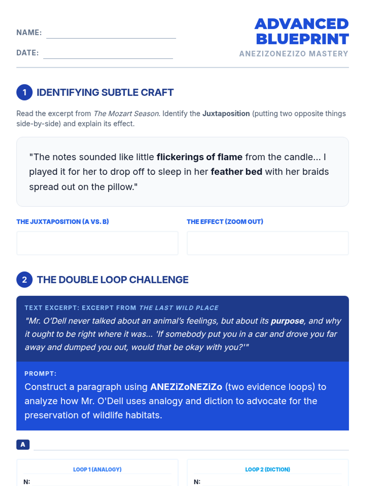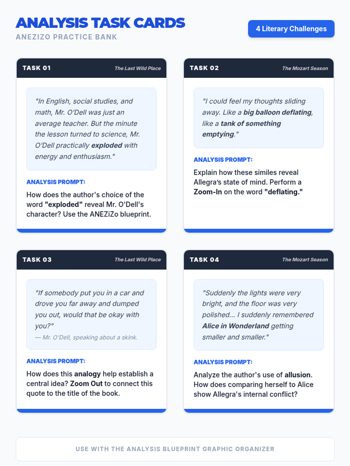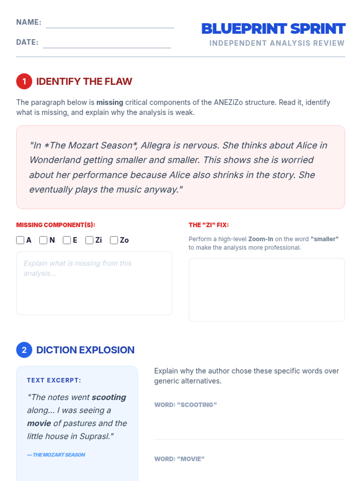 A comprehensive lesson focused on mastering the ANEZiZoNEZiZo paragraph structure for literary analysis. Students will learn to construct strong arguments, identify techniques, provide evidence, and perform deep analysis through zooming in on diction and zooming out to thematic significance.