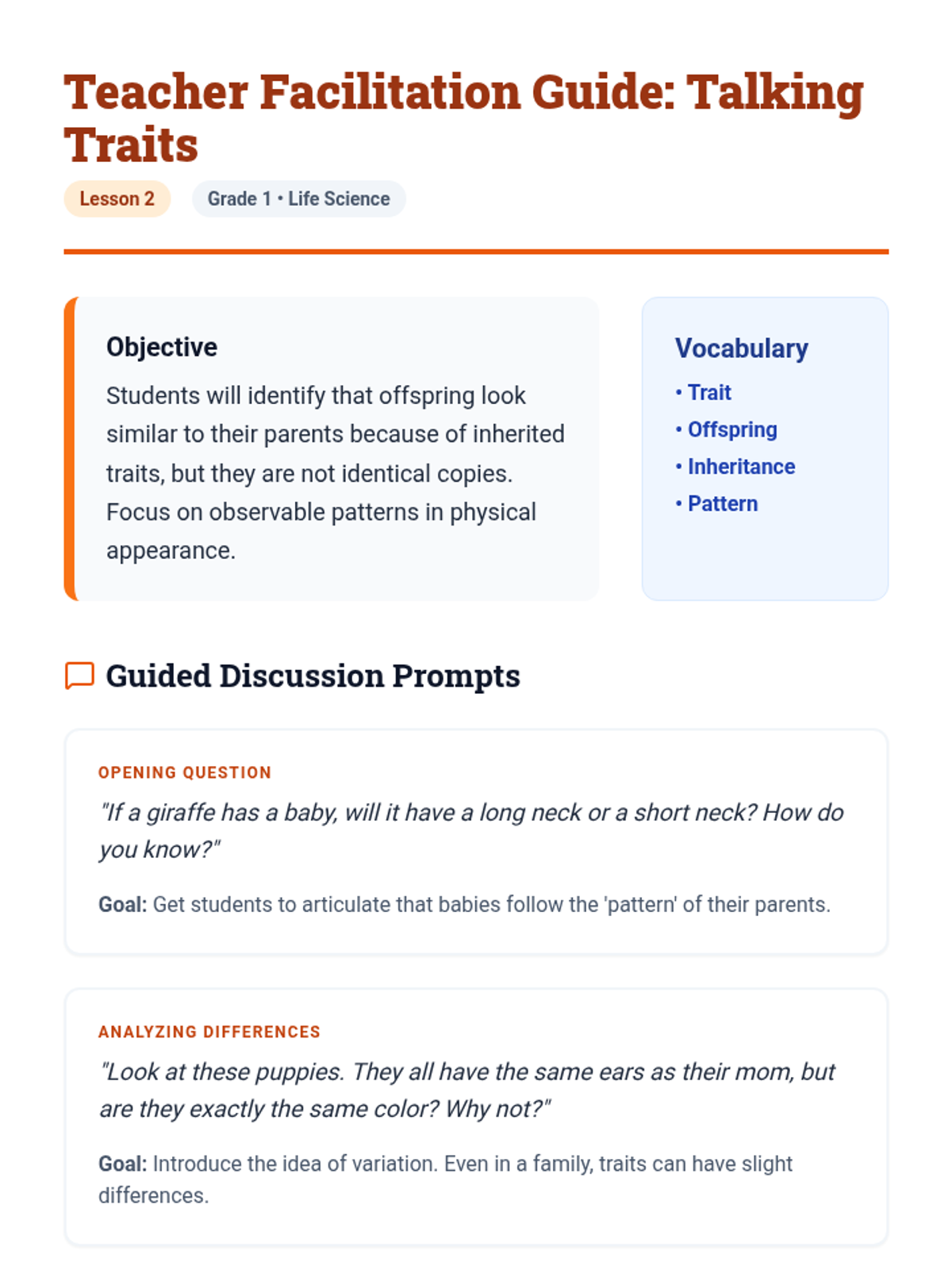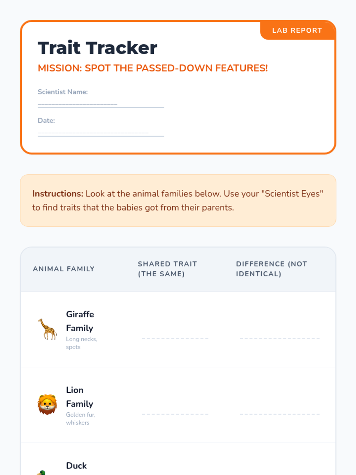 Students examine specific features (fur color, ear shape, beak type) to see how traits are passed down. They complete a 'trait tracker' activity looking at animal families to identify shared physical characteristics.