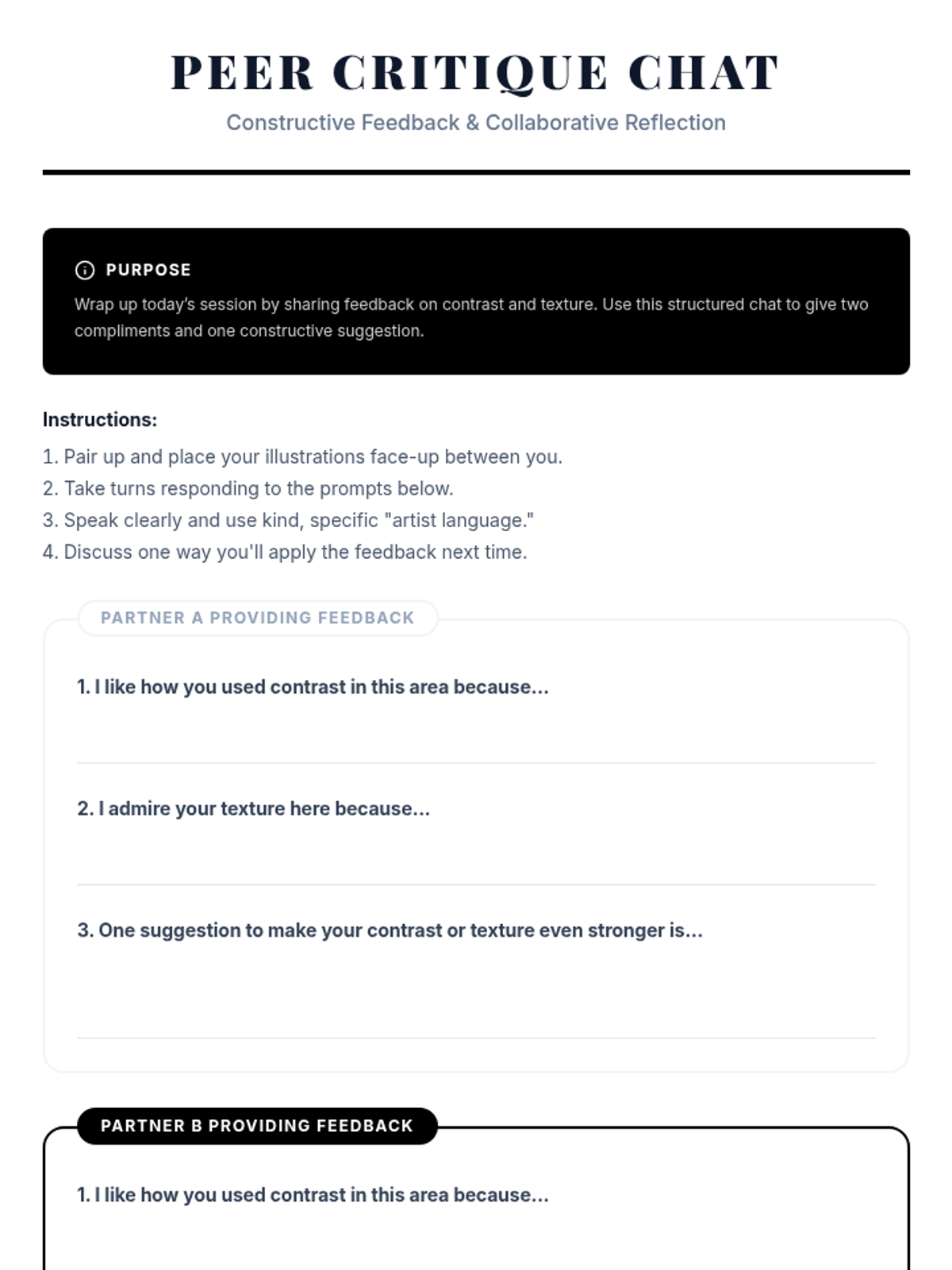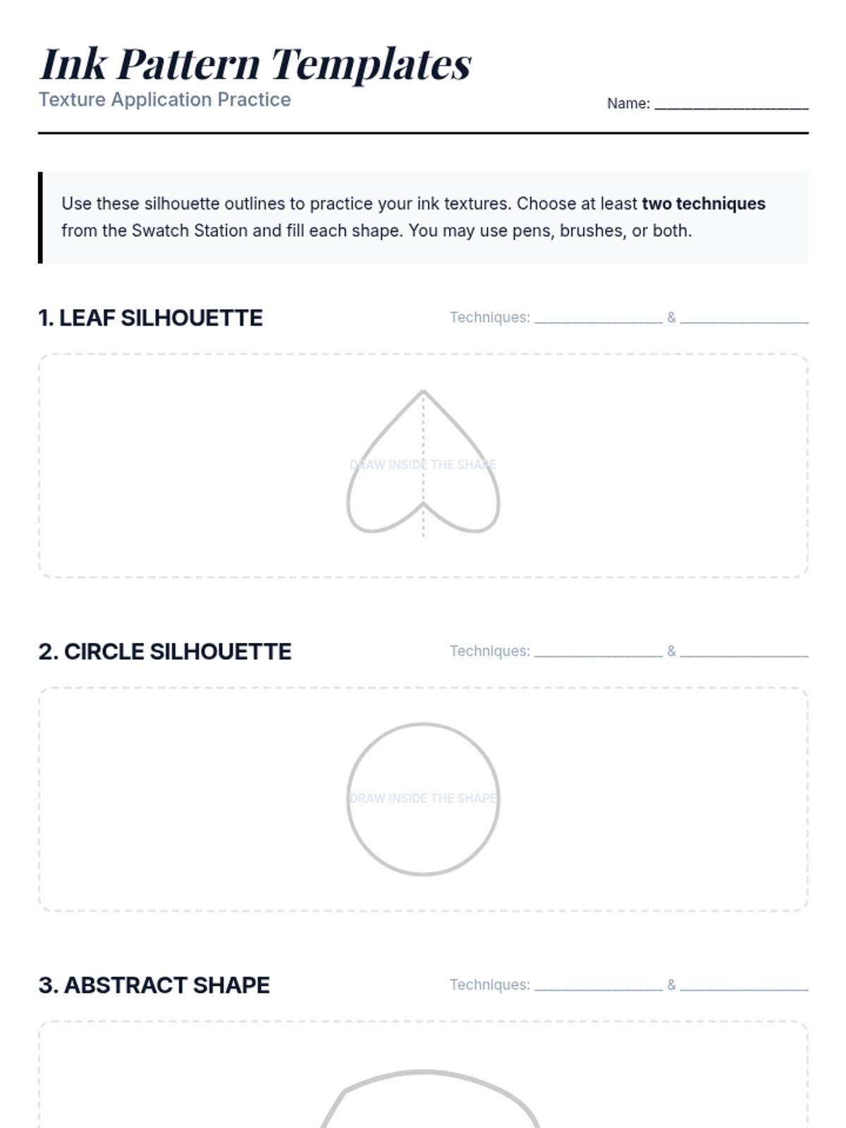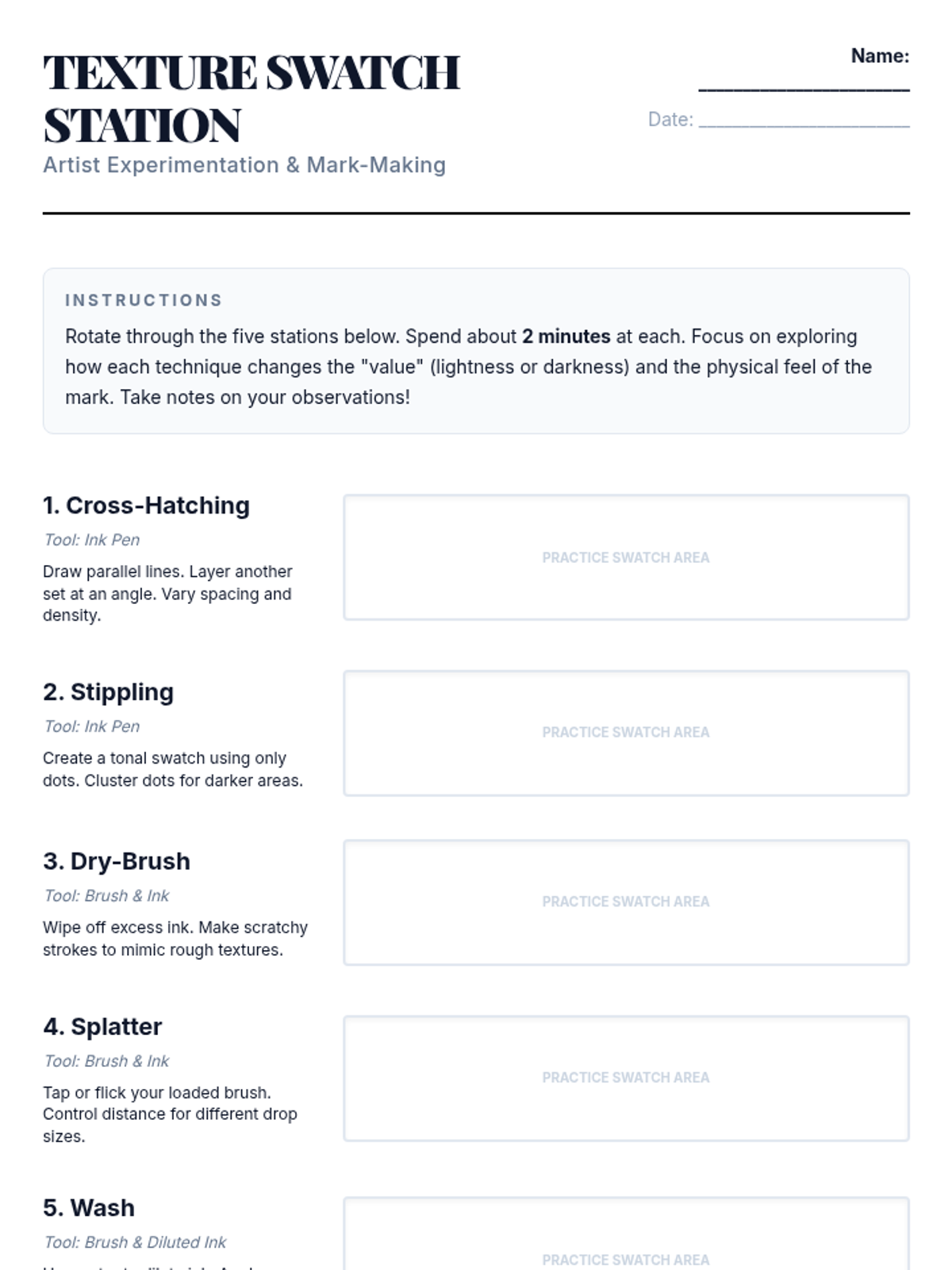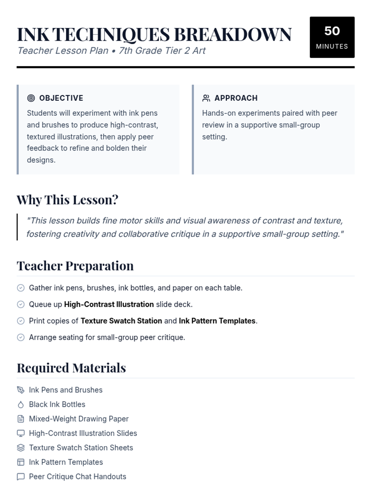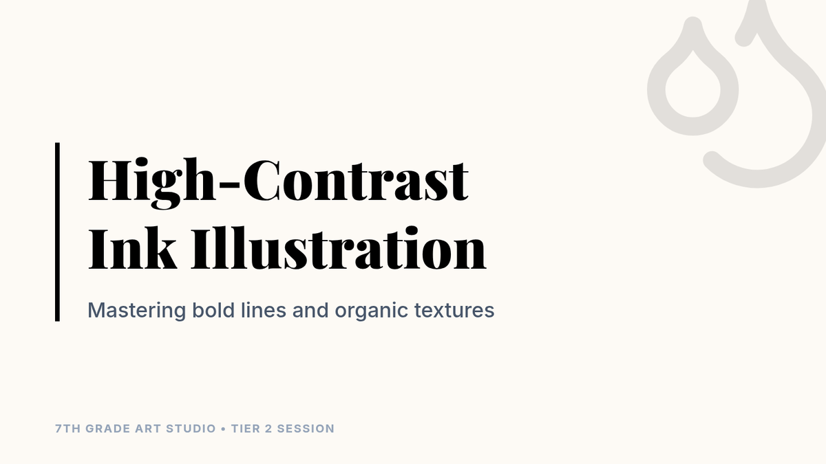 A 7th-grade small-group lesson where students explore ink pens and brushes to master contrast, texture, and bold design through hands-on experimentation and peer feedback.