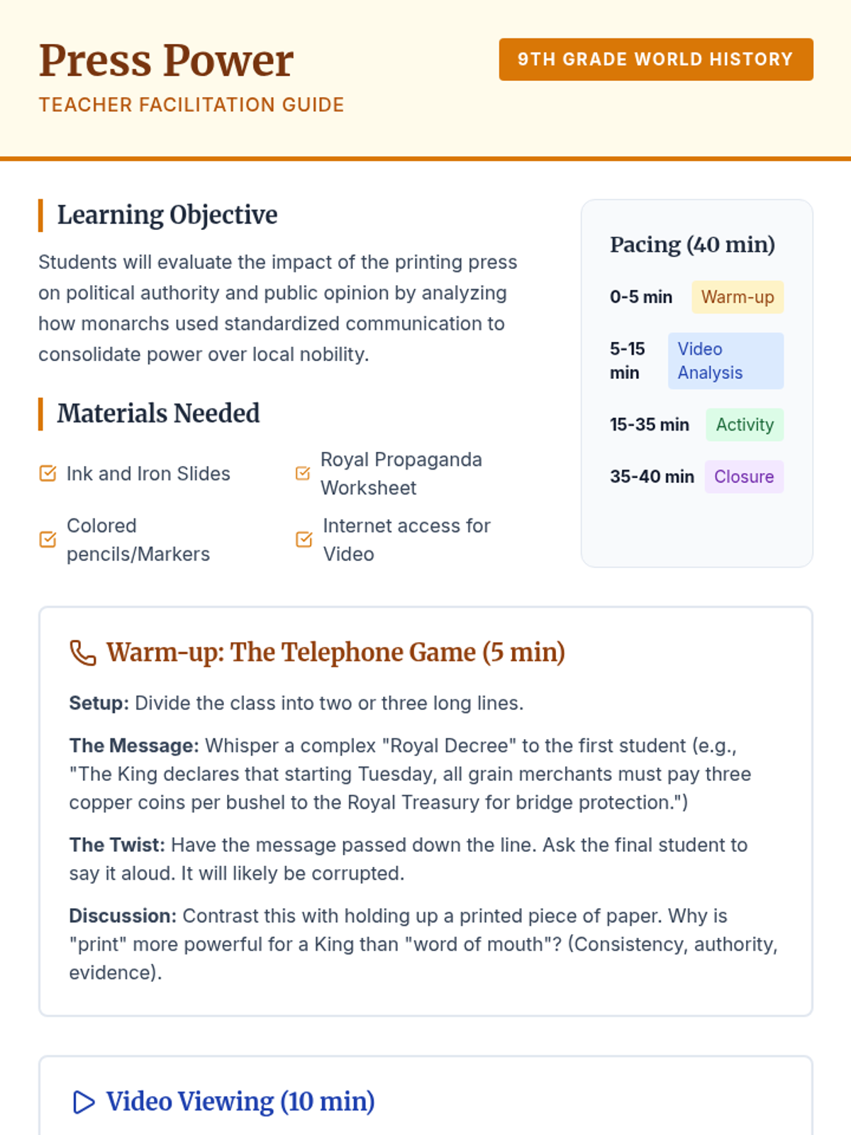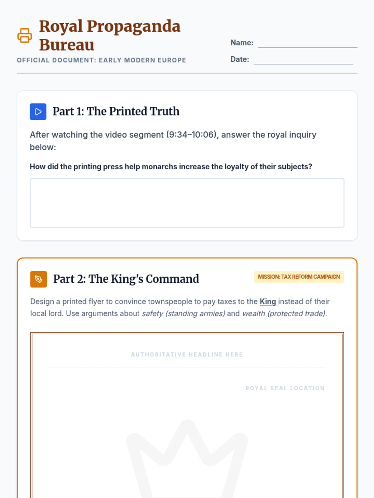 This lesson explores how the invention of the printing press shifted power from local nobles to centralized monarchs by standardizing laws, spreading propaganda, and shaping public opinion. Students will analyze video content and create their own 'Royal Propaganda' flyers to understand the strategic use of communication technology in Early Modern Europe.