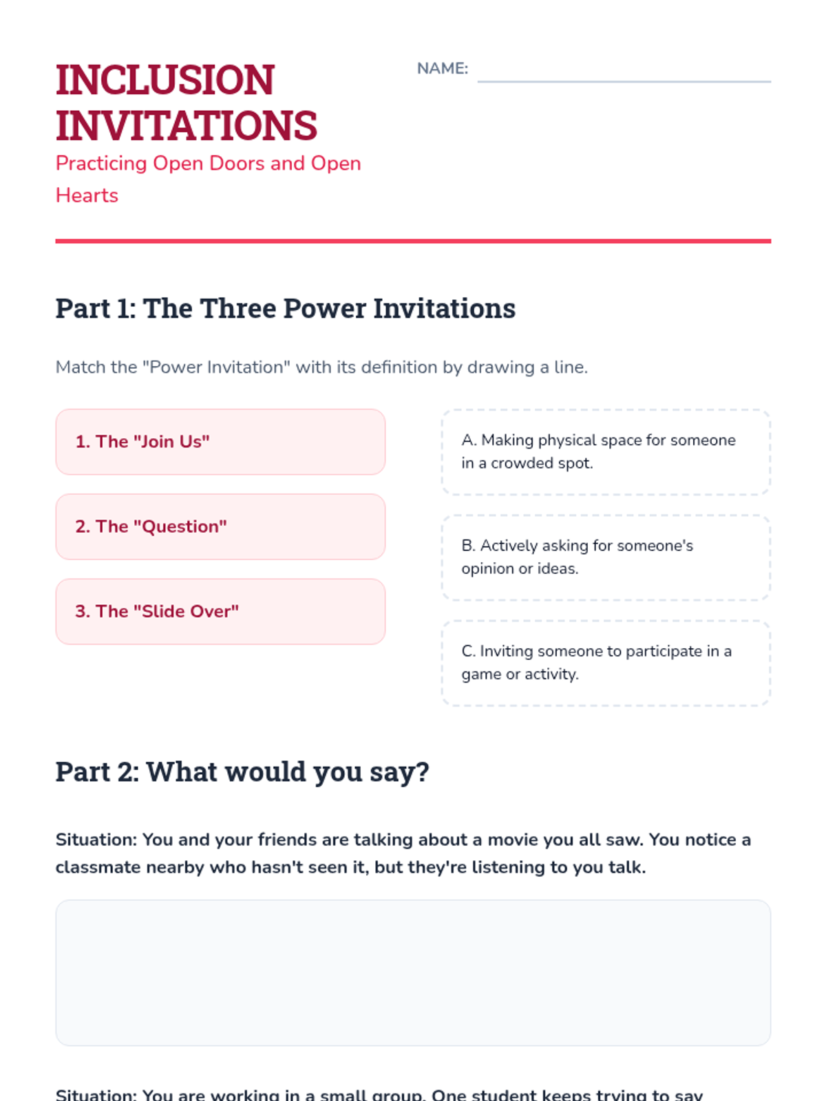 Teaches students specific language and actions to include others in activities and conversations, fostering a sense of belonging.