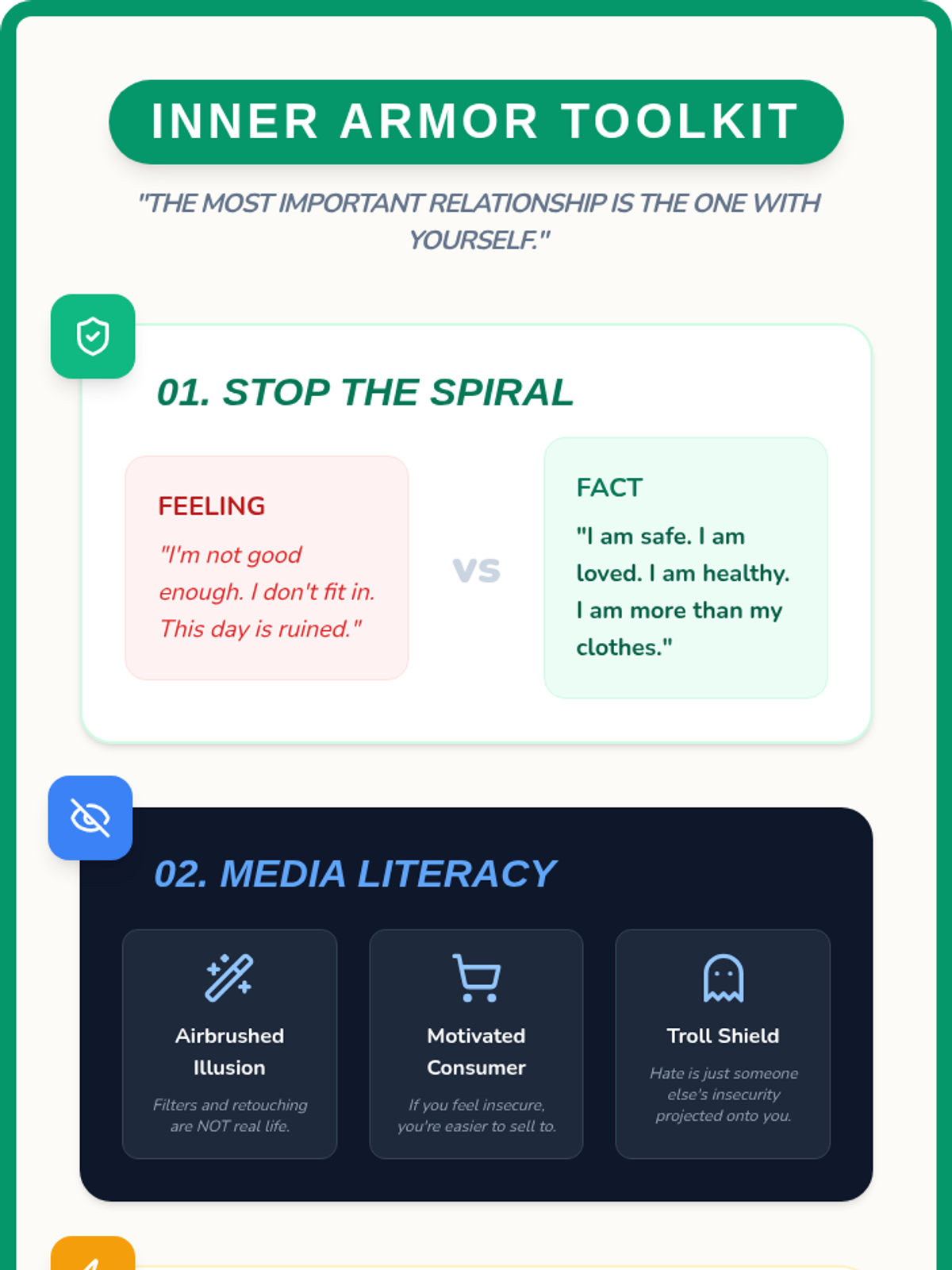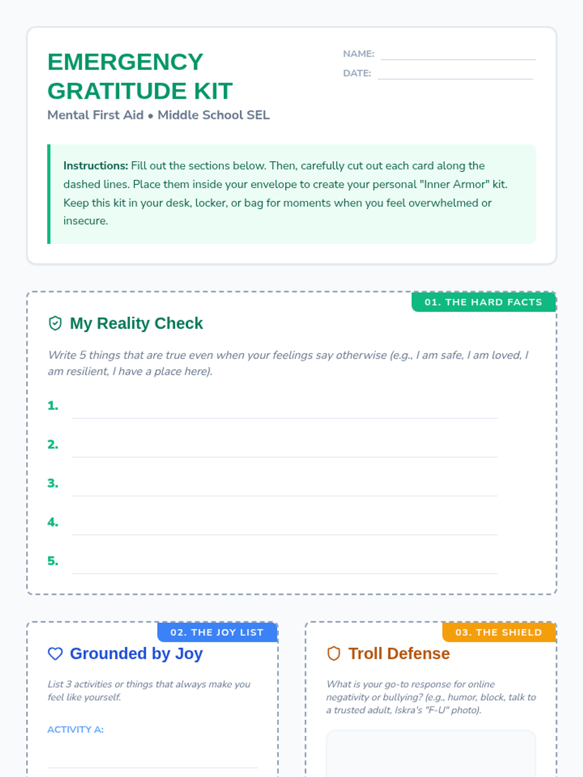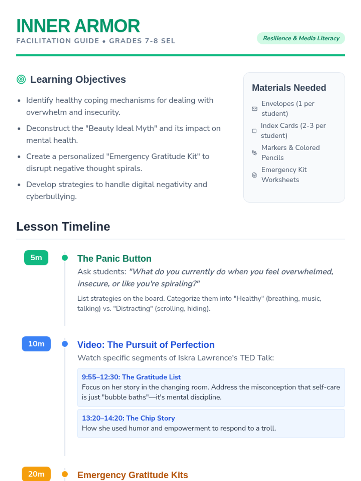 This lesson focuses on building emotional resilience and media literacy for middle schoolers. Students learn practical self-care tools like the 'Mirror Challenge' and 'Gratitude Lists' to combat digital negativity and self-doubt.