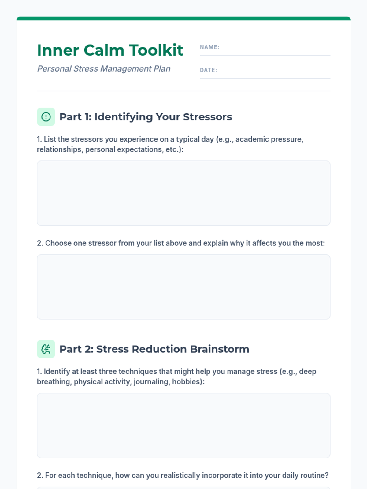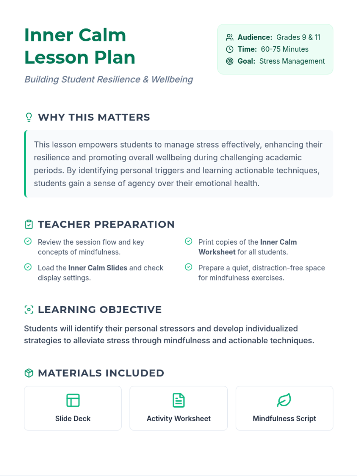 A comprehensive lesson for grades 9 and 11 focused on identifying stressors and developing personalized stress-management strategies through mindfulness and practical techniques.