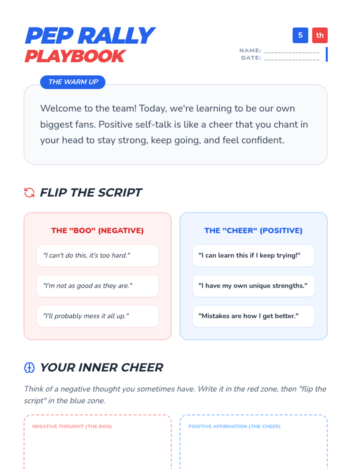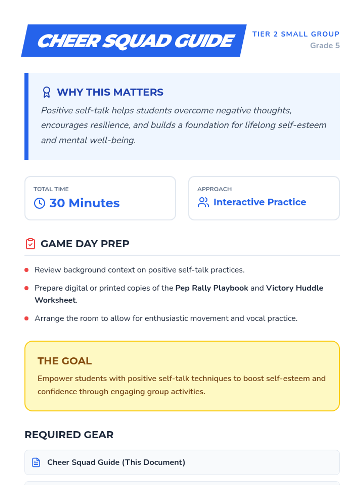 A Tier 2 small group lesson designed to empower 5th-grade students with positive self-talk strategies to boost self-esteem and resilience.
