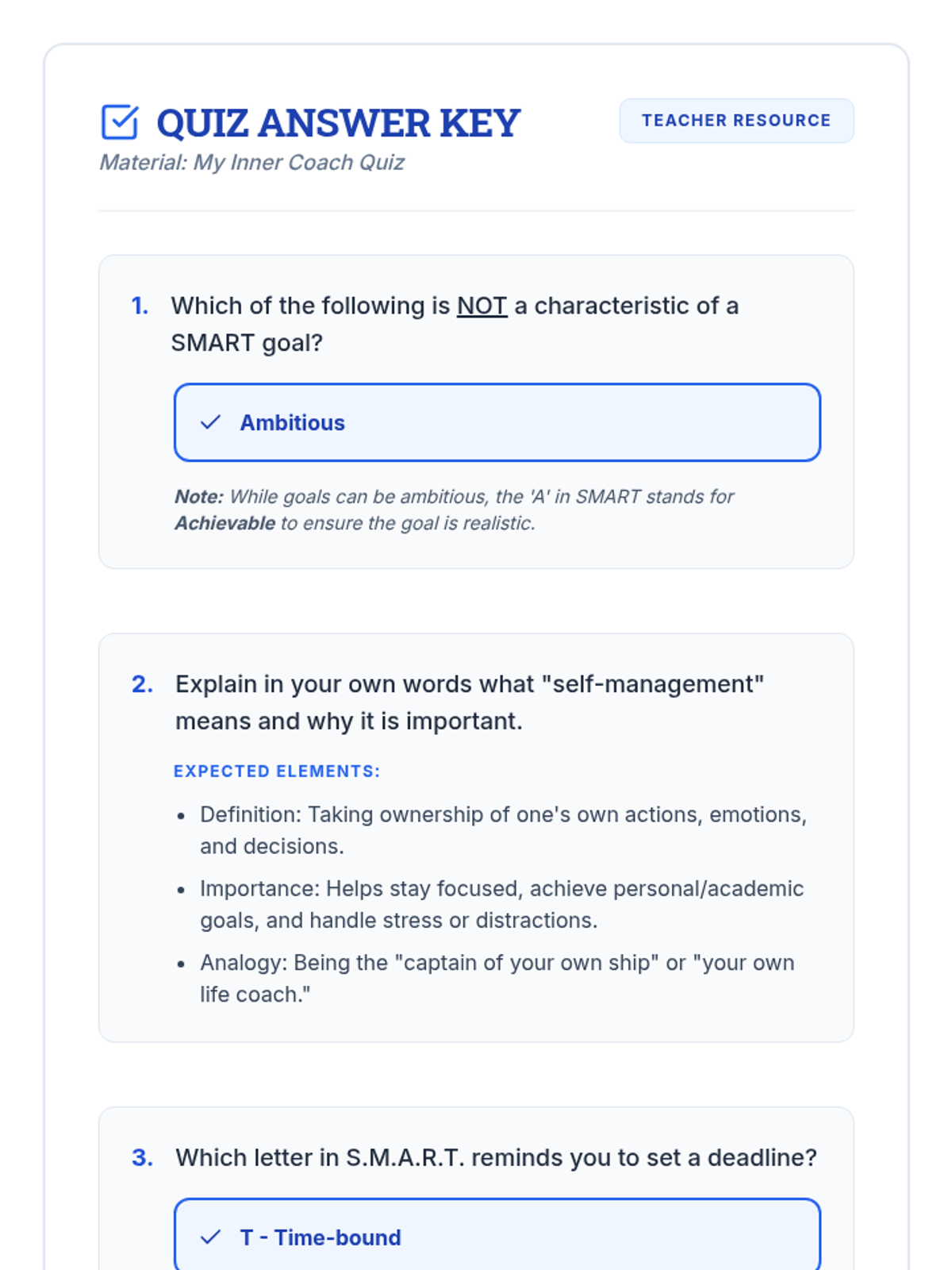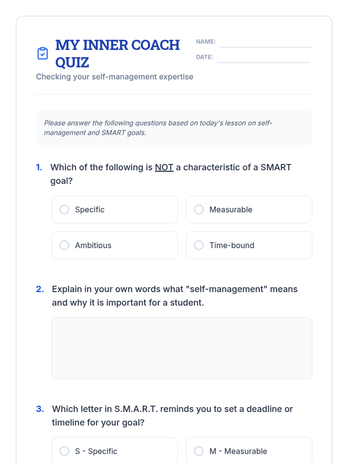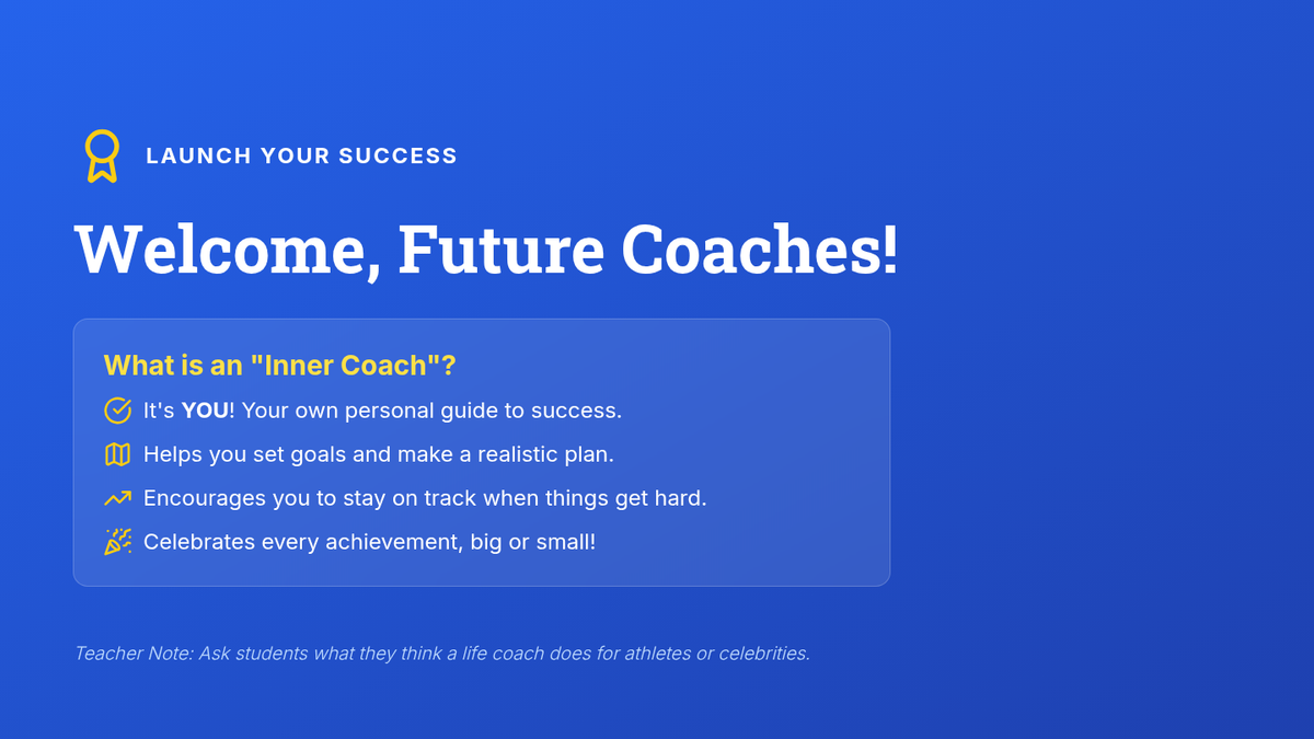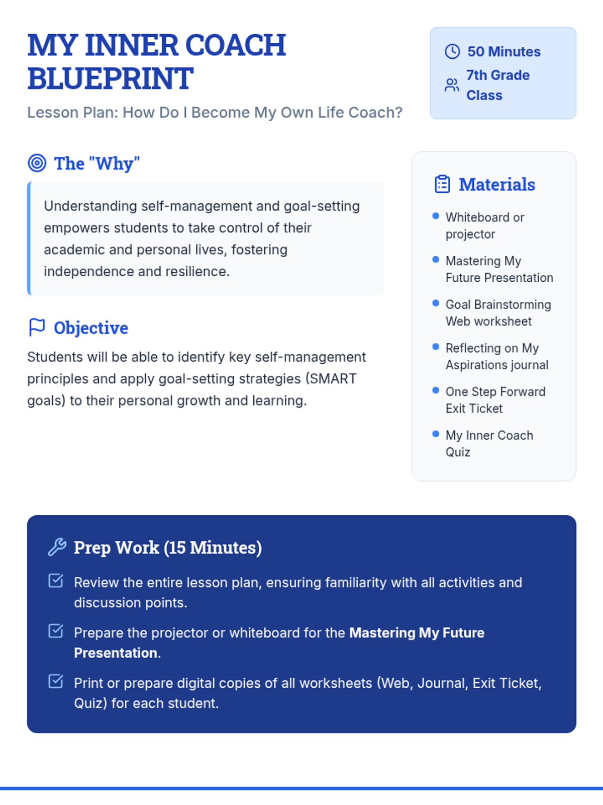 This lesson introduces 7th-grade students to self-management and goal-setting through the lens of being their own 'life coach.' Students learn SMART goal strategies and reflect on their personal aspirations.