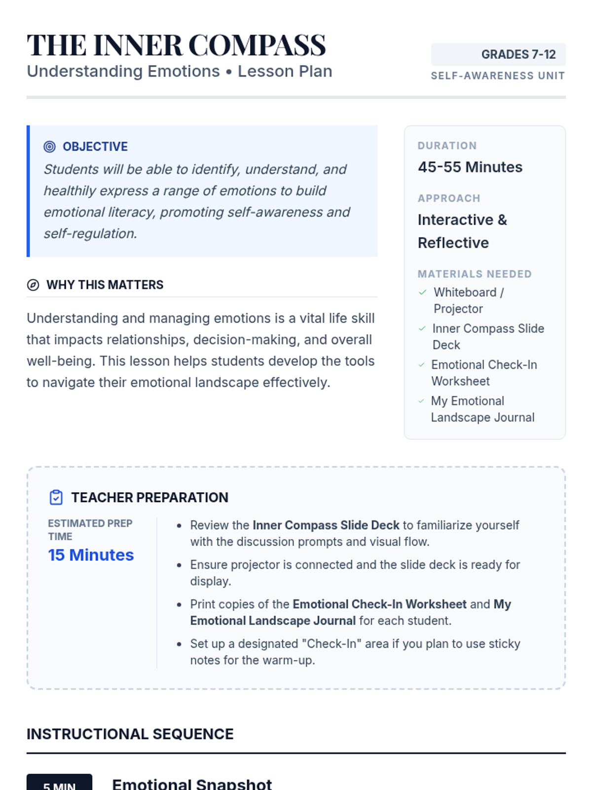 A comprehensive lesson for grades 7-12 designed to build emotional literacy by helping students identify, understand, and healthily express their emotions through the metaphor of an 'inner compass.'