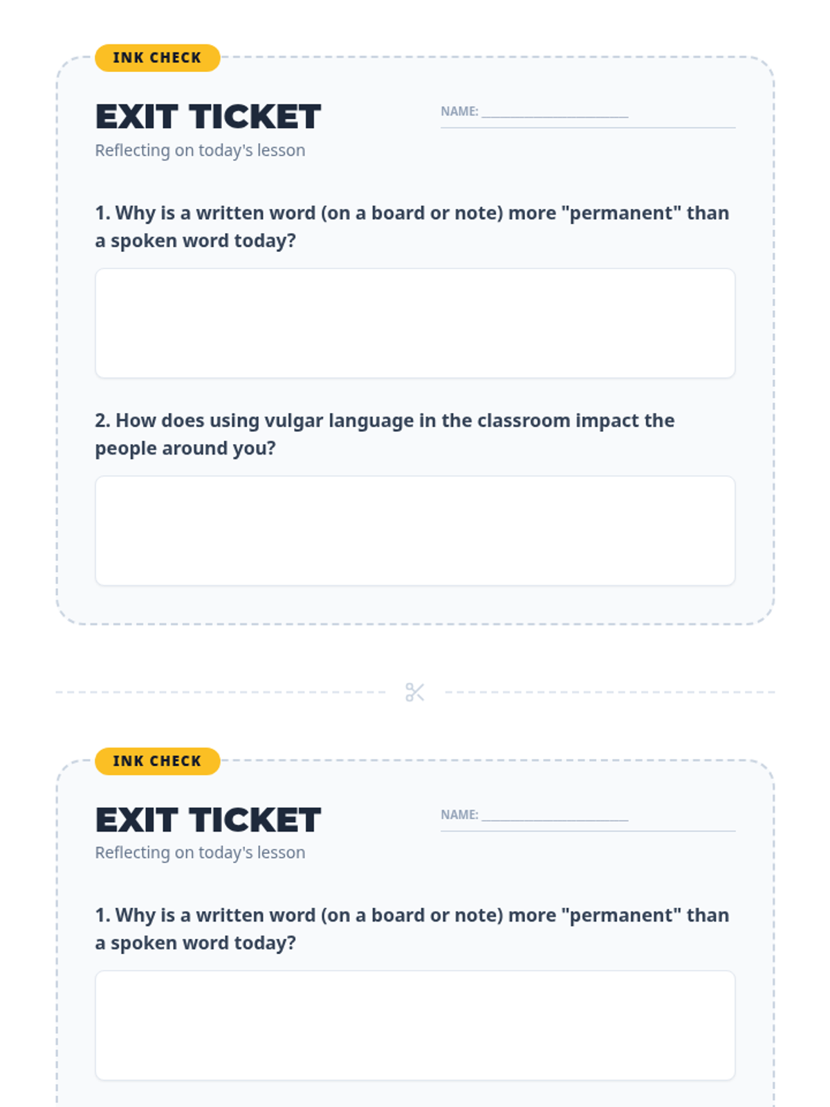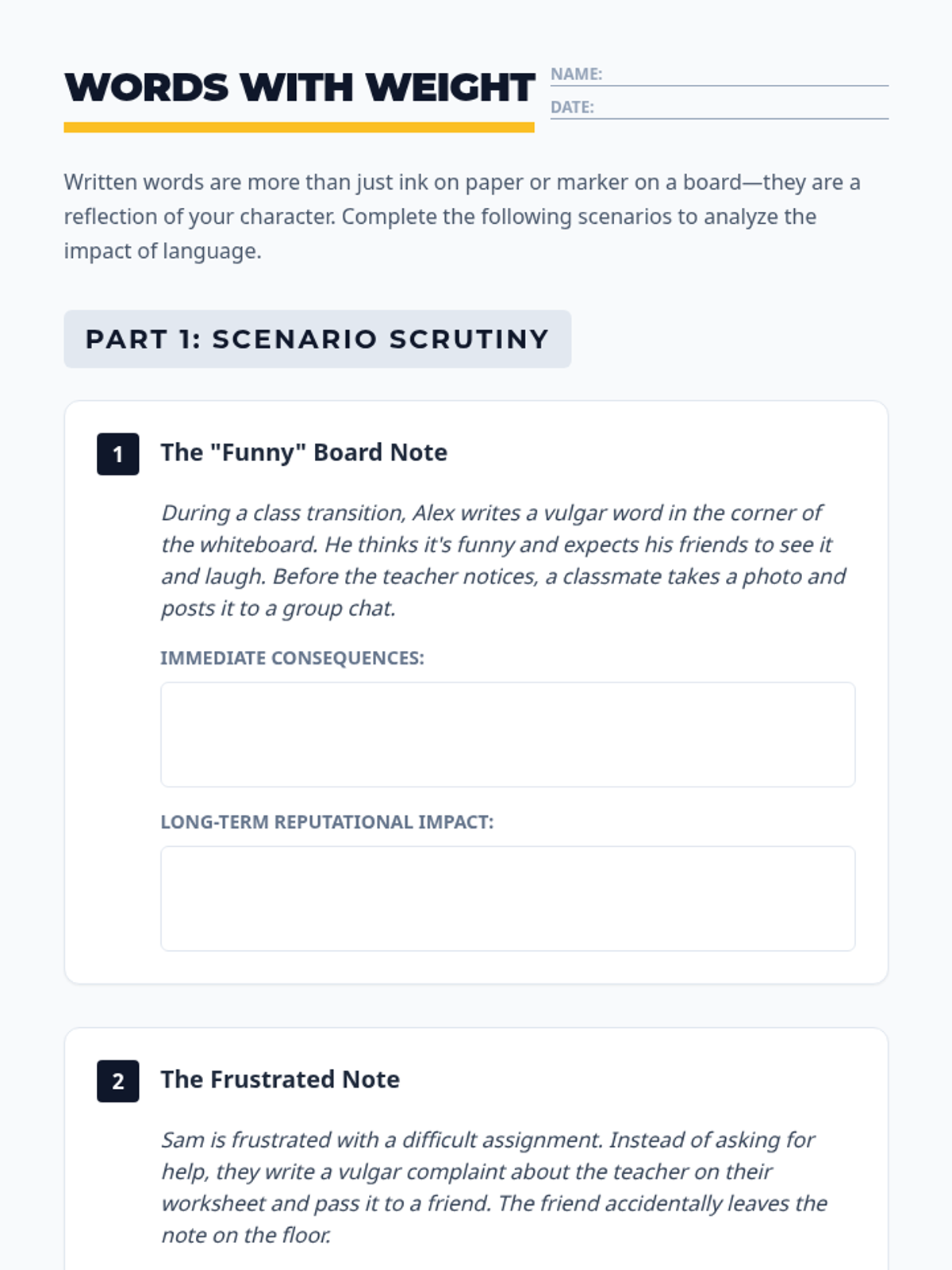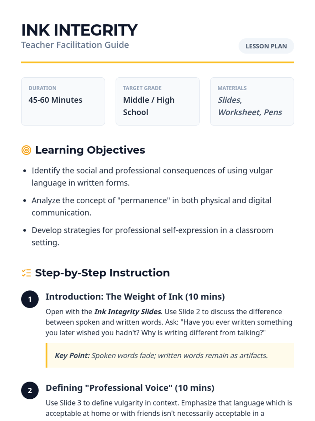 A lesson designed to help students understand the social, professional, and personal consequences of using vulgar language in written forms like notes or classroom boards, focusing on empathy and digital citizenship.