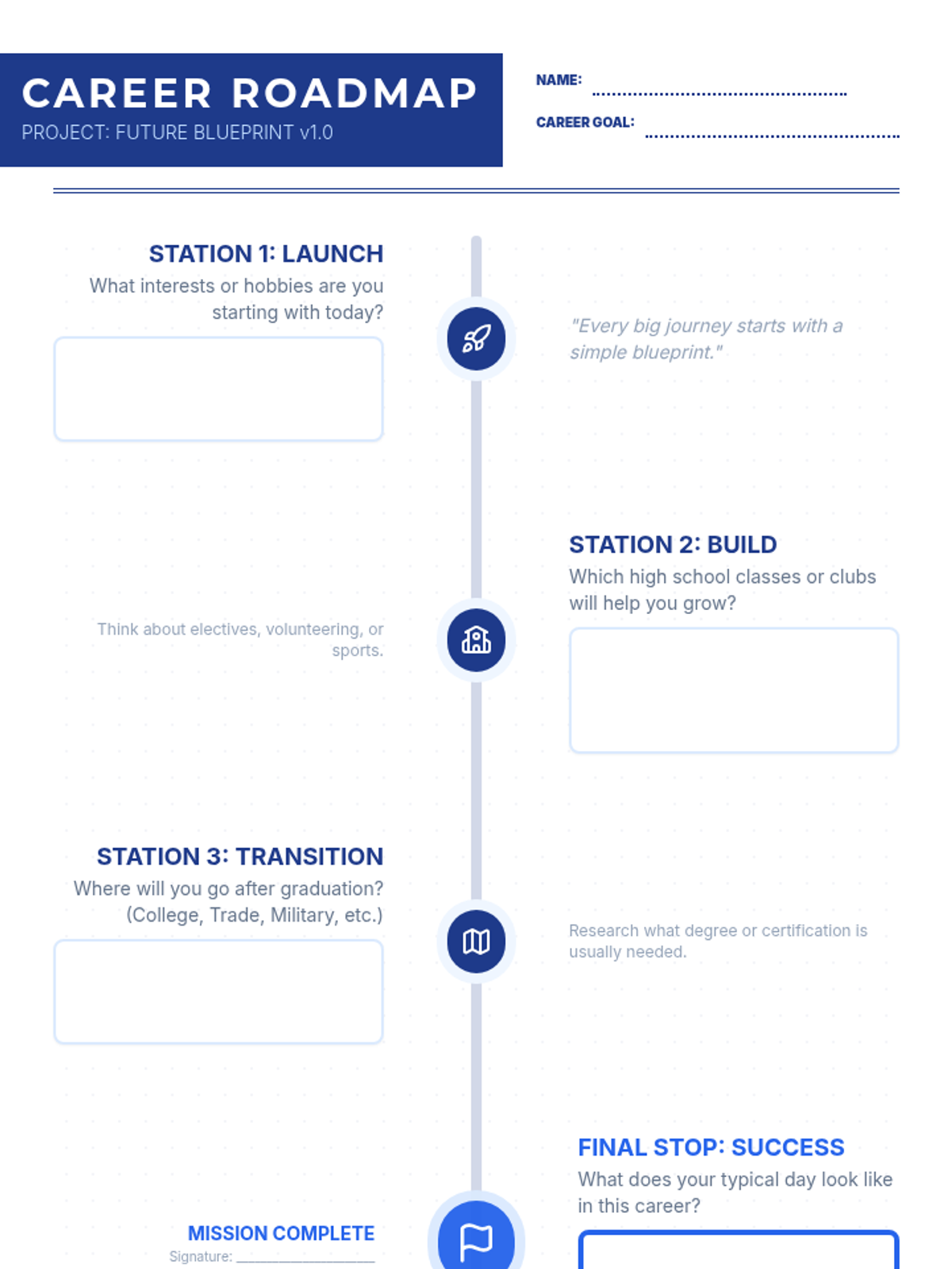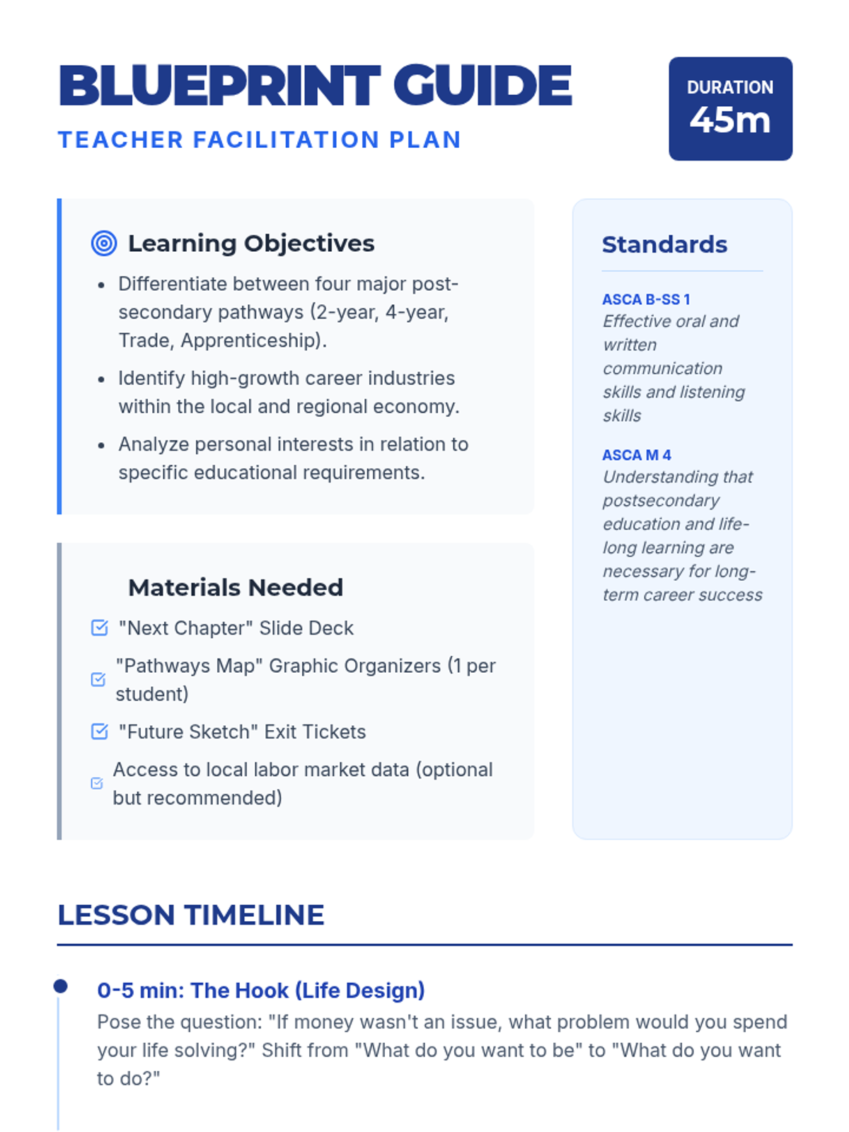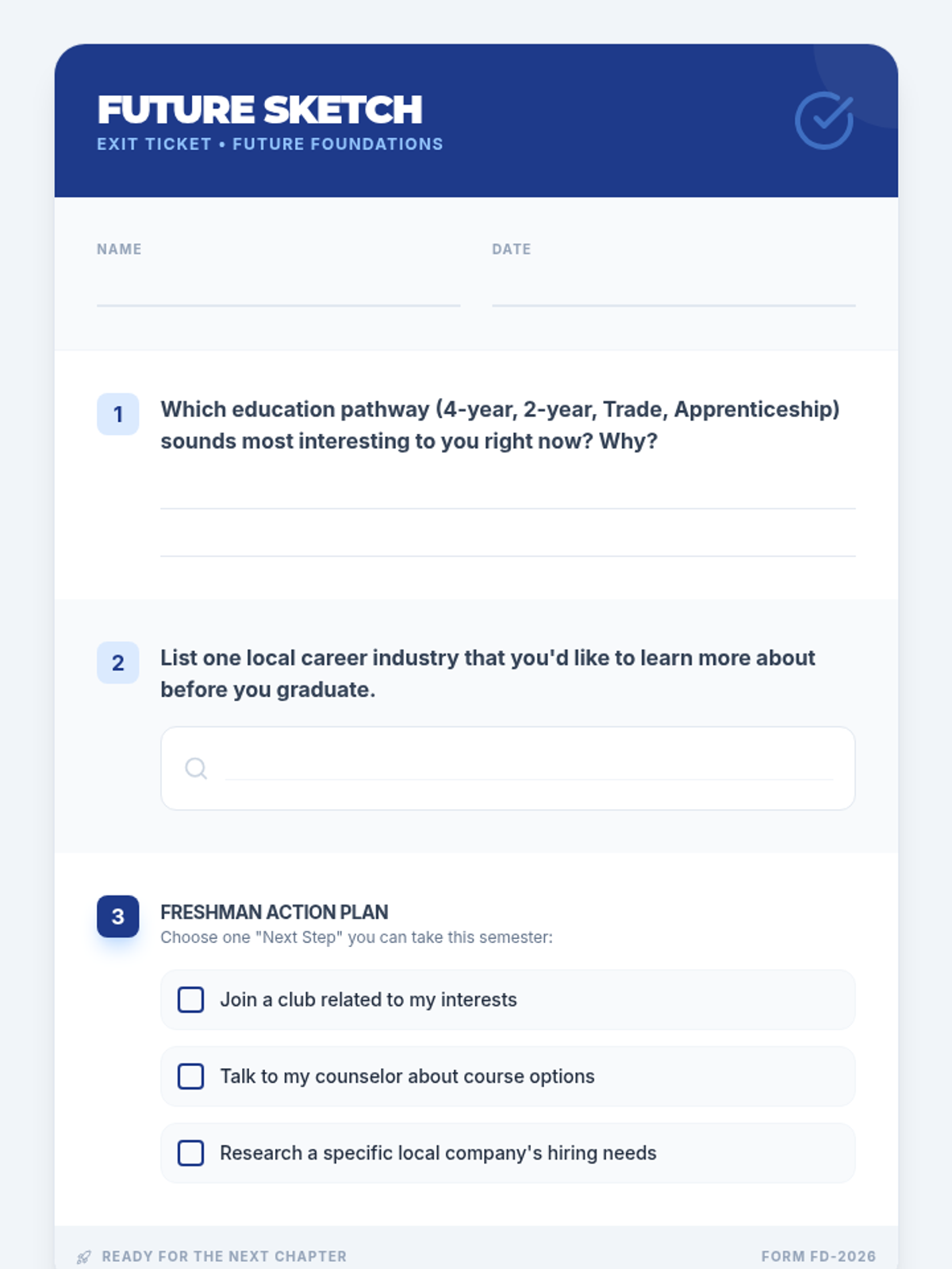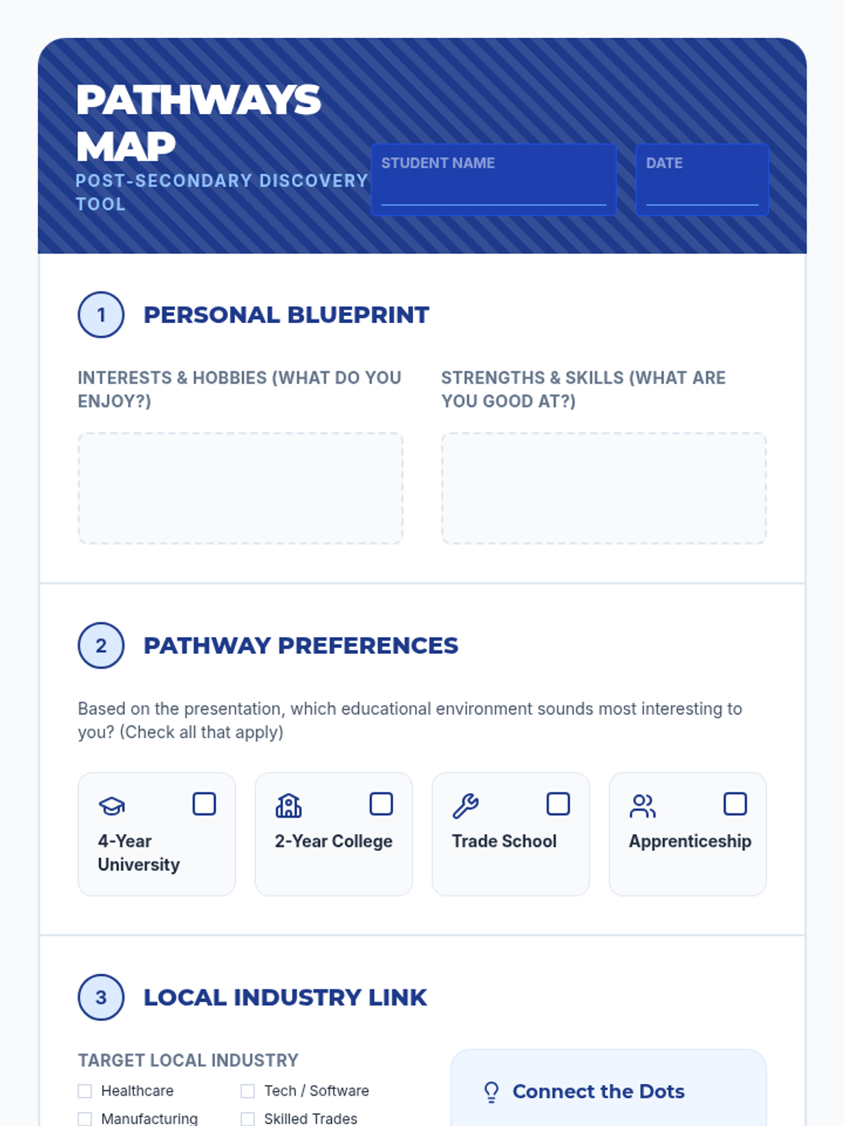 A 45-minute introductory lesson for high school freshmen to explore post-secondary education pathways and local career opportunities. Includes a guided presentation, interactive mapping, and a reflective exit ticket.