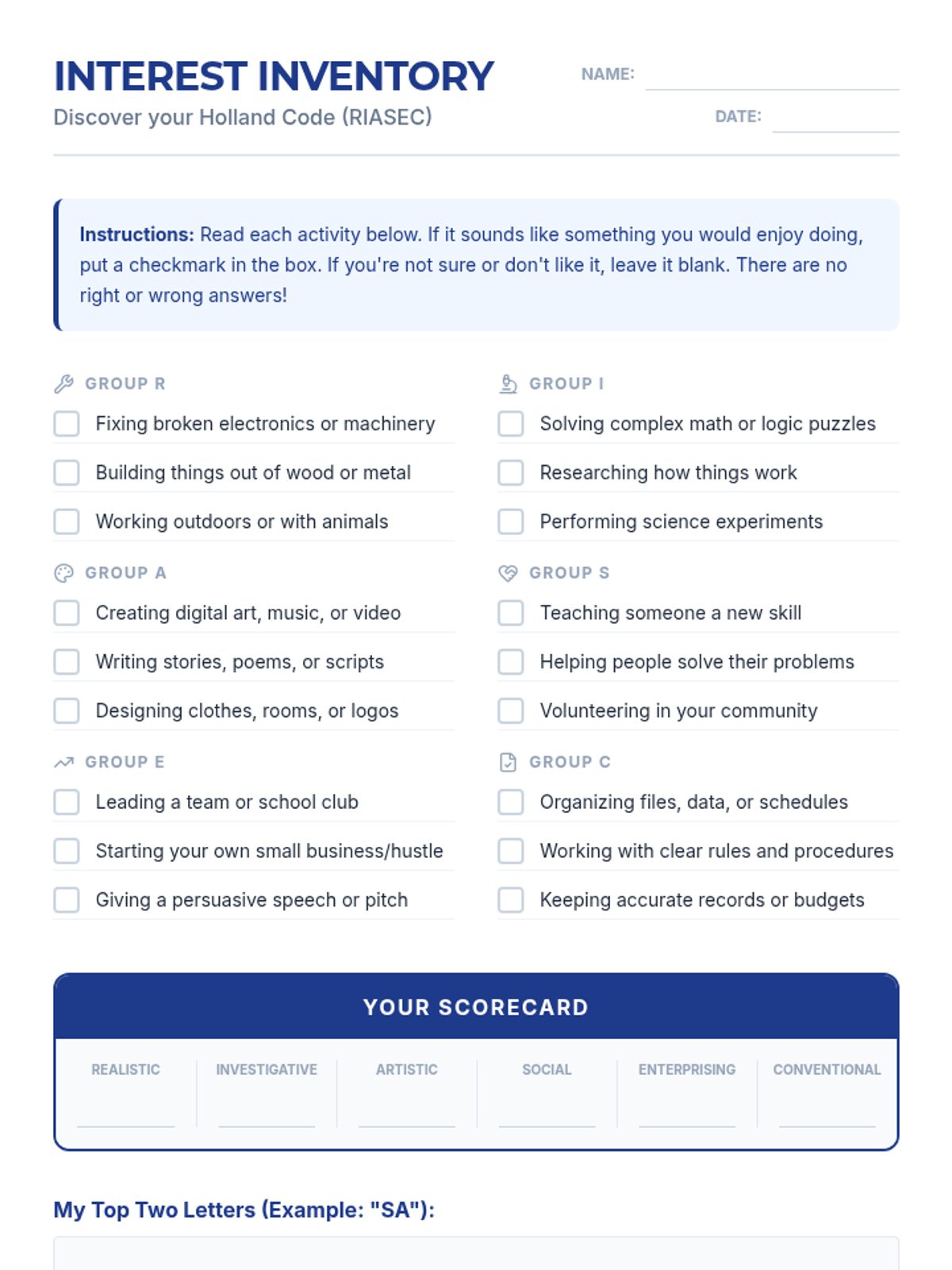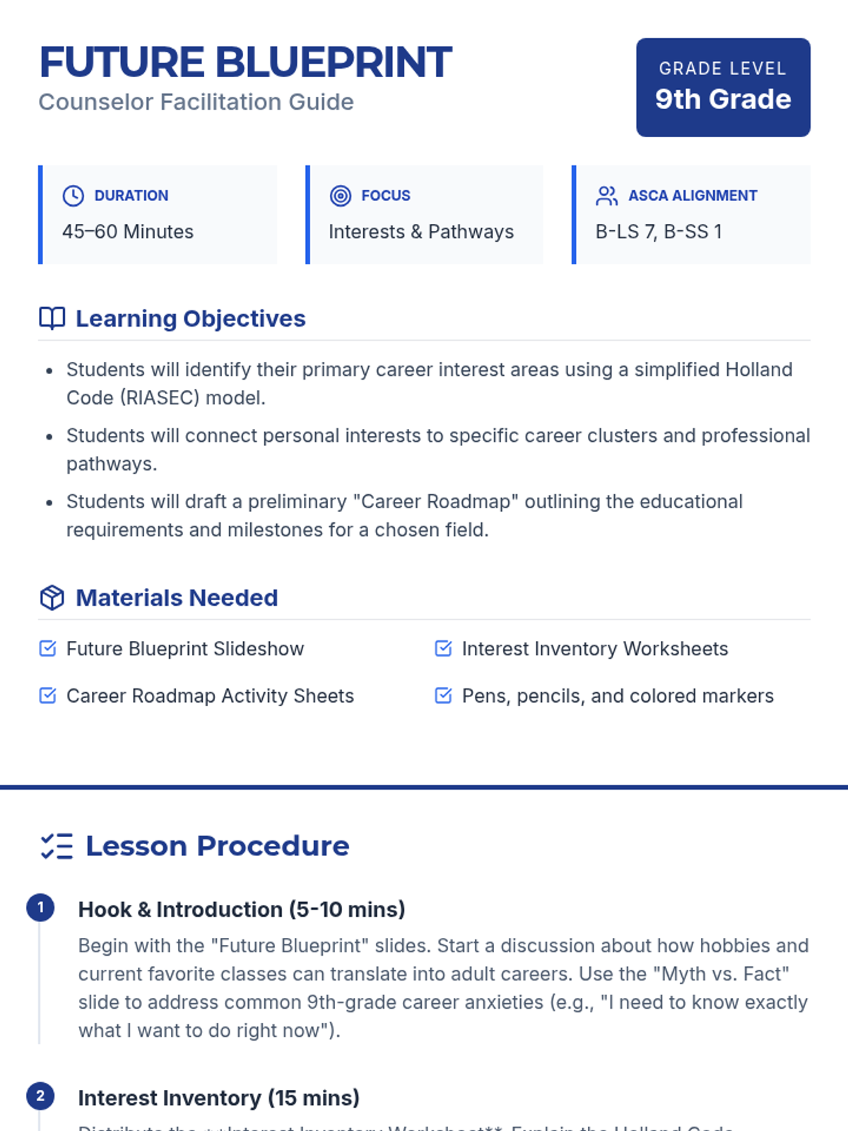 A comprehensive career exploration lesson for 9th graders focused on identifying personal interests through the Holland Code (RIASEC) model and mapping out the educational and professional steps required for their future goals.