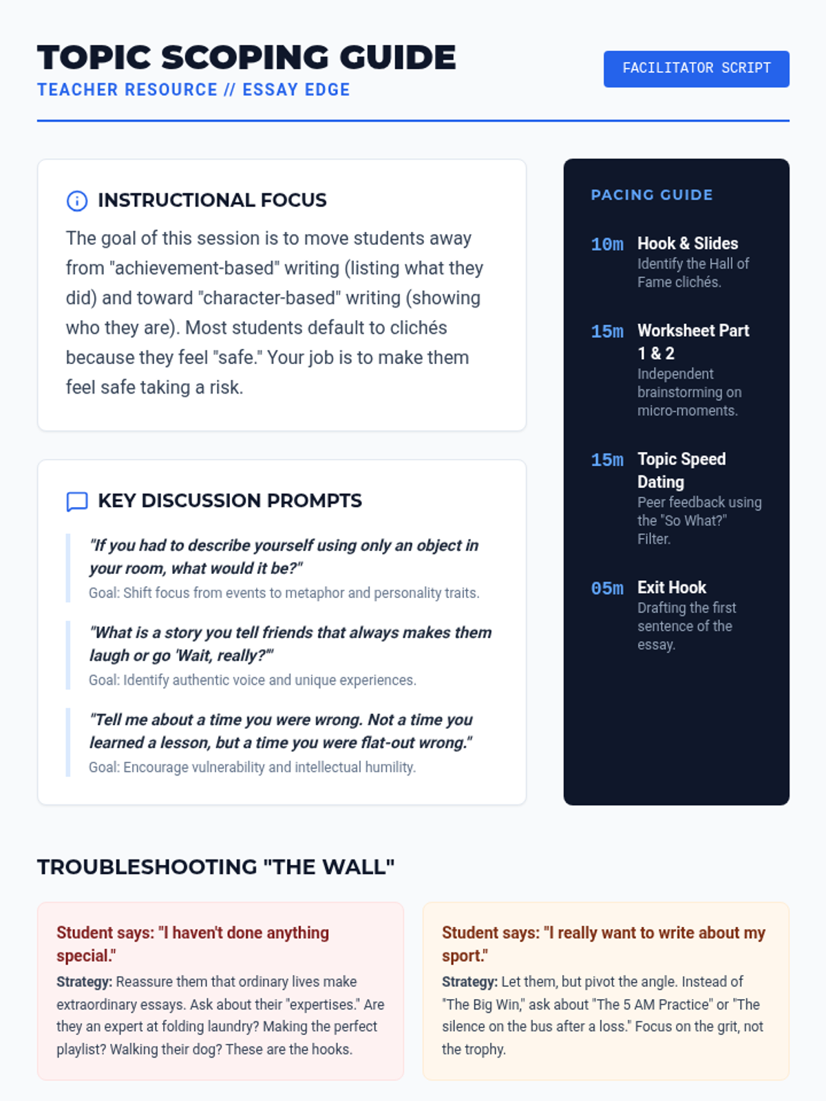 This lesson helps students navigate the complex world of college personal statements by identifying overused tropes and brainstorming unique, authentic narratives that stand out to admissions officers.