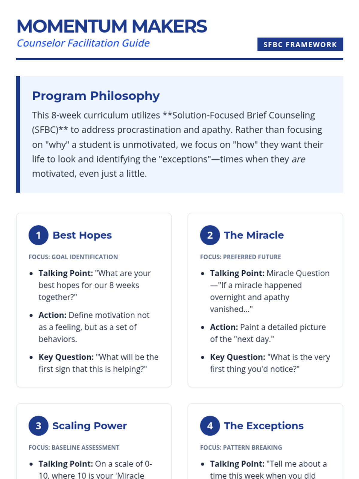 An 8-week therapeutic program using Solution-Focused Brief Counseling (SFBC) to help students overcome procrastination and apathy while building sustainable motivation.