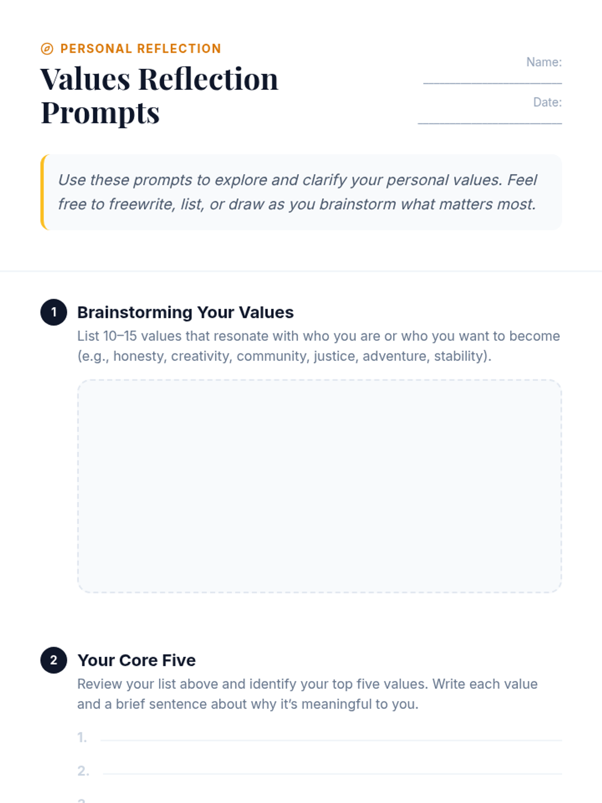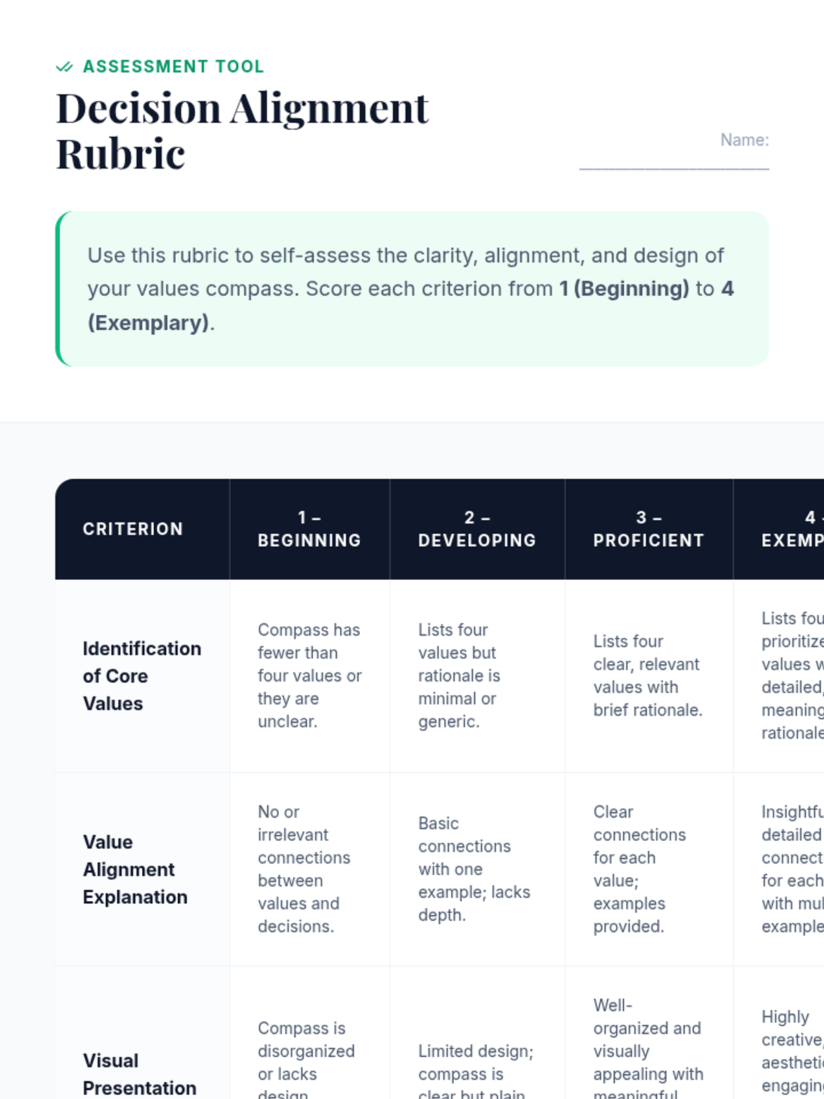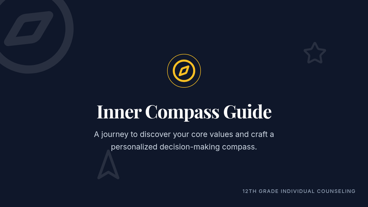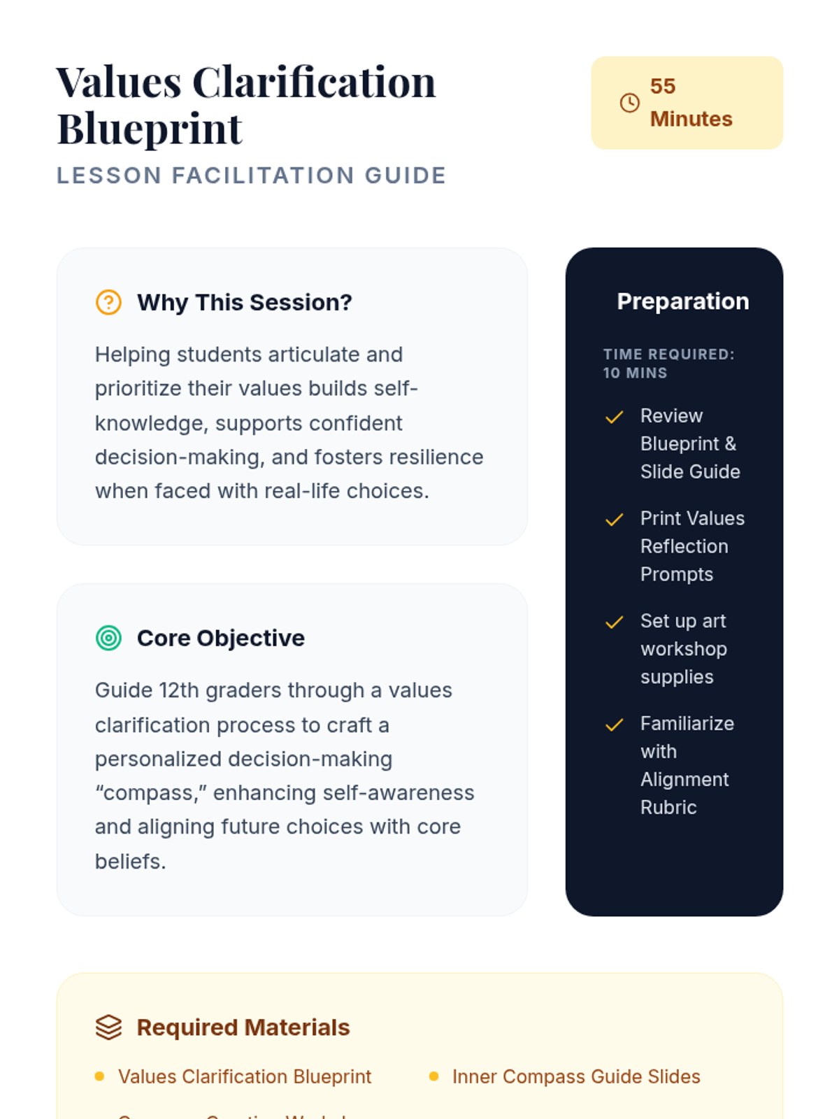 A 55-minute individual counseling session for 12th graders focused on values clarification and crafting a personal decision-making compass to align future choices with core beliefs.