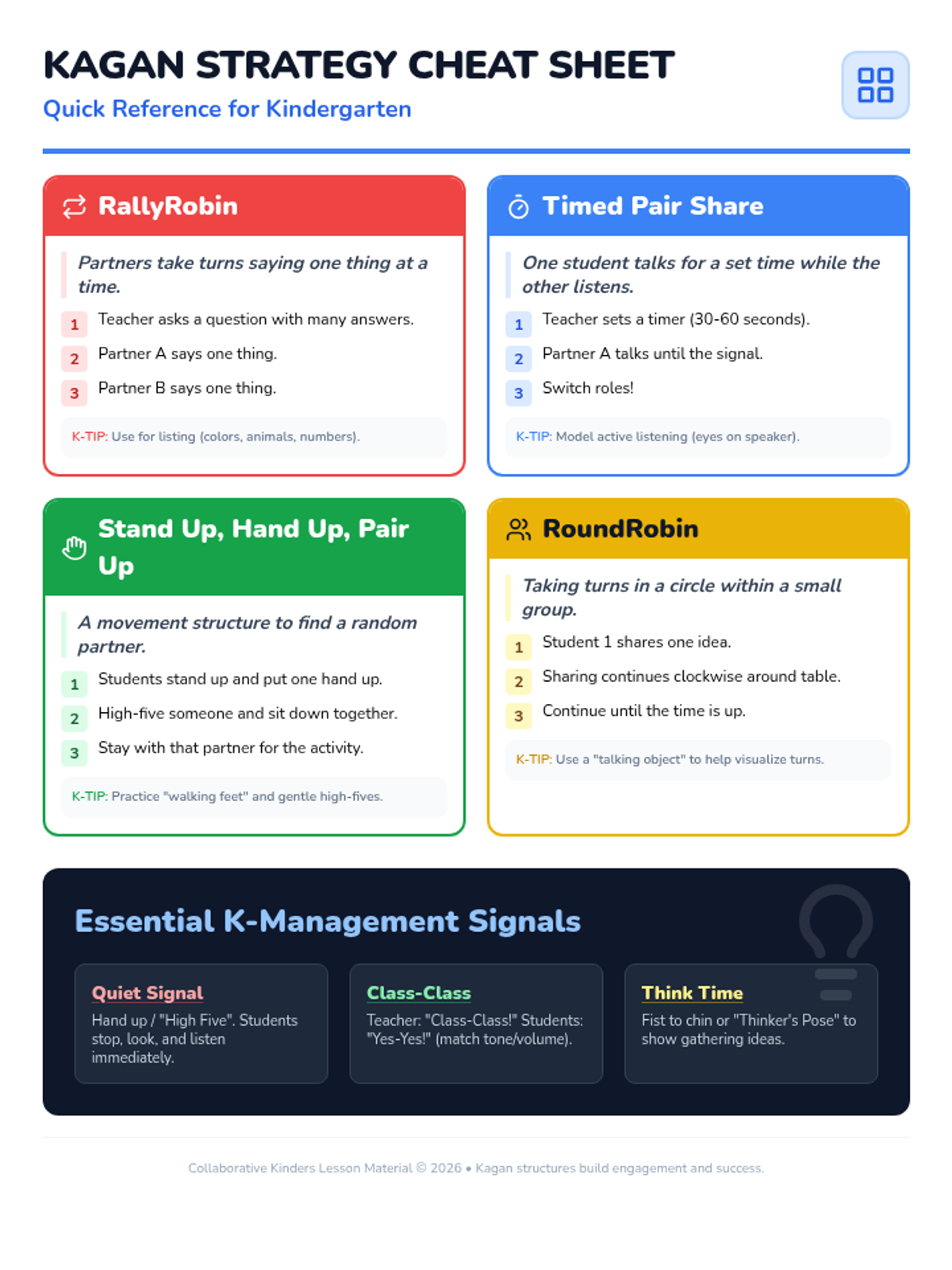 A collection of simple, movement-based collaborative learning structures tailored for kindergarten students to build social and academic skills.