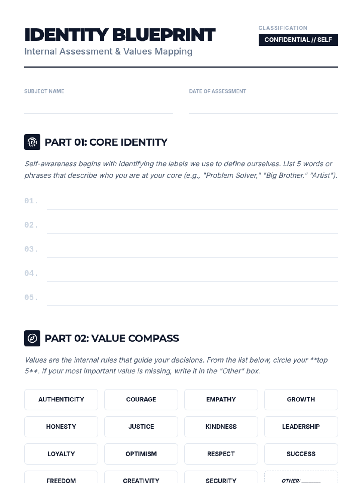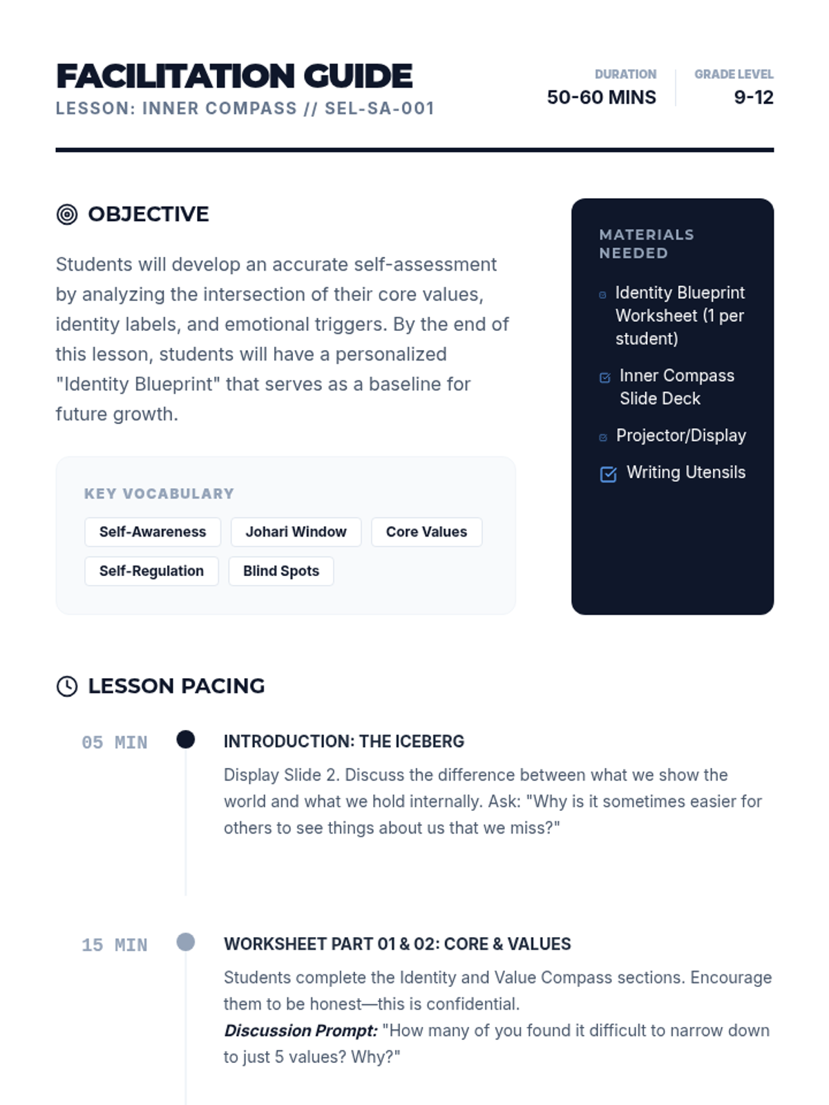 A high school SEL lesson focused on developing self-awareness through identity exploration, value alignment, and emotional intelligence mapping. Students engage in deep reflection and peer discussion to build an accurate self-assessment.