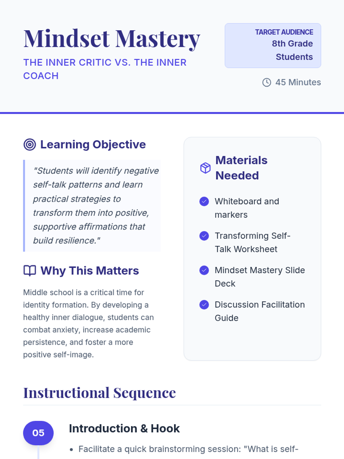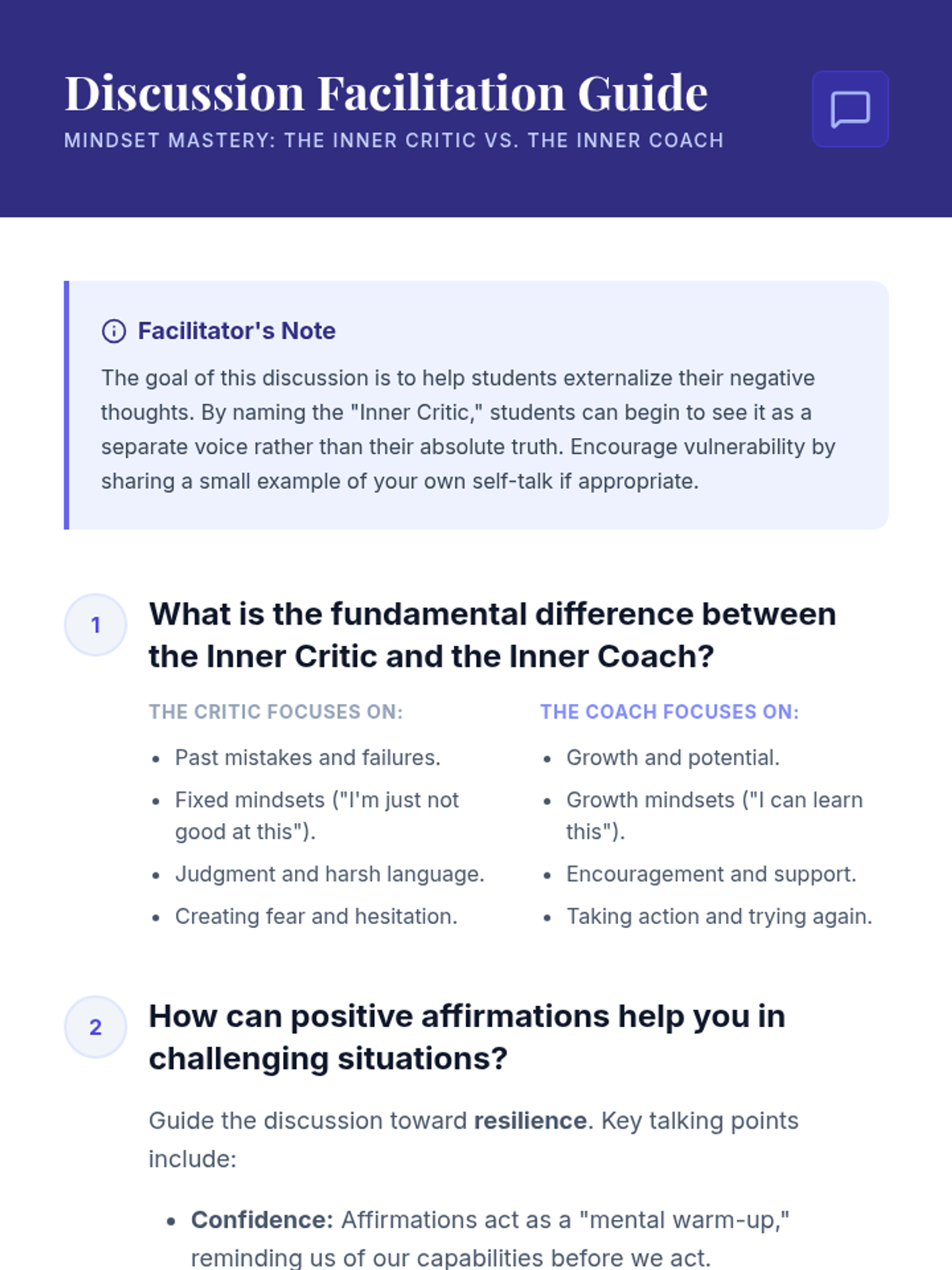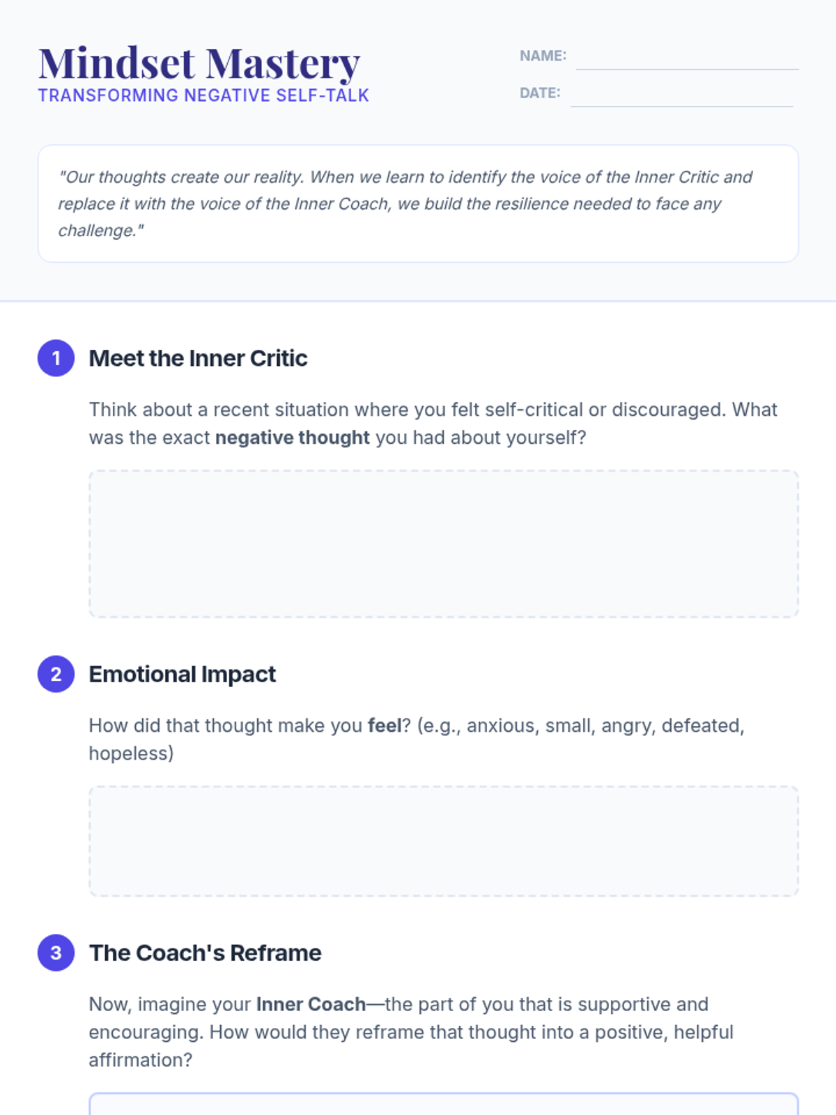Students will learn to recognize negative self-talk (the 'Inner Critic') and transform it into positive affirmations (the 'Inner Coach') to enhance self-confidence and resilience.
