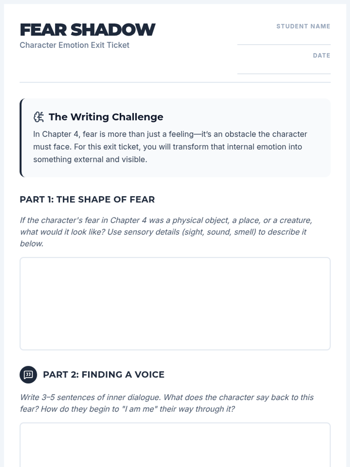 This lesson explores the themes of fear and identity in literature, focusing on character emotions. Students will analyze how fear is portrayed as an obstacle and use creative writing to explore a character's internal dialogue and resilience.