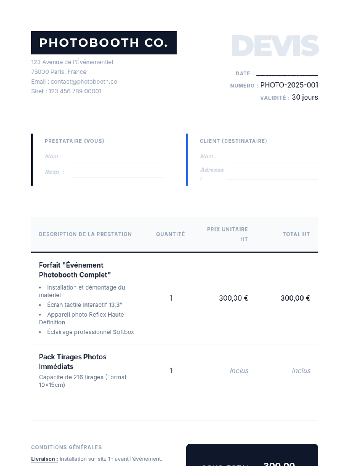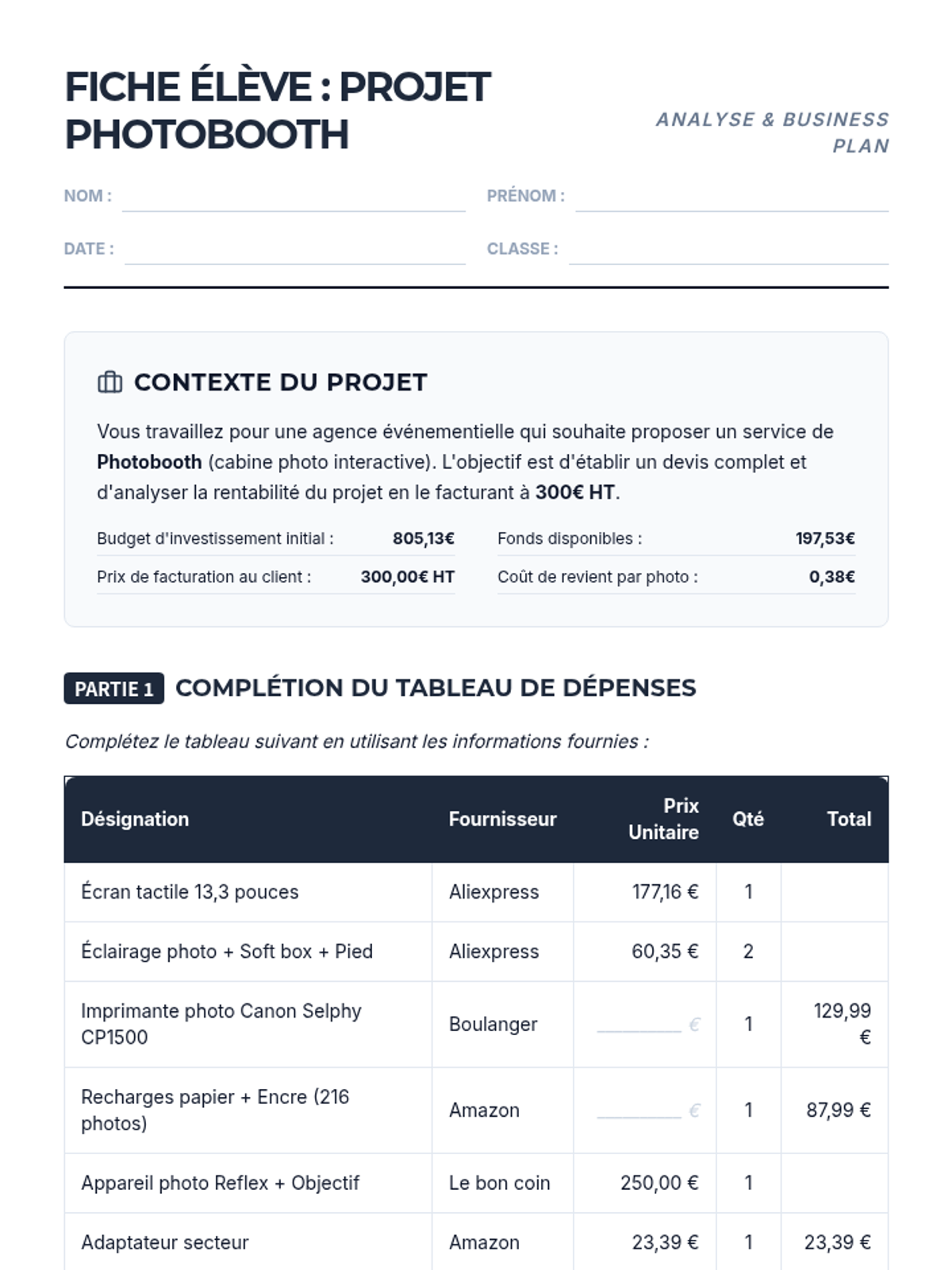 Une étude de cas pratique sur la création et l'analyse financière d'un projet de service événementiel (Photobooth). Les élèves calculent l'investissement, analysent la rentabilité et rédigent un devis professionnel.