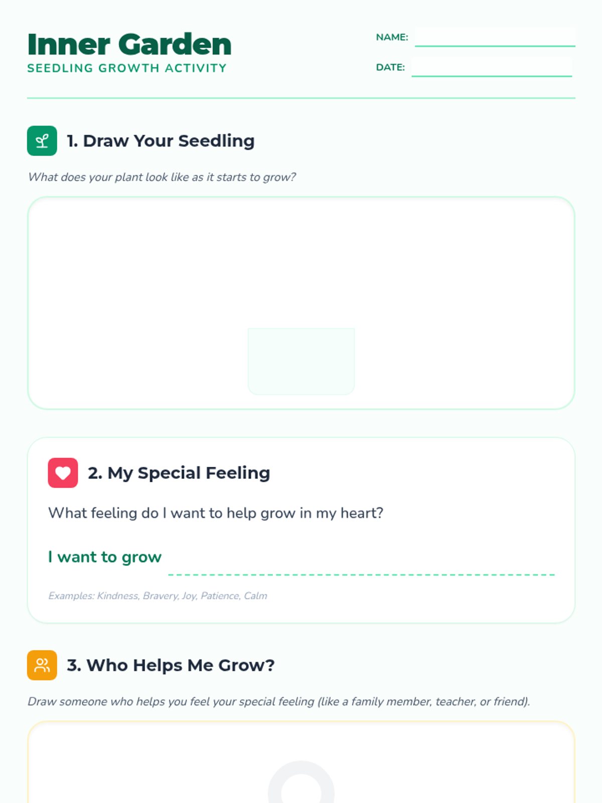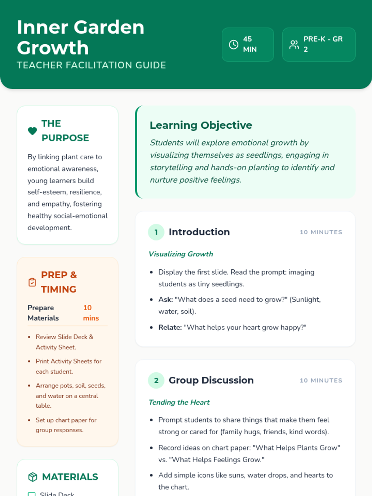 A social-emotional learning lesson for Pre-K to Grade 2 that uses the metaphor of planting seeds to explore emotional growth, resilience, and self-care.