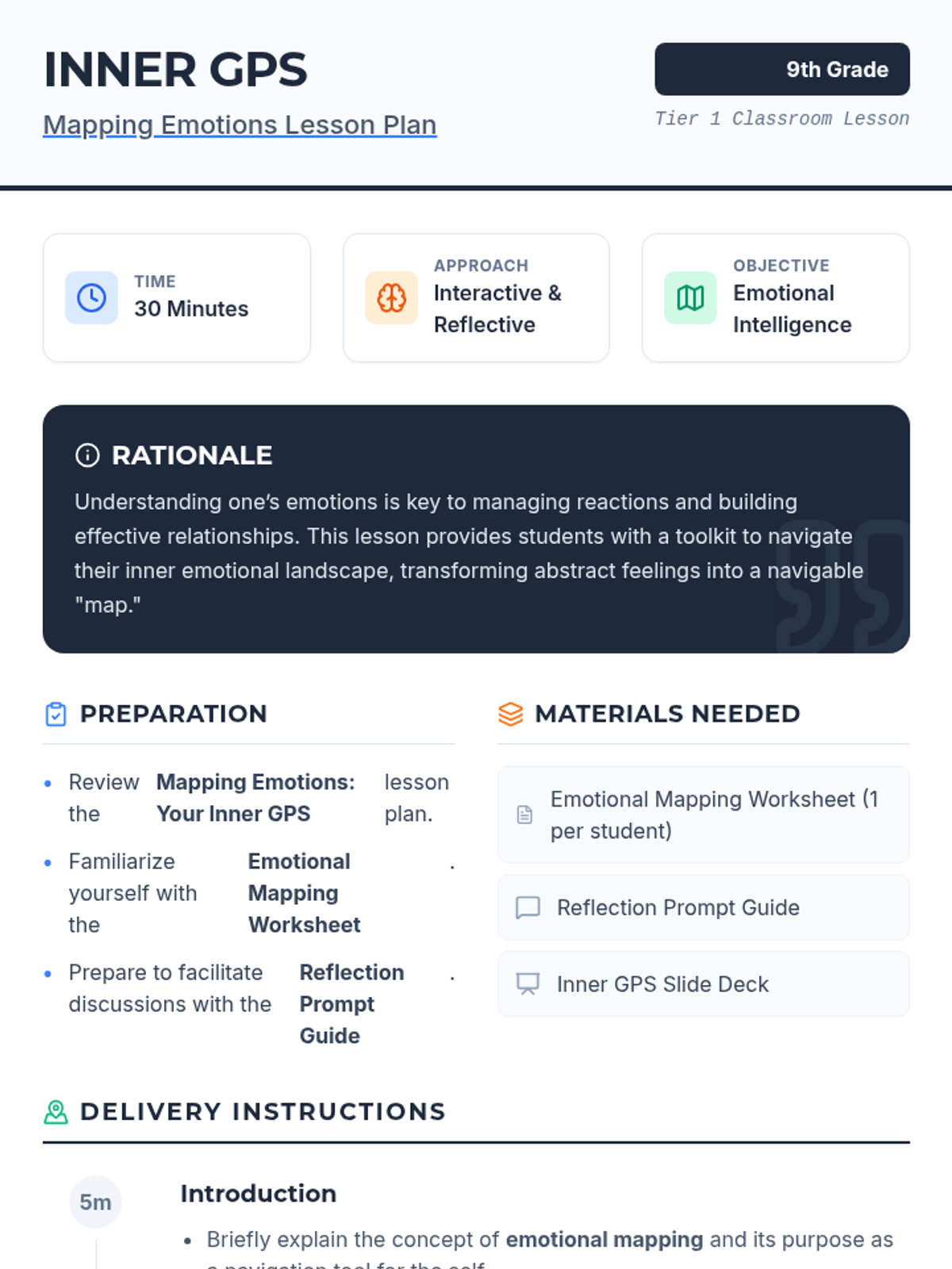 A comprehensive 9th-grade lesson introducing emotional mapping as a tool for self-awareness and emotional intelligence using a 'GPS' metaphor.