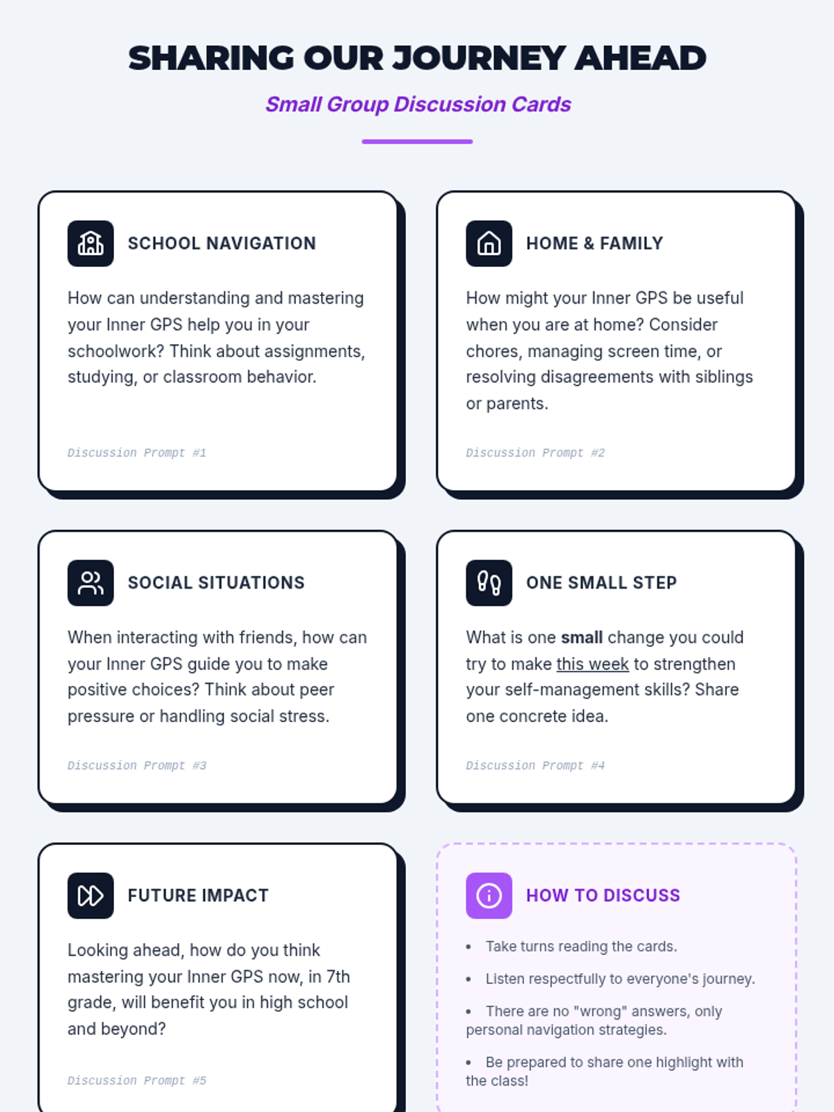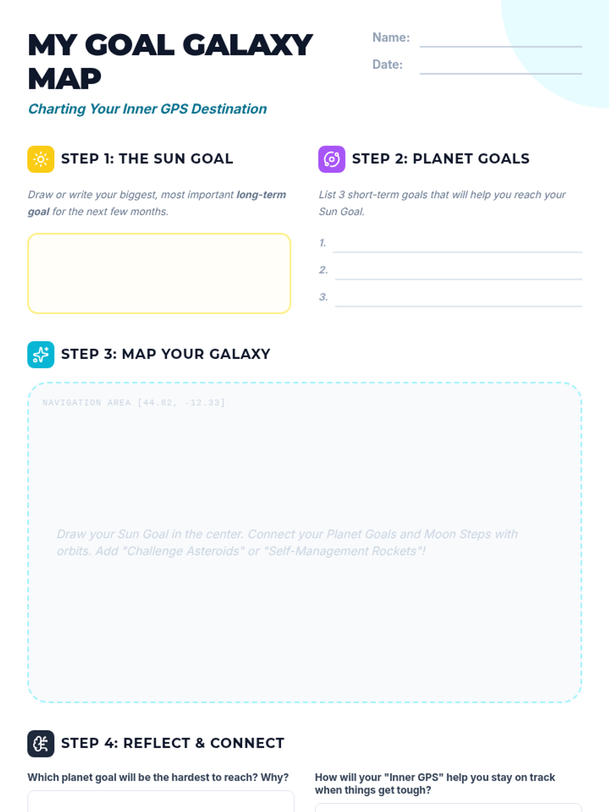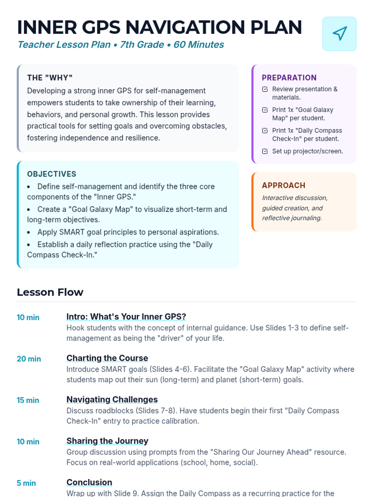 This lesson empowers 7th-grade students to master self-management through the metaphor of an 'Inner GPS,' covering self-awareness, goal setting, and self-control. Students will create a visual 'Goal Galaxy' and learn daily reflection techniques to stay on course toward their personal destinations.