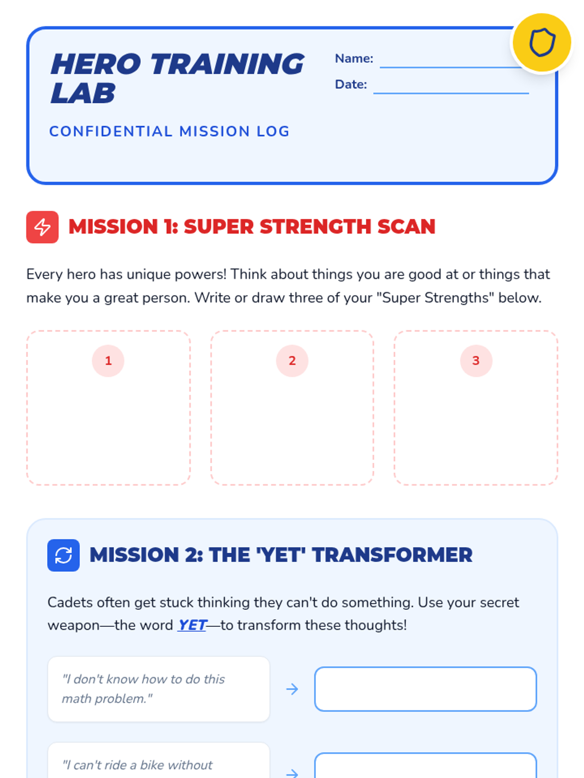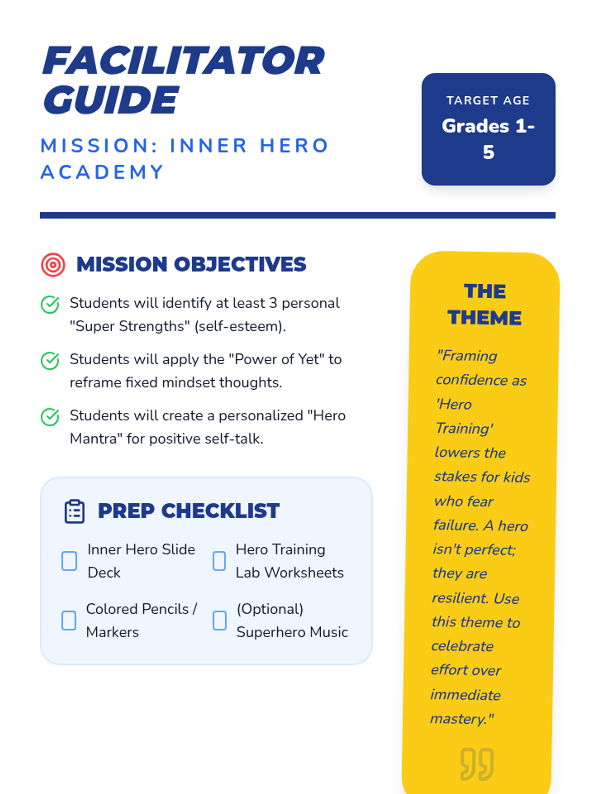 A comprehensive lesson designed to help students build self-esteem, embrace the growth mindset of 'trying,' and master the art of positive self-talk through a 'Superhero Academy' theme.