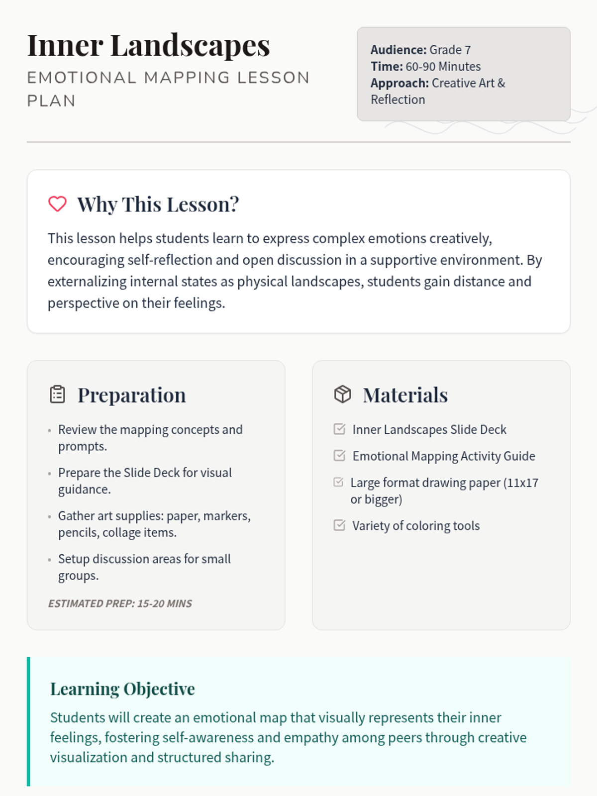 A creative Grade 7 lesson where students visualize their emotions as a topographical landscape, fostering self-awareness and empathy through artistic mapping and reflection.
