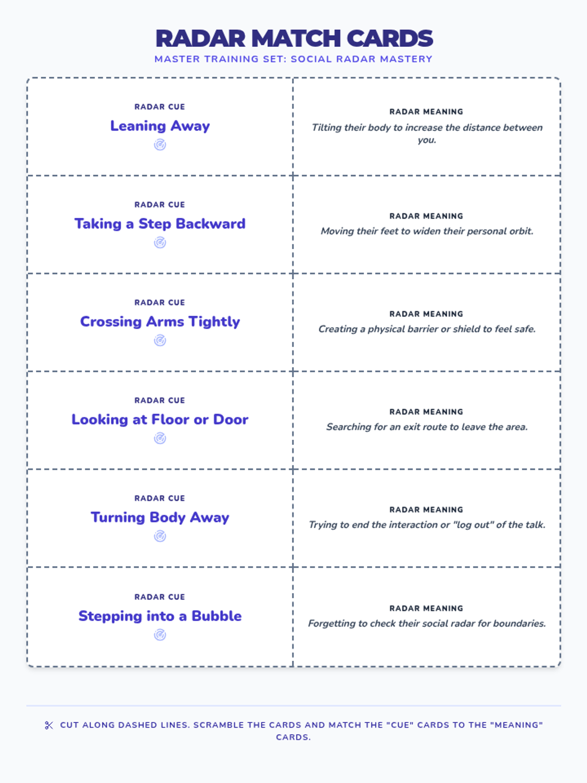 Students learn to identify personal space boundaries using 'social radar' cues and practice assertive, polite verbal language to protect their own space and respect others'.