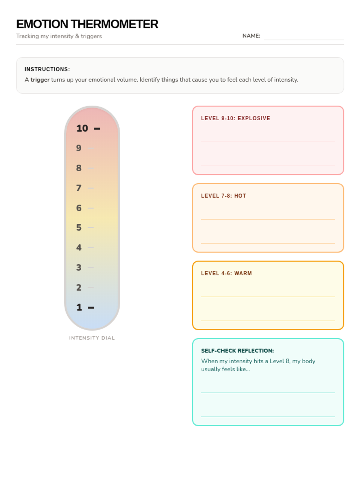 Exploring the intensity of emotions and identifying personal 'triggers' using an emotion thermometer.