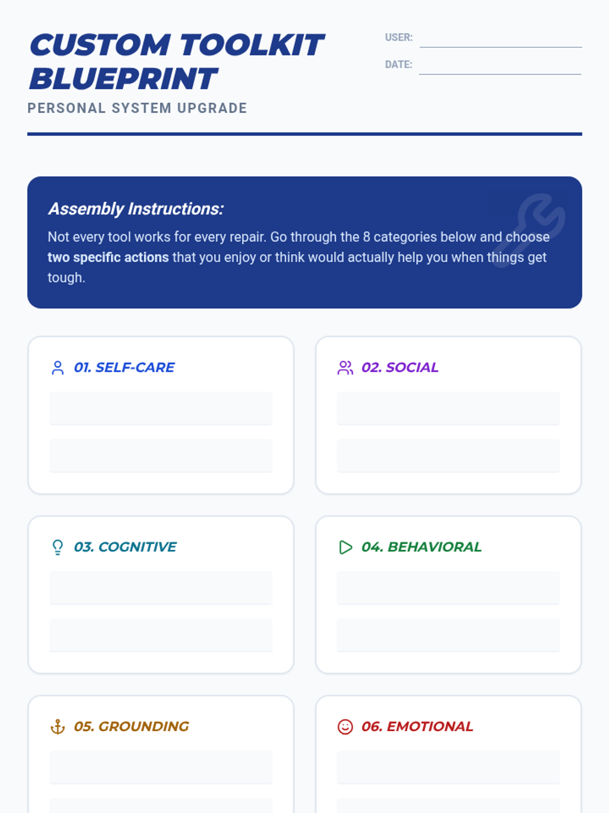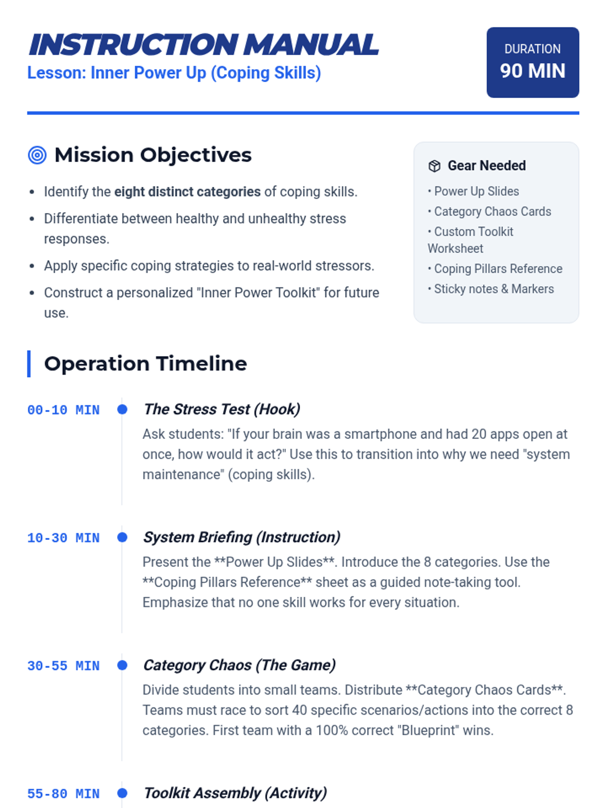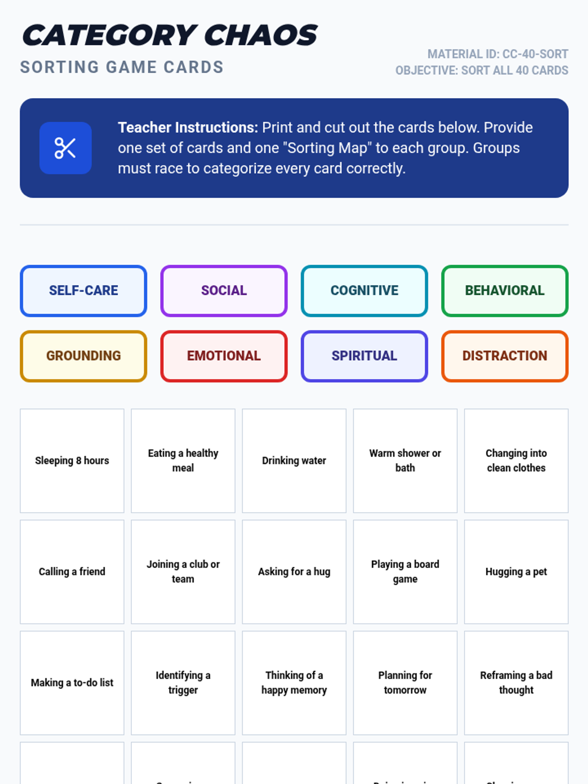 A comprehensive 90-minute lesson exploring eight essential coping skill categories: self-care, social, cognitive, behavioral, grounding, emotional, spiritual, and distraction. Includes interactive slides, a fast-paced sorting game, and personal toolkit creation.