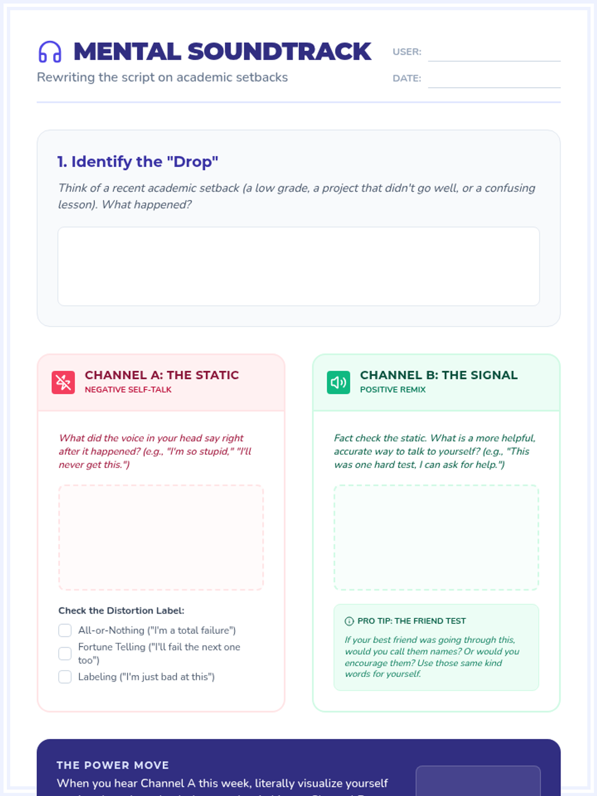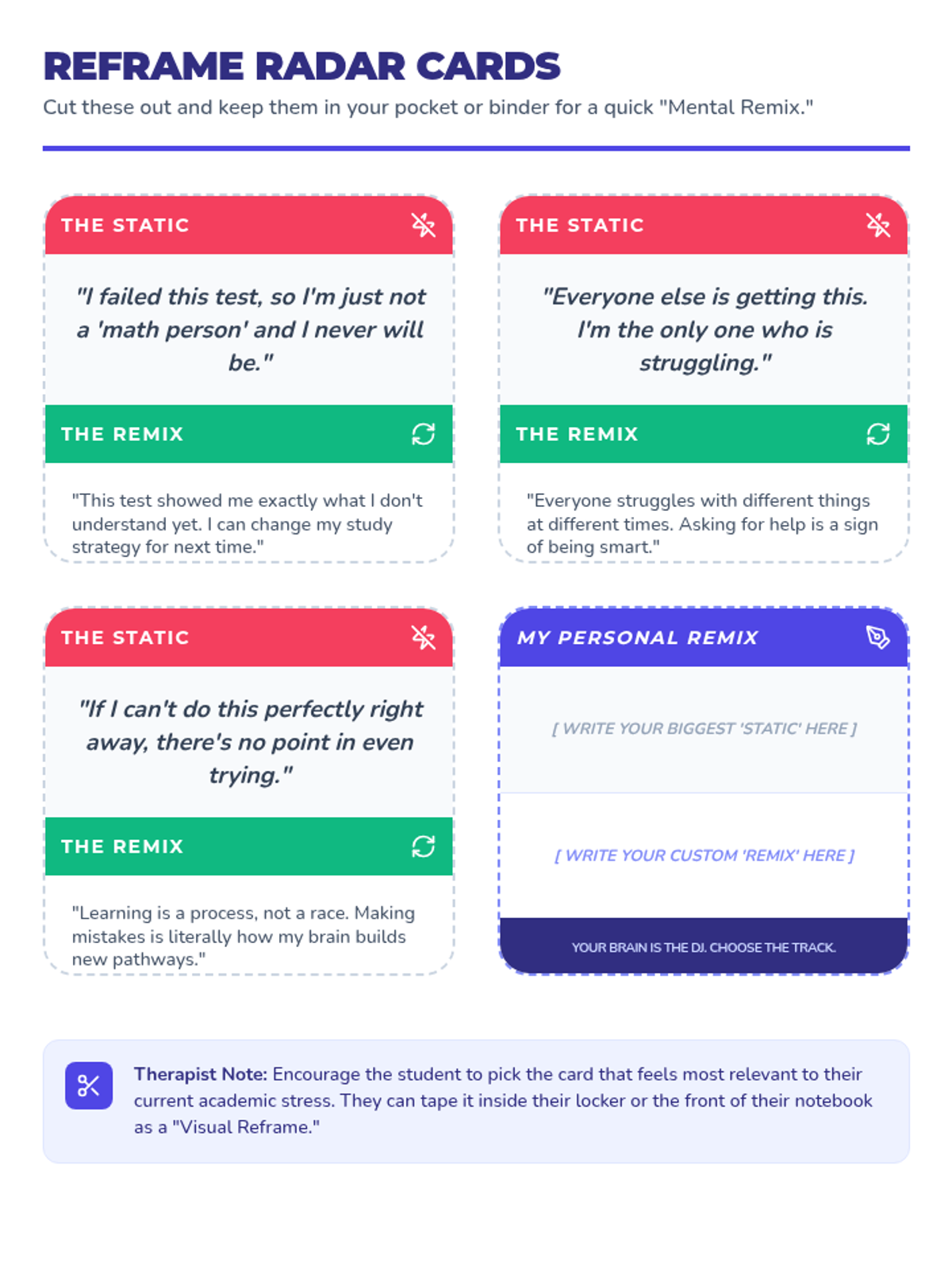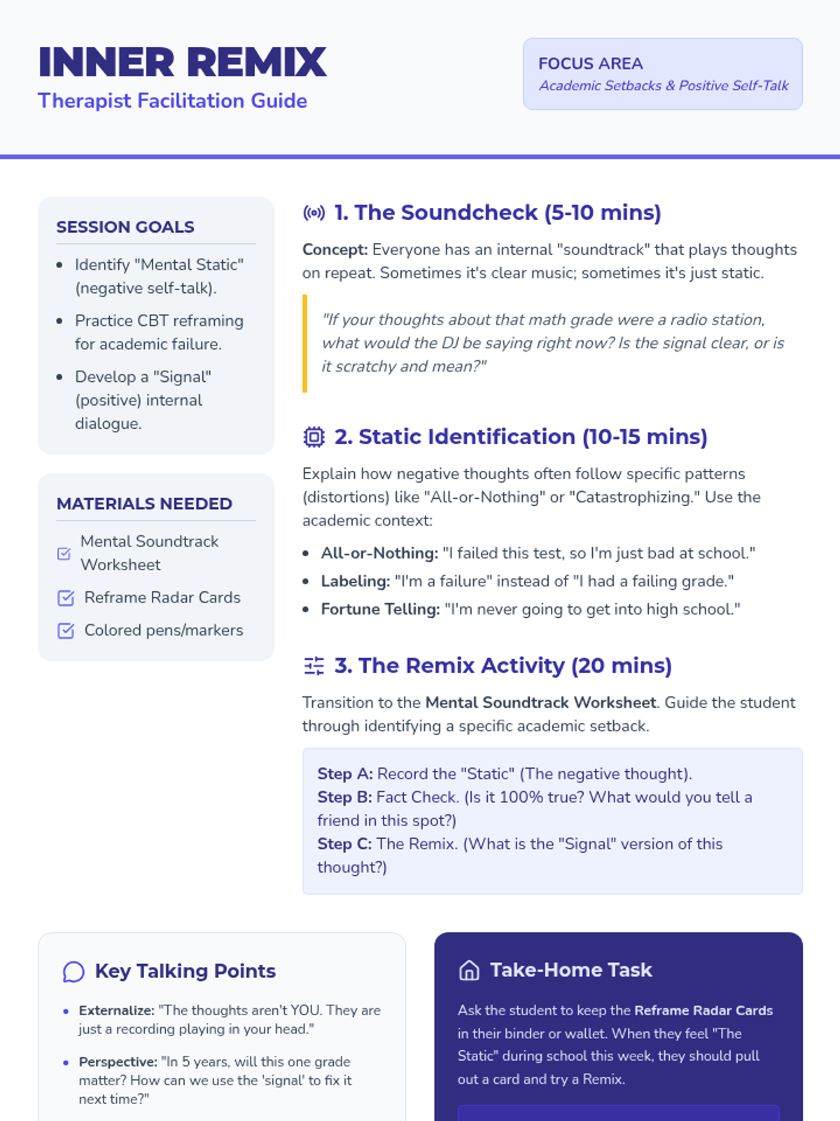 A structured individual therapy session for 8th graders to identify negative self-talk patterns and develop positive reframing strategies, specifically focused on academic setbacks and failures.