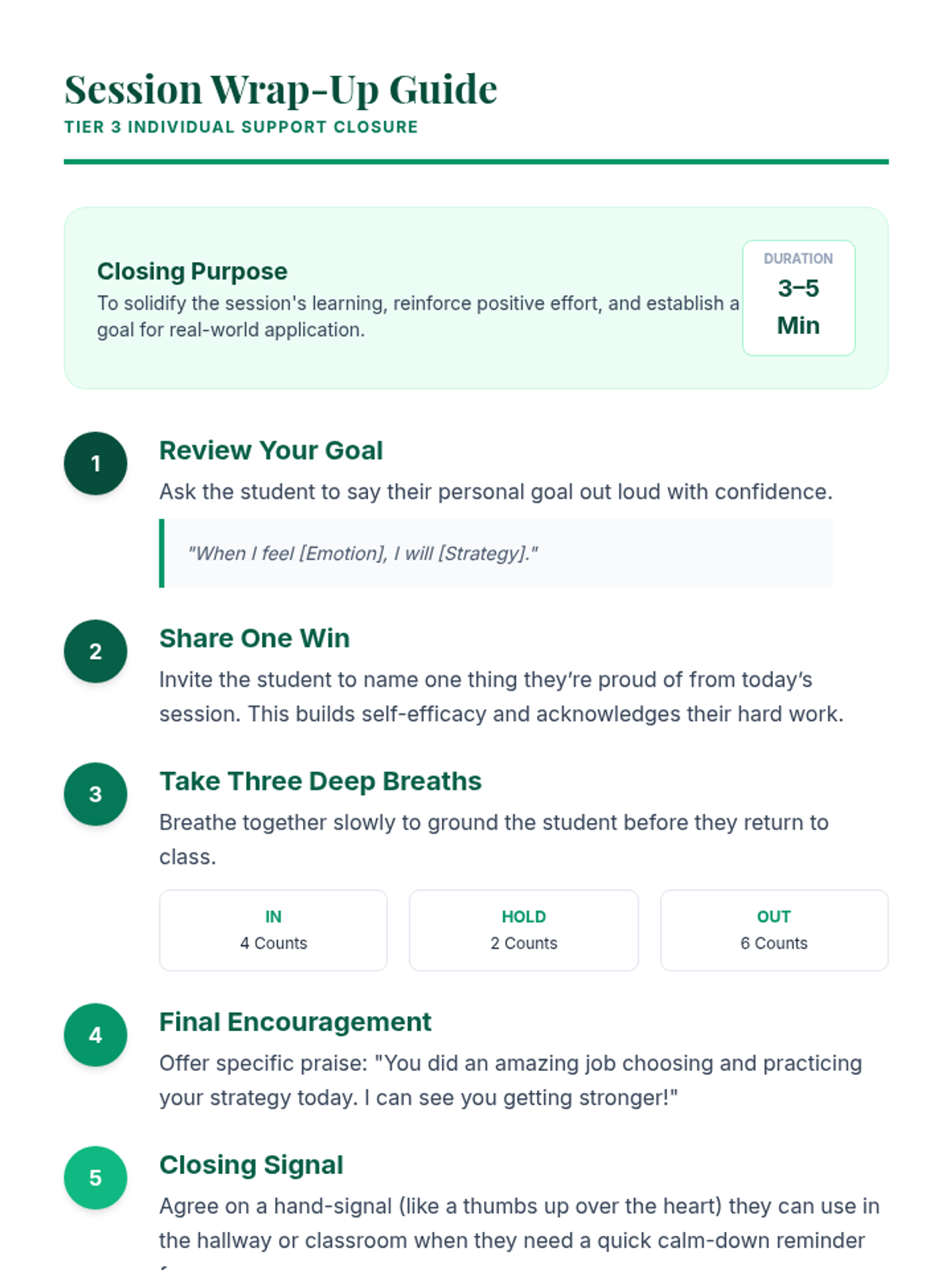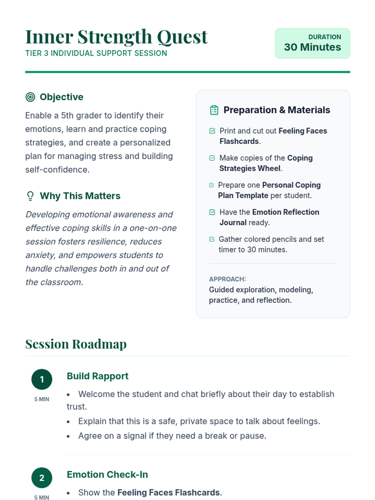 A 30-minute individual Tier 3 session for 5th graders to explore emotional awareness and develop personalized coping strategies to build resilience.